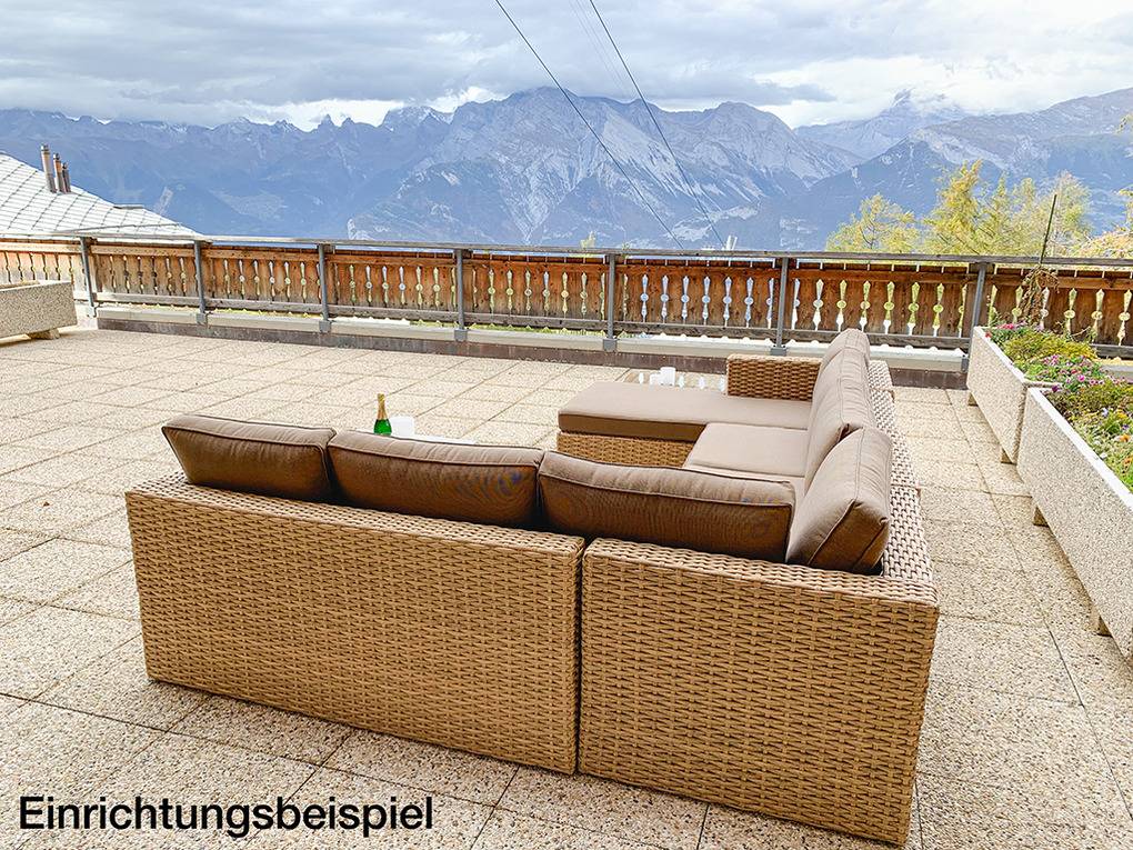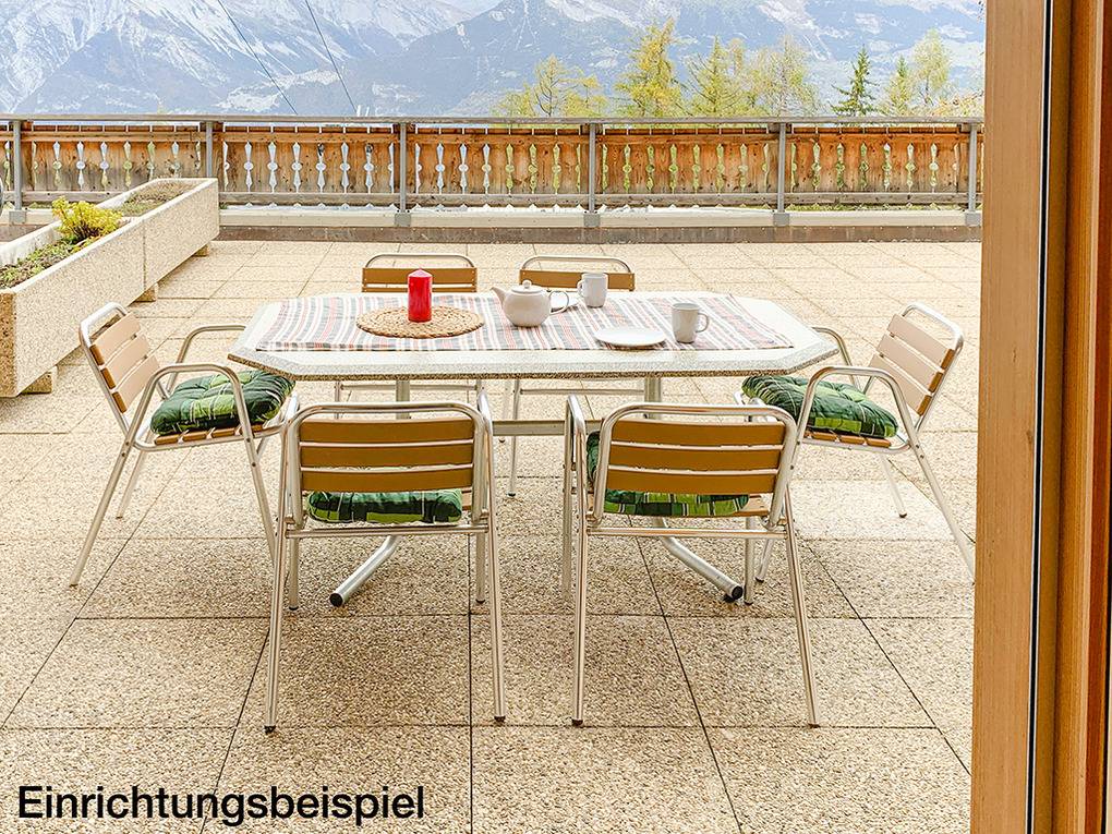 Haus: Zwei schöne Apartmenthäuser mit großzügigen Komfort-Wohnungen. Jede Fewo individuell gestaltet, alle mit geschmackvoller Einrichtung. Moderne Komfort-Ausstattung: Internet über W-Lan, Kabel-TV, DVD, Radio/CD, Küchenzeile (Backofen, Mikrowelle, Spülmaschine). Die meisten Fewos mit Kamin. Balkon oder Terrasse mit Gartenmöbeln, phantastischem Blick ins Rhônetal und auf die Bergwelt des Wallis. Zentral-/Fußbodenheizung.