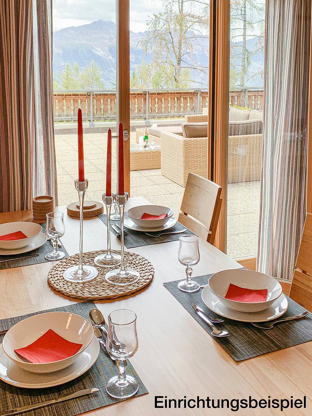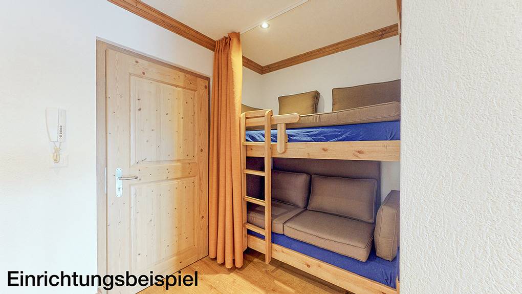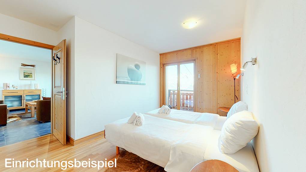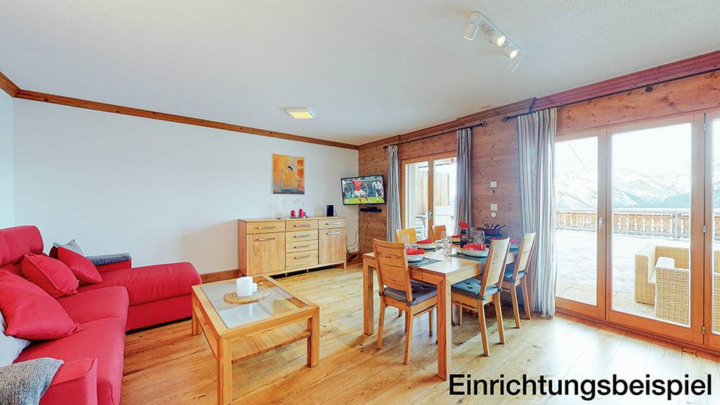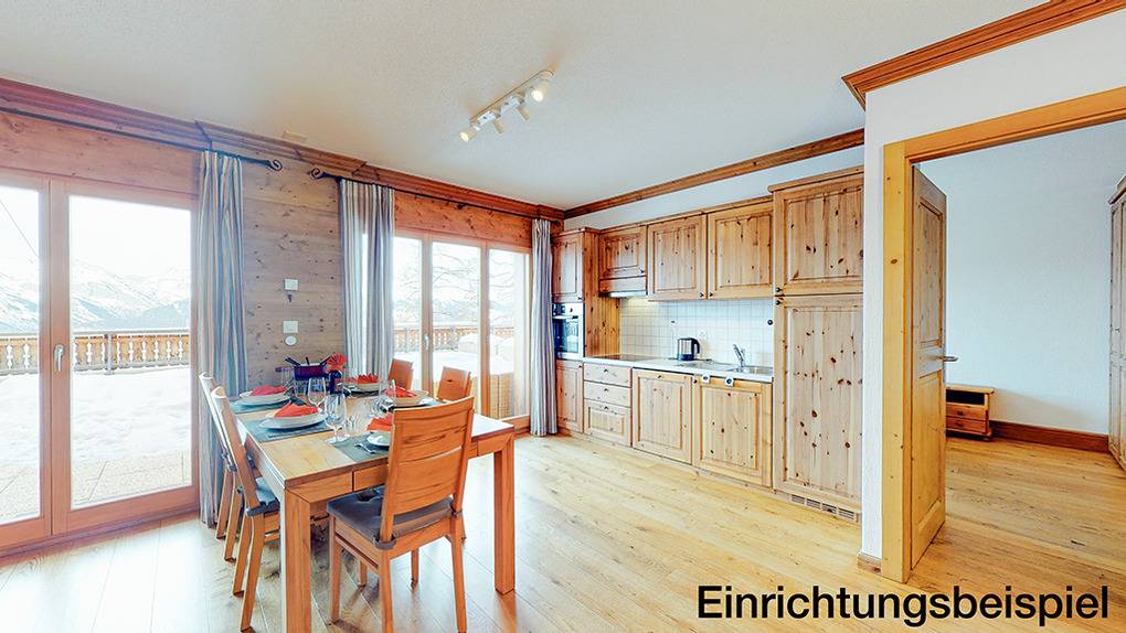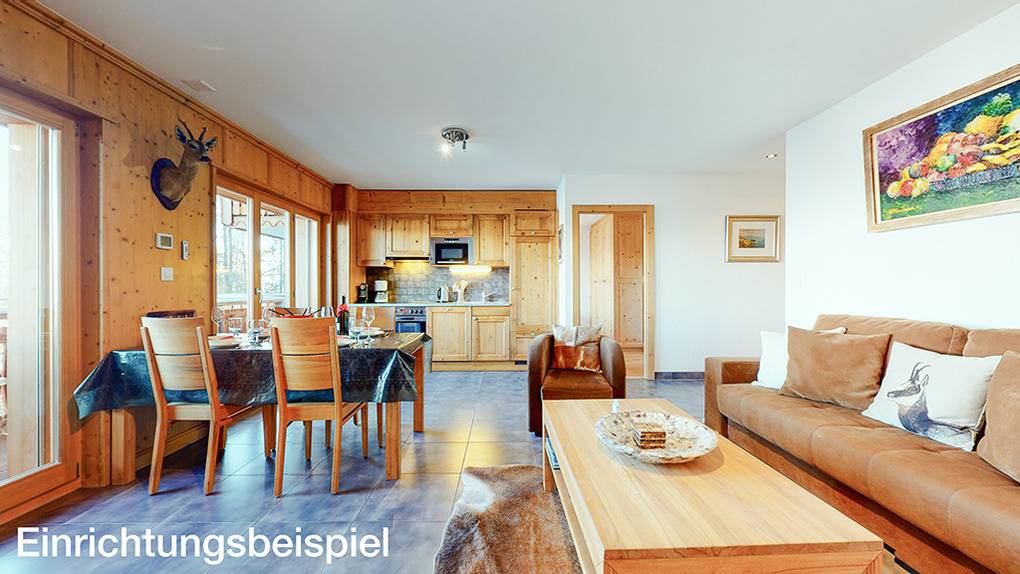 CH 385.38 Wohnung 6-8 Pers.: 4 Zimmer, 110 qm. Großer Wohnraum mit Kamin, Sitzgruppe (Schlafsofa 2 Pers.), TV, Esstisch, Küchenzeile. Zwei Doppelzimmer mit Bad (Bw/Du, Wb, WC). Doppelzimmer. Bad: Du, Wb, WC.