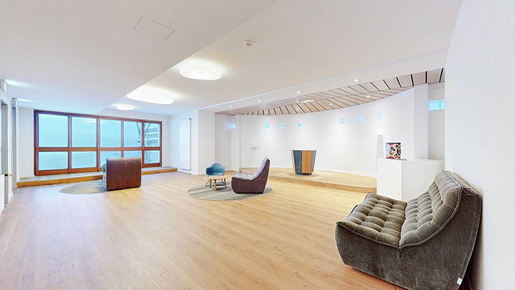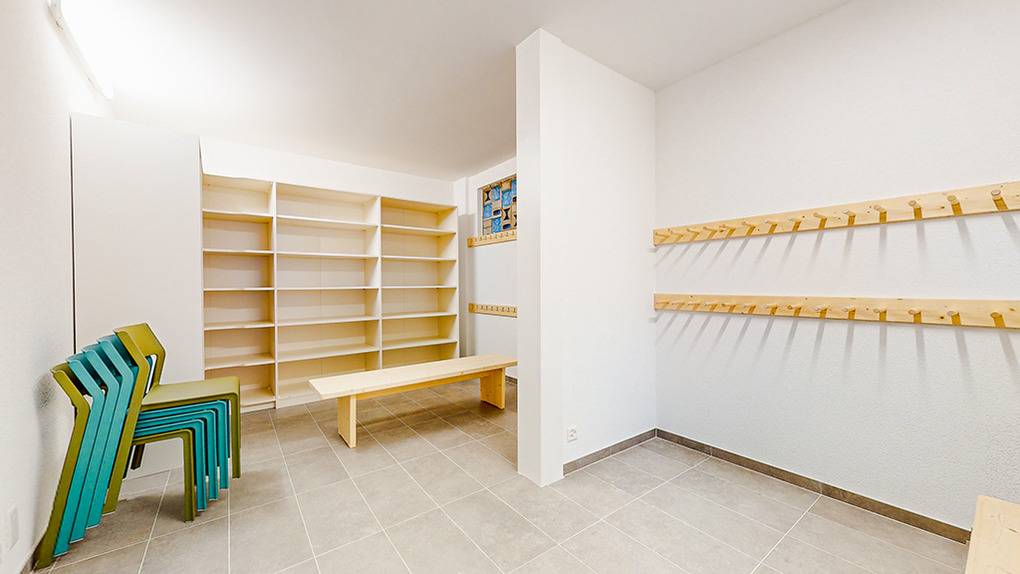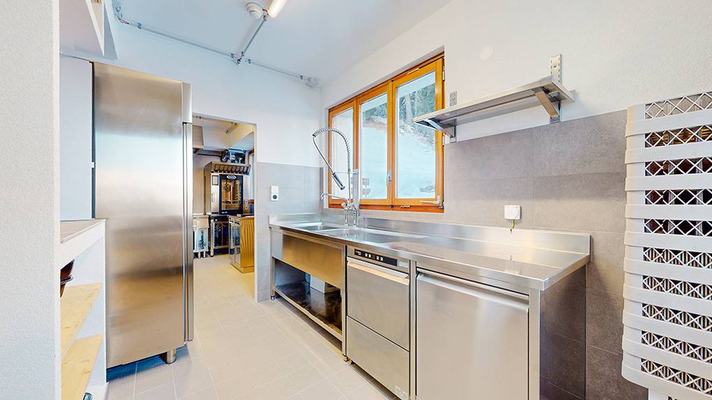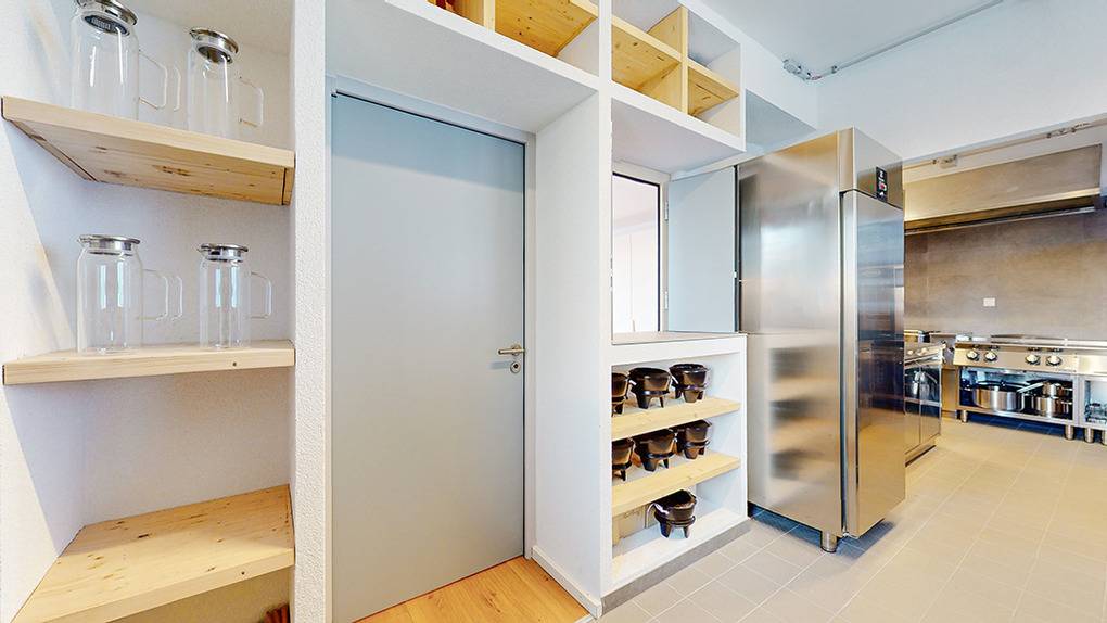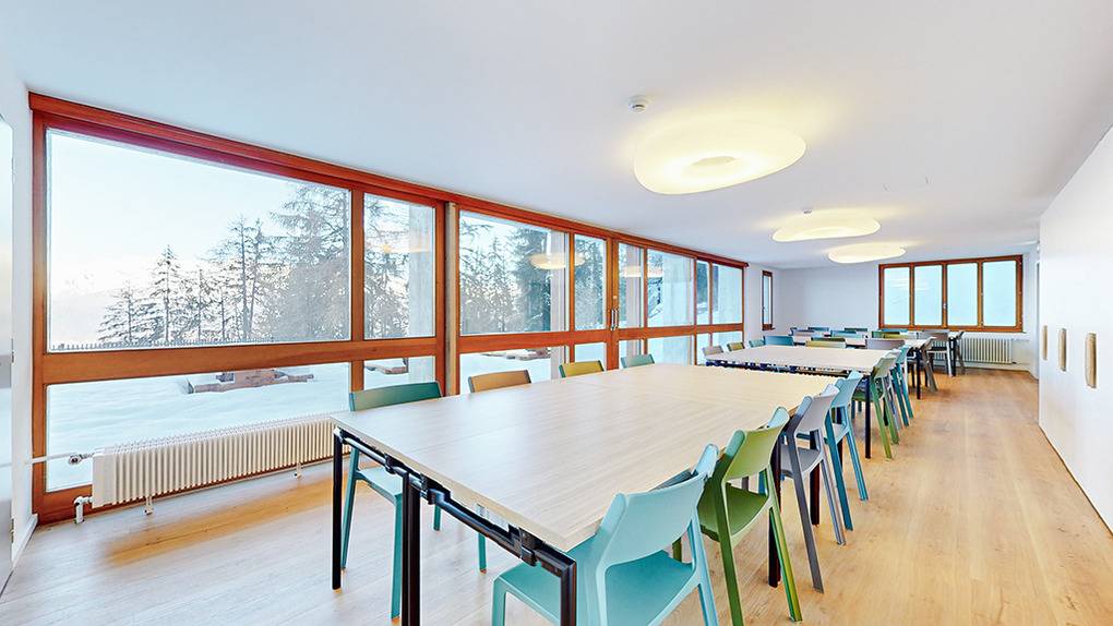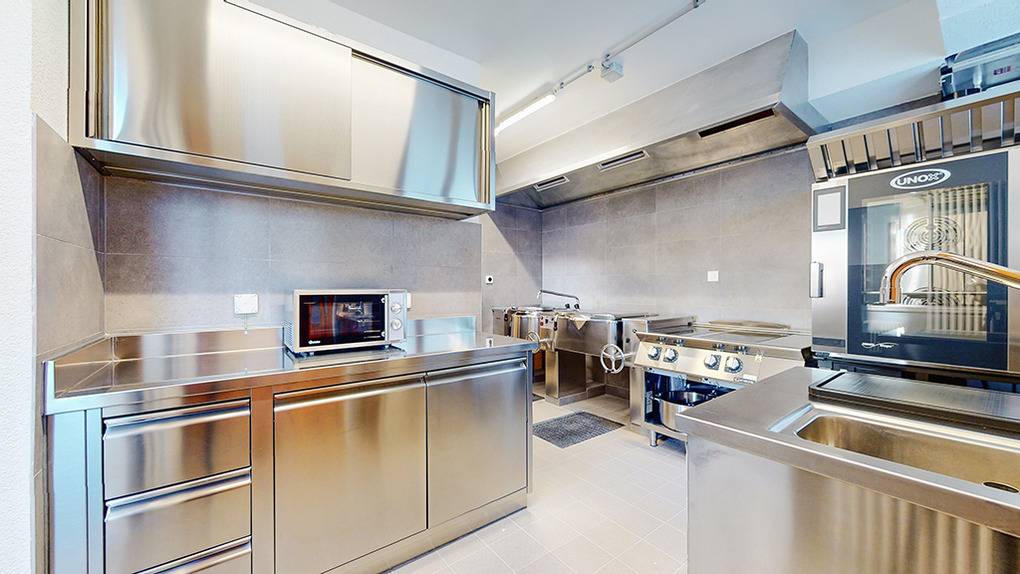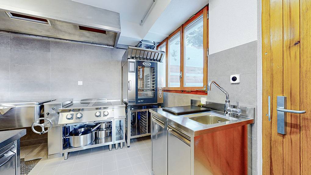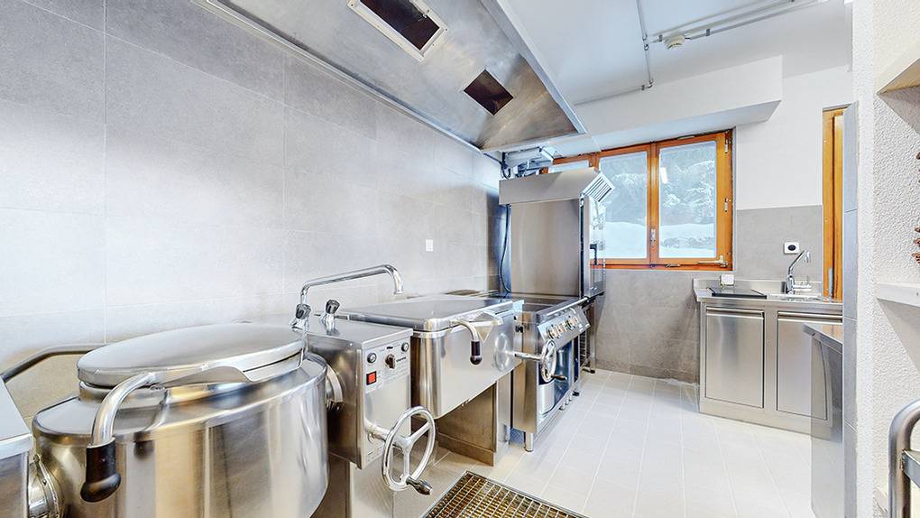 Parterre: Flur mit Garderobe. Schöner Aufenthaltsraum (55 qm) mit Panoramafenstern, Esstischen. Gruppenküche mit großem Ceranfeld, Konvektomat, Spülmaschine, Friteuse. Weiterer Aufenthaltsraum mit Sofa-Sitzecke, Spielen. 2 separate WC.