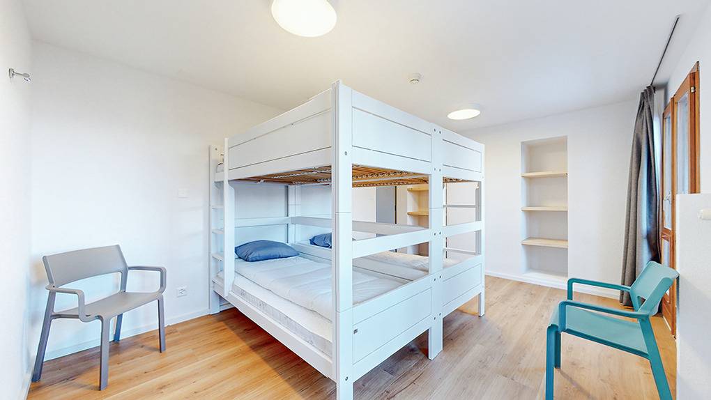 1. Etage: Drei Doppelzimmer. Sechs 2-Bettzimmer mit Etagenbett. Zwei 4-Bettzimmer mit Etagenbetten. Vier moderne Waschräume: jeweils 2 Duschen, 2 Wb, 2 WC.