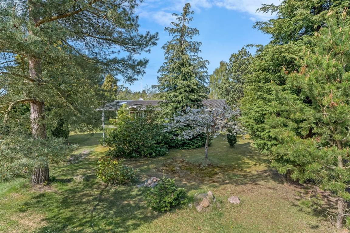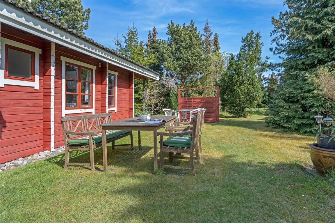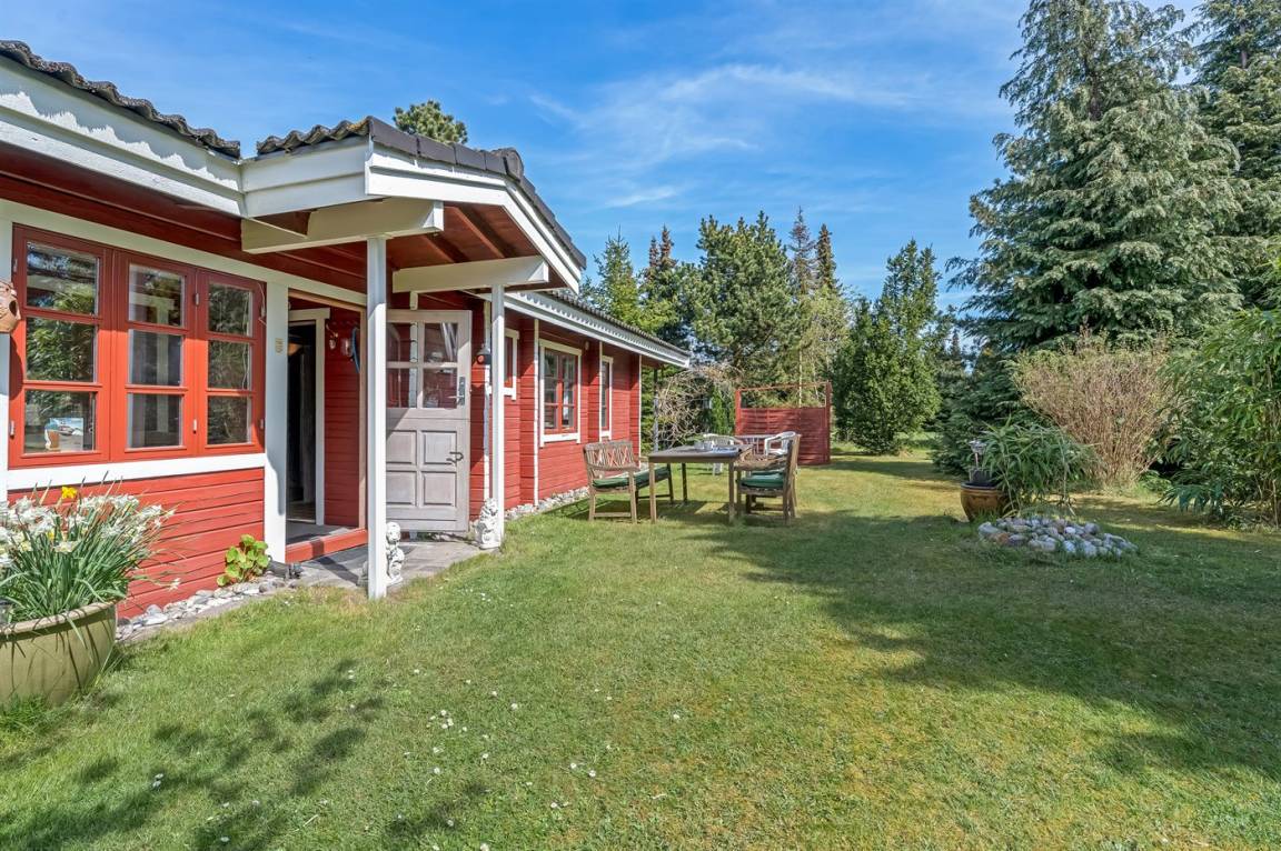 Dieses gemütliche Ferienhaus älteren Jahrgangs liegt auf einem leicht hügeligen Grundstück mit Bäumen und Sträuchern – an einer ruhigen Straße.