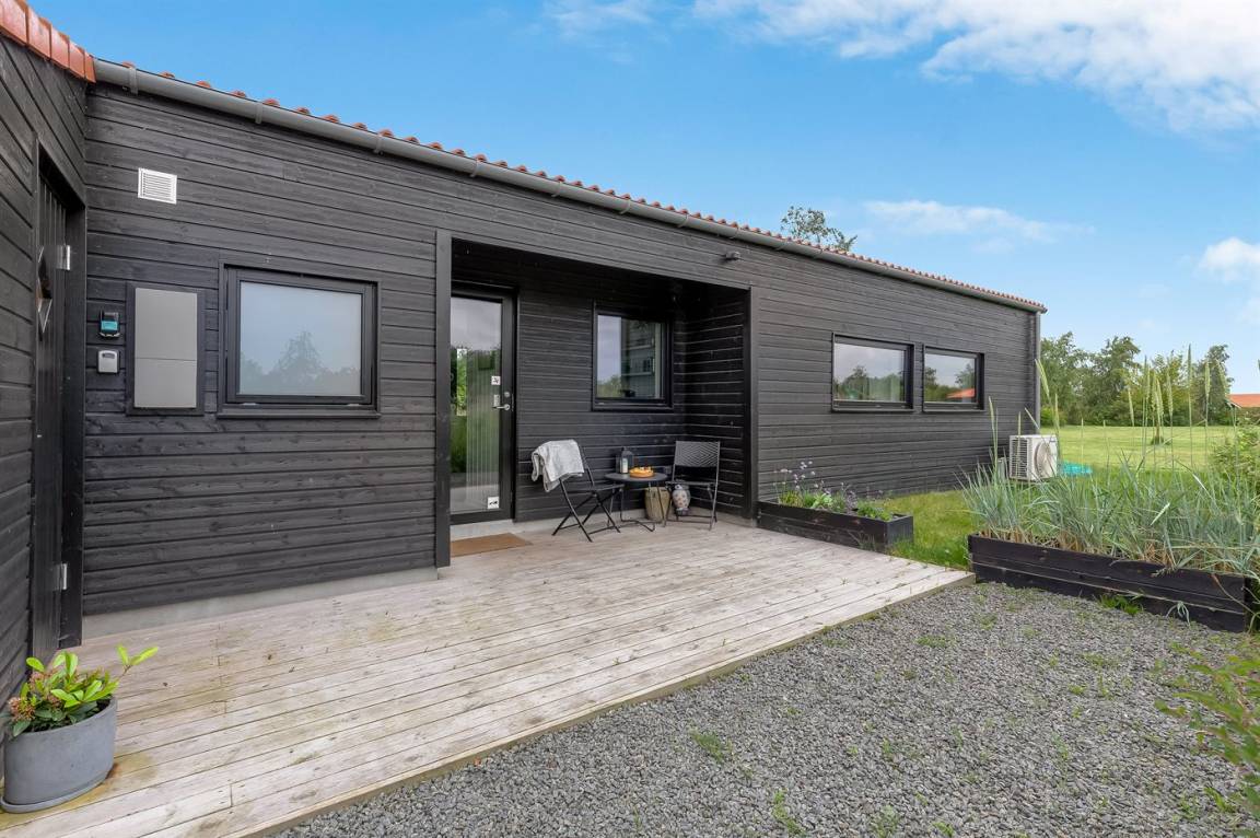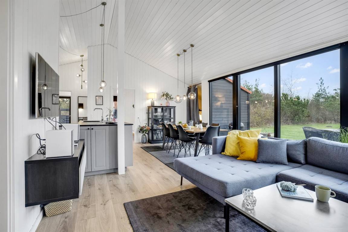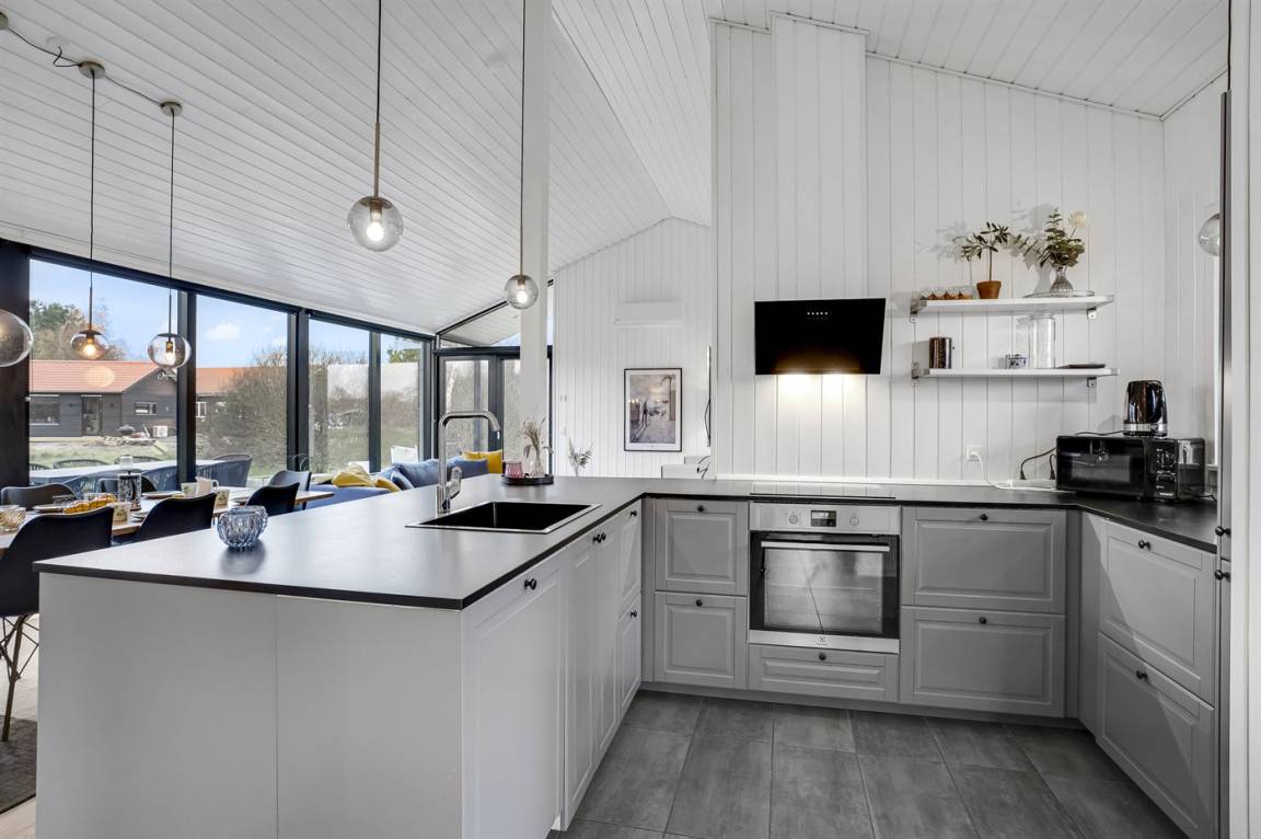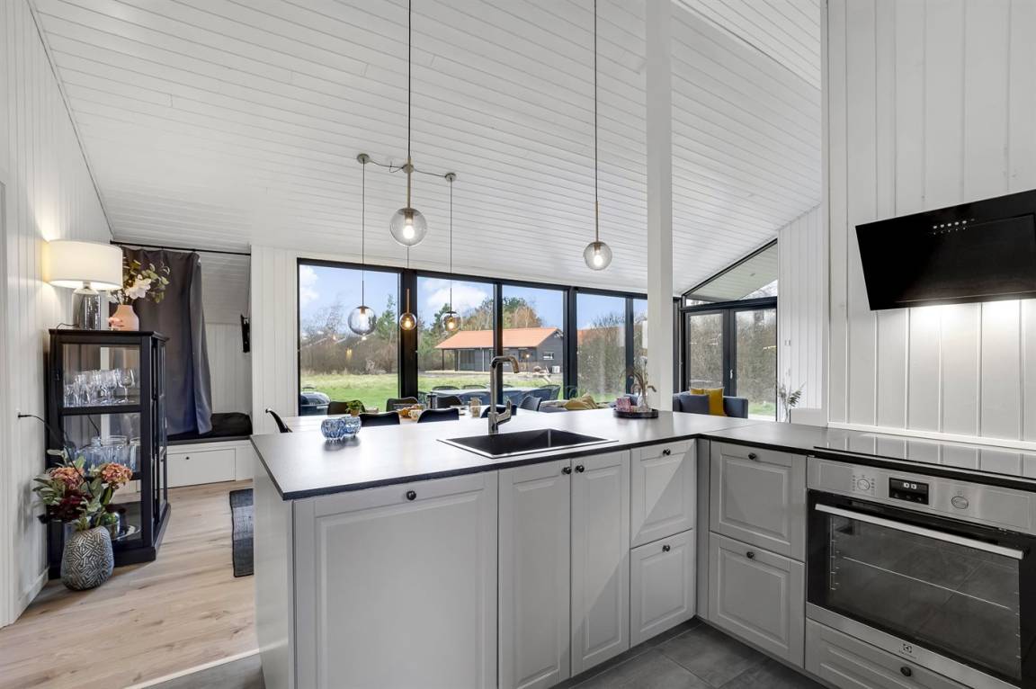 Die Küche ist hell und in offener Verbindung mit dem modern eingerichteten Wohnzimmer. Es gibt drei Schlafzimmer, verteilt auf zwei Zimmer mit Doppelbetten und ein Zimmer mit einem Etagenbett für 2 Personen. Zusätzlich gibt es eine große, gemütliche Alkove am Ende des Wohnzimmers mit einer Doppelmatratze. Das Ferienhaus verfügt über eine energiesparende Luft-Luft-Wärmepumpe, die auch als Klimaanlage genutzt werden kann.