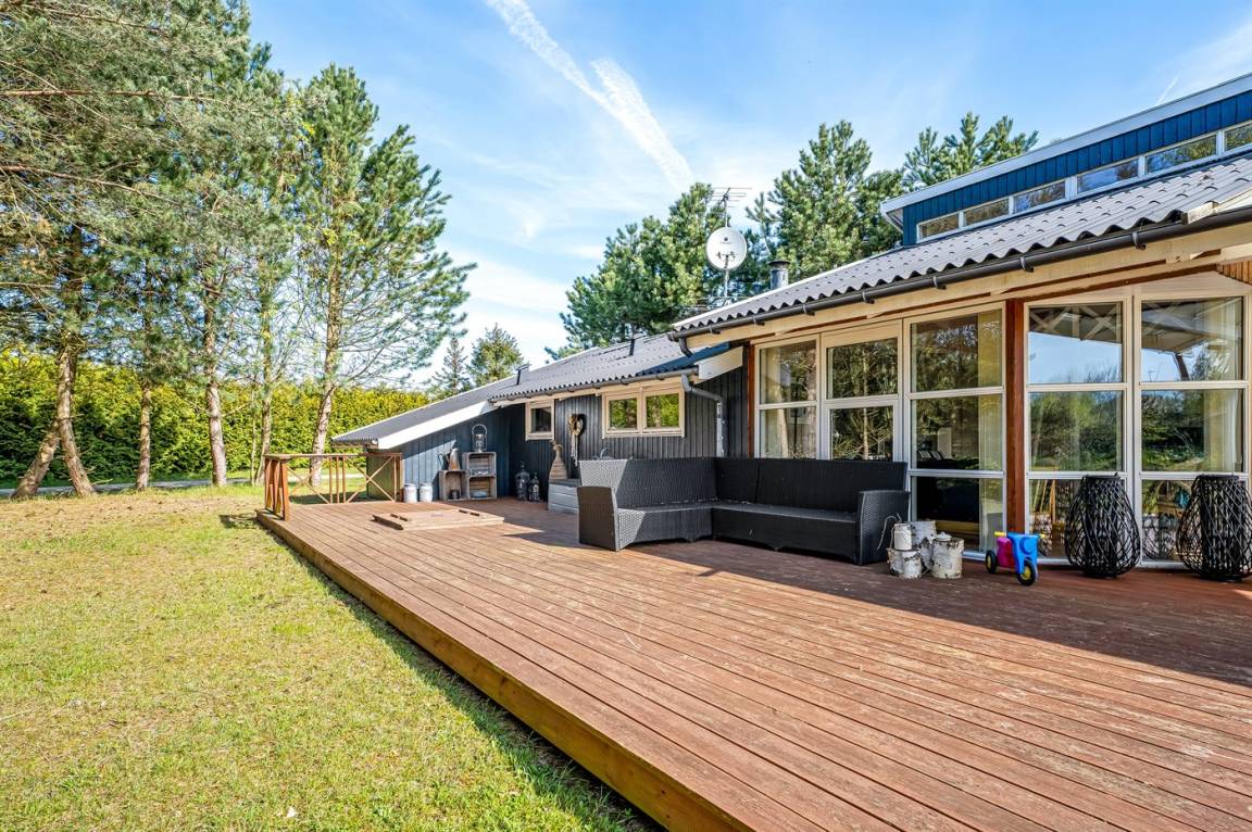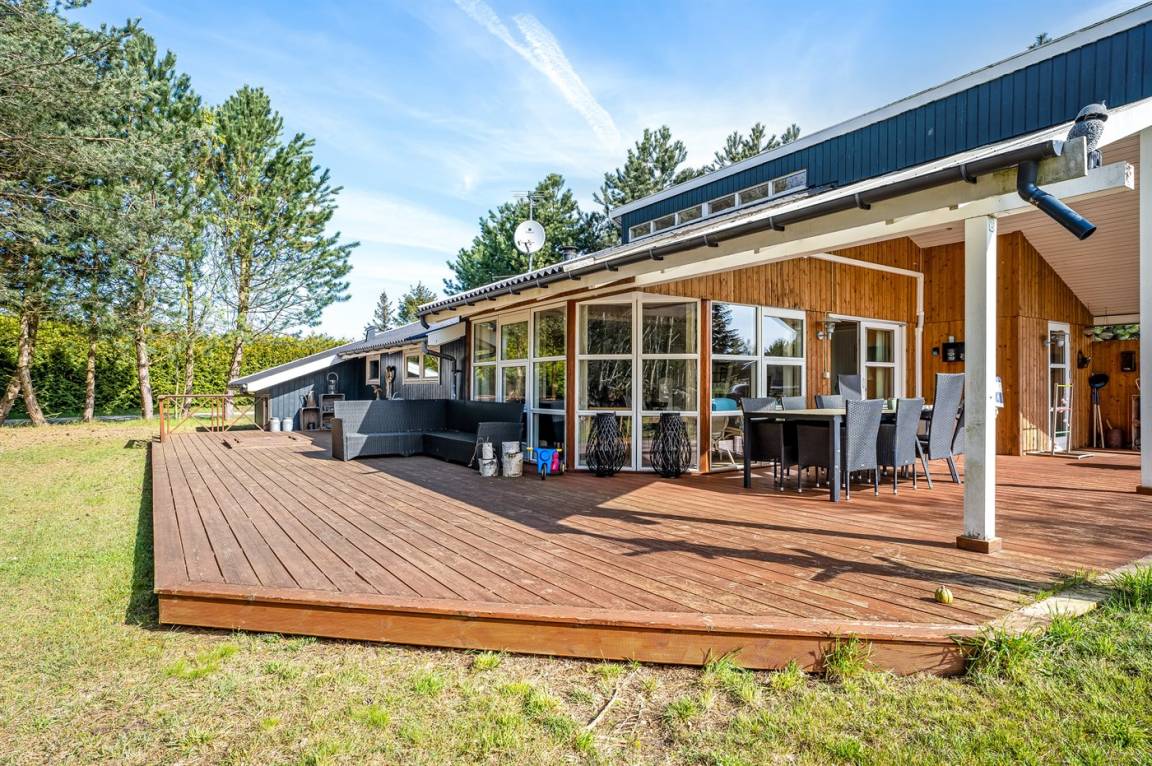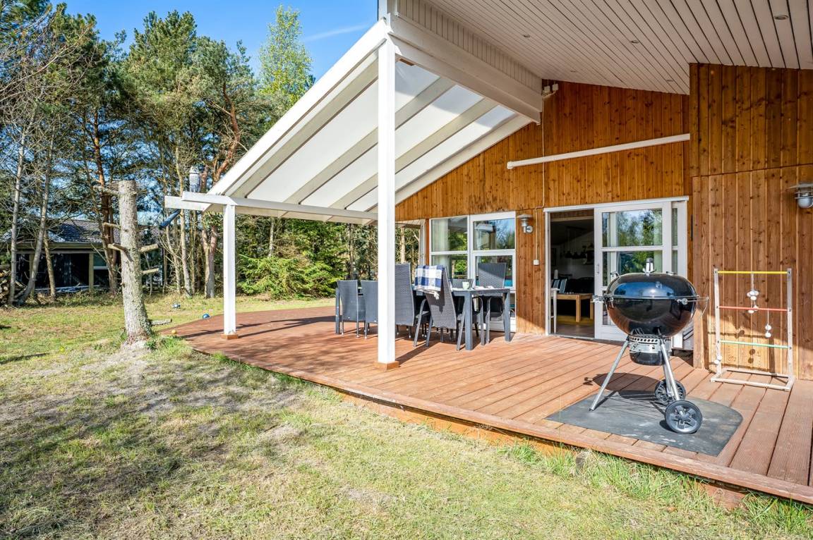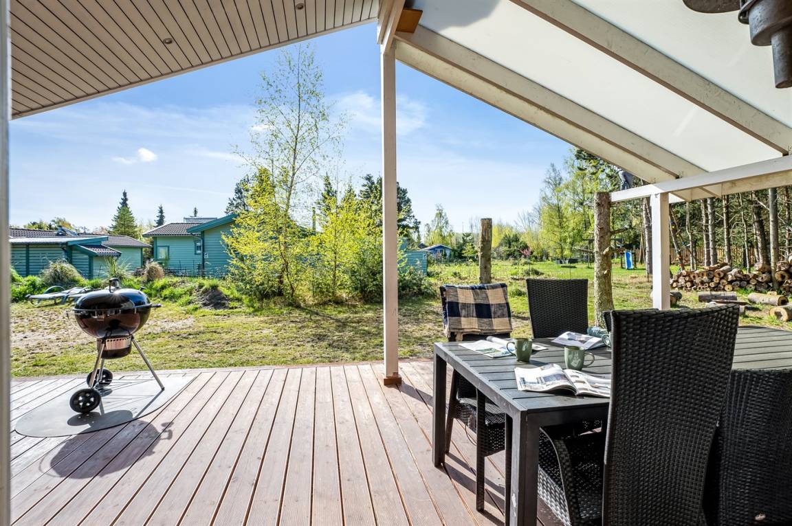 Vom Wohnzimmer des Hauses gelangt man auf die schöne Holzterrasse, von der 40 m² offen und 24 m² überdacht sind. Hier kann man sich im Frühling, im Sommer und im Herbst vor dem Wind geschütz aufhalten und die Ruhe genießen. Zur Terrasse gehören Terrassenmöbel für 11 Personen und ein Loungeset. Es stehen außerdem 2 Sonnenliegen sowie ein großer Weber Holzkohle-Grill zur Verfügung – die perfekte Ausstattung für herrliche Sommerabende.