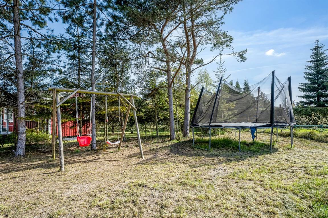 Auf dem schönen großen Naturgrundstück gibt es eine Schaukel und ein Trampolin, sodass auch an die Kinder gedacht ist. Auf der offenen Terrasse gibt es einen Sandkasten für kleinere Kinder.