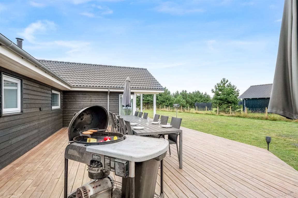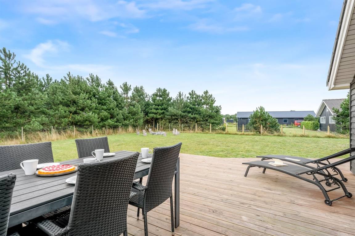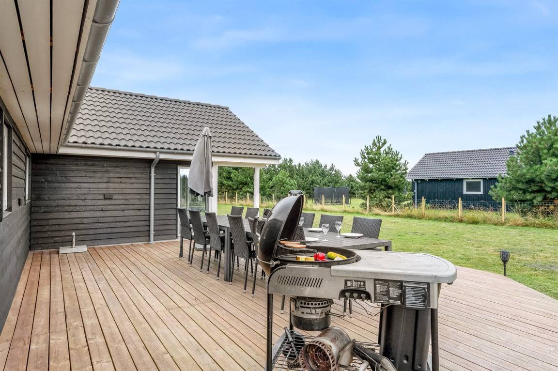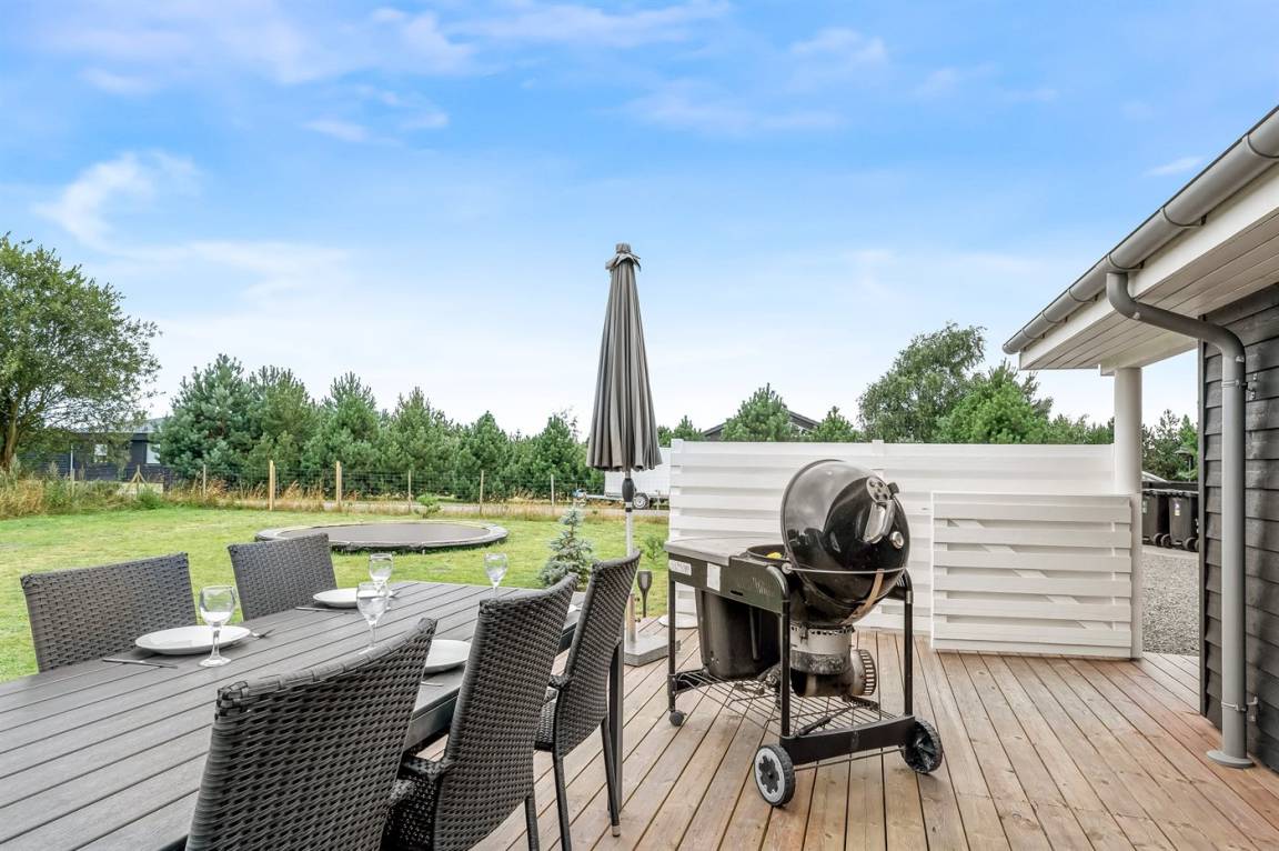 Zum Haus gehören ein Garten mit vielen gemütlichen Plätzen und eine große Terrassefläche von 160 m², die das Haus fast vollständig umgibt. Hier kannst du die Sonne auf den Liegestühlen genießen und gemütliche Grillabende verbringen.