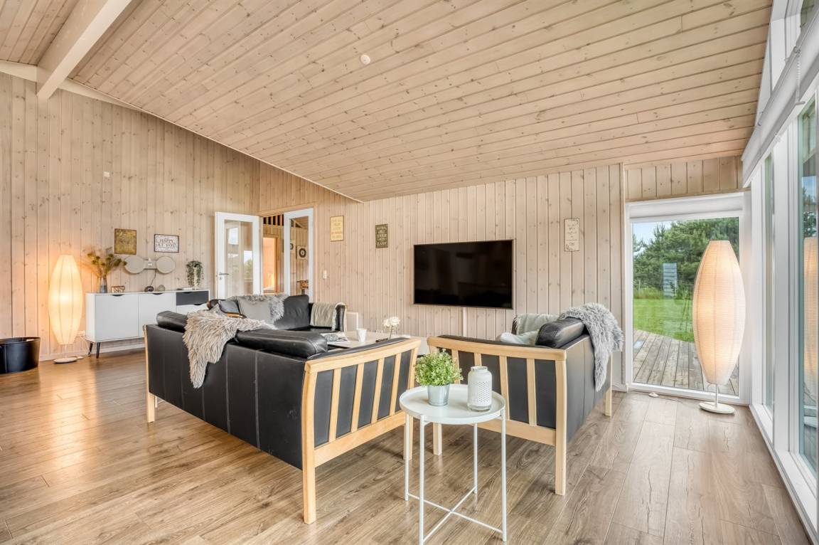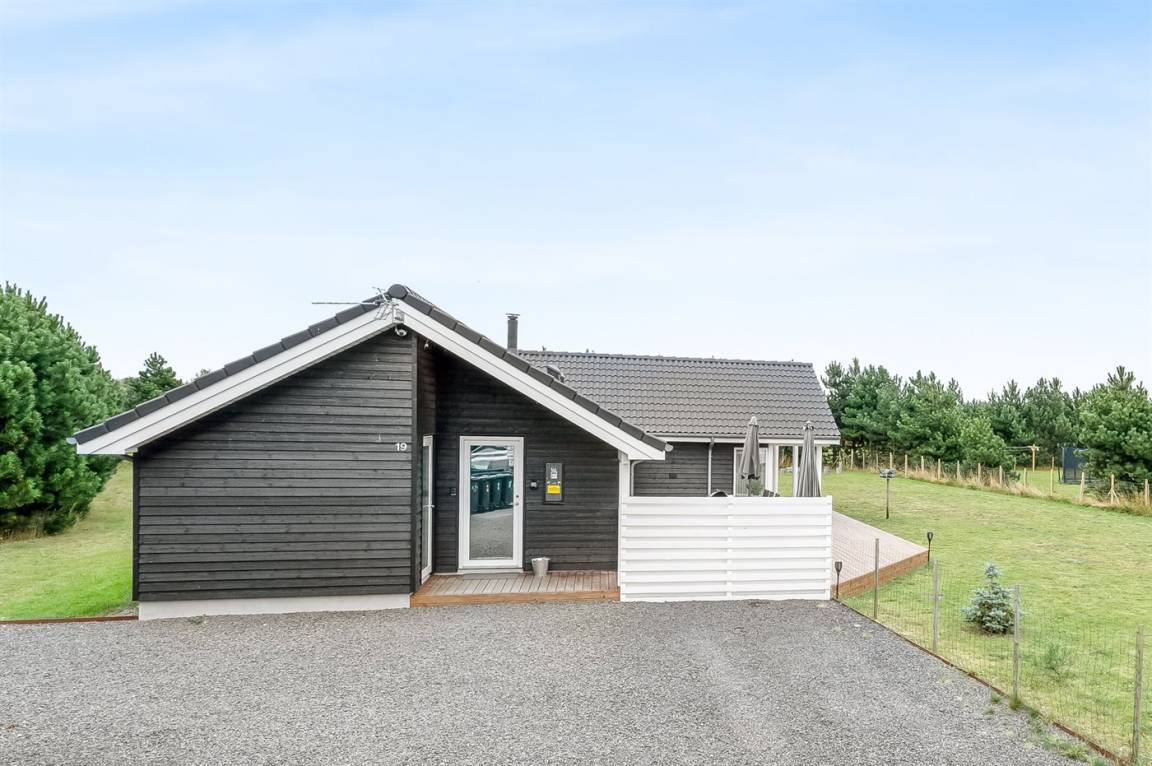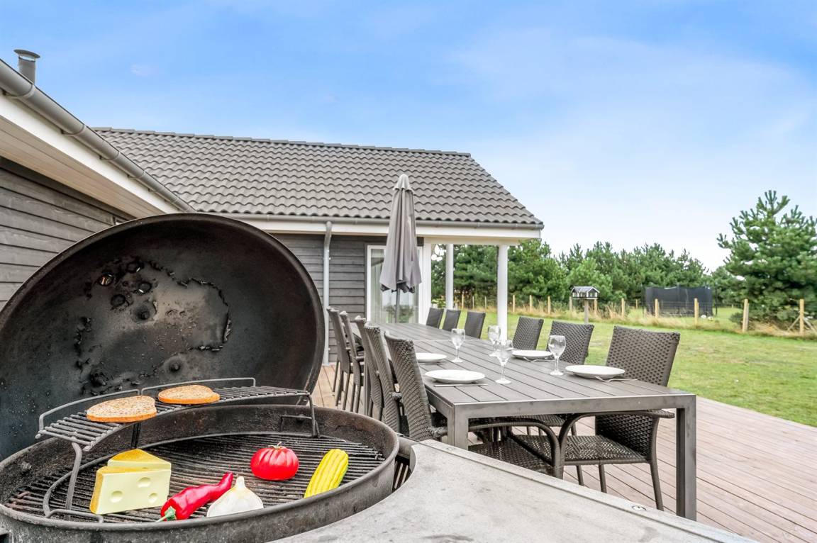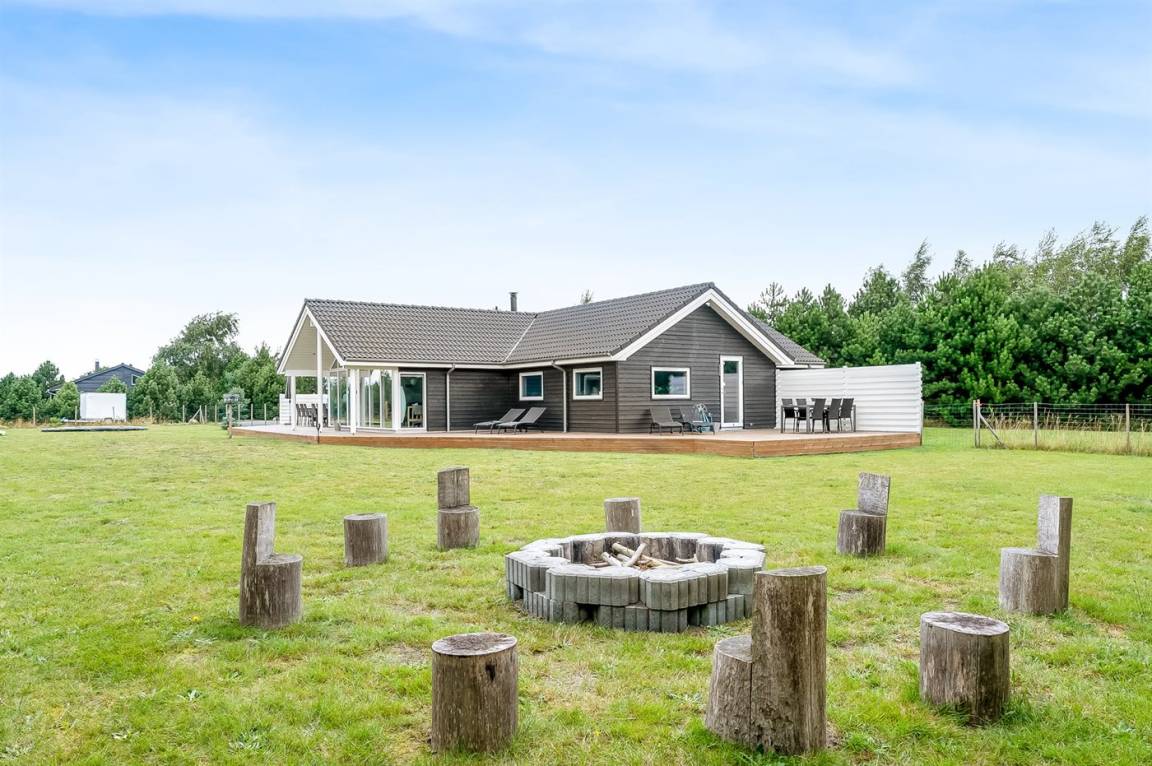 Zum Haus gehören ein Garten mit vielen gemütlichen Plätzen und eine große Terrassefläche von 160 m², die das Haus fast vollständig umgibt. Hier kannst du die Sonne auf den Liegestühlen genießen und gemütliche Grillabende verbringen.
