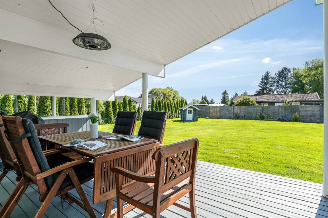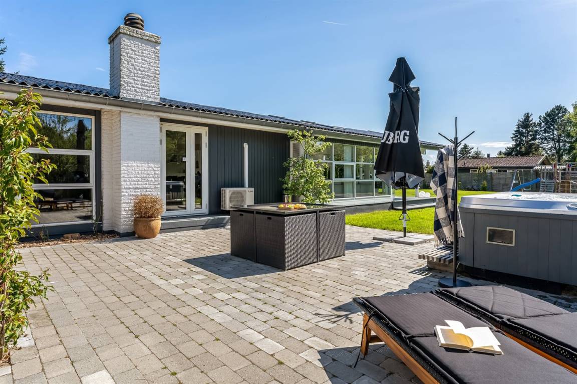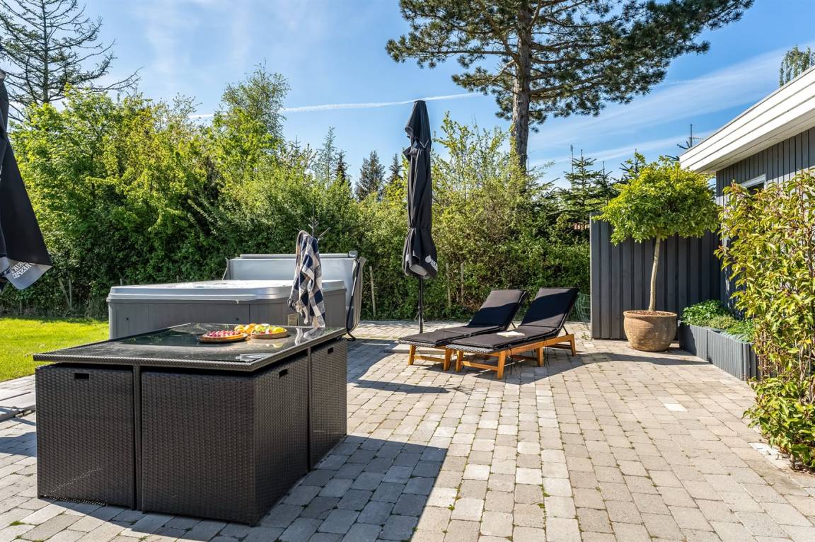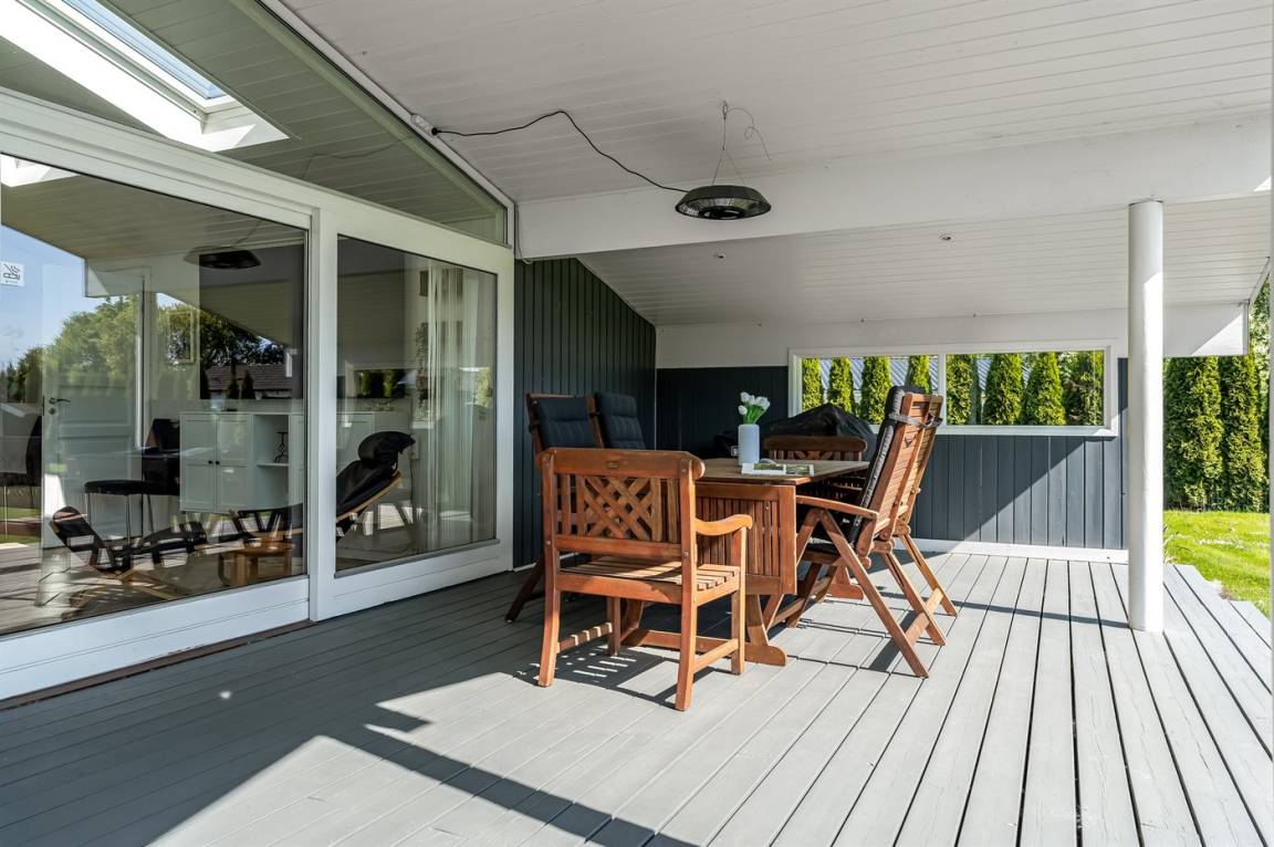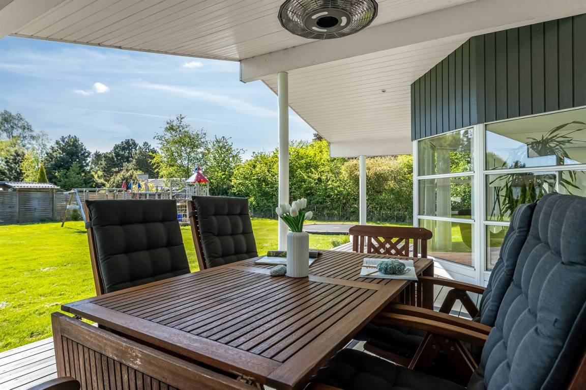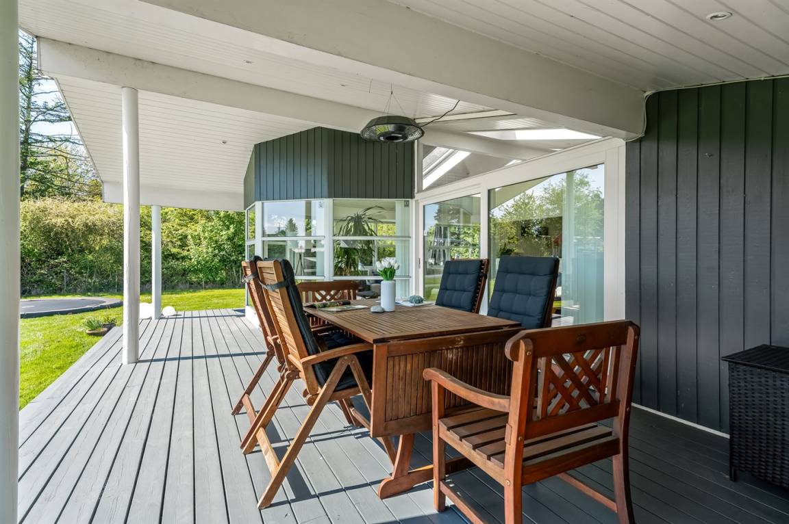 An warmen und sonnigen Ferientagen kann man auf die Terrasse des Ferienhauses verziehen. Diese ist teilweise überdacht, sodass man auch einen schattigen Platz finden kann, wenn mann eine Pause von der Sonne benötigt. Auf der Terrasse stehen Gartenmöbel und Liegestühle zur Verfügung, damit man es sich in der Sonne bequem machen kann.