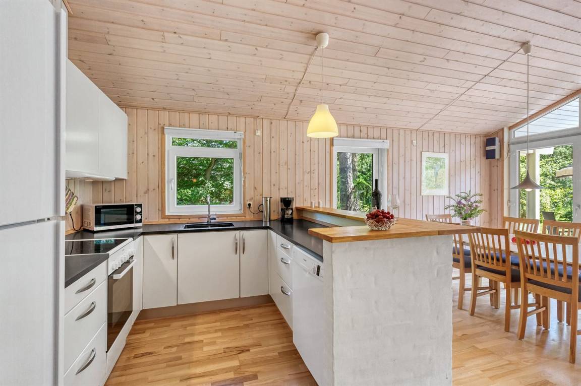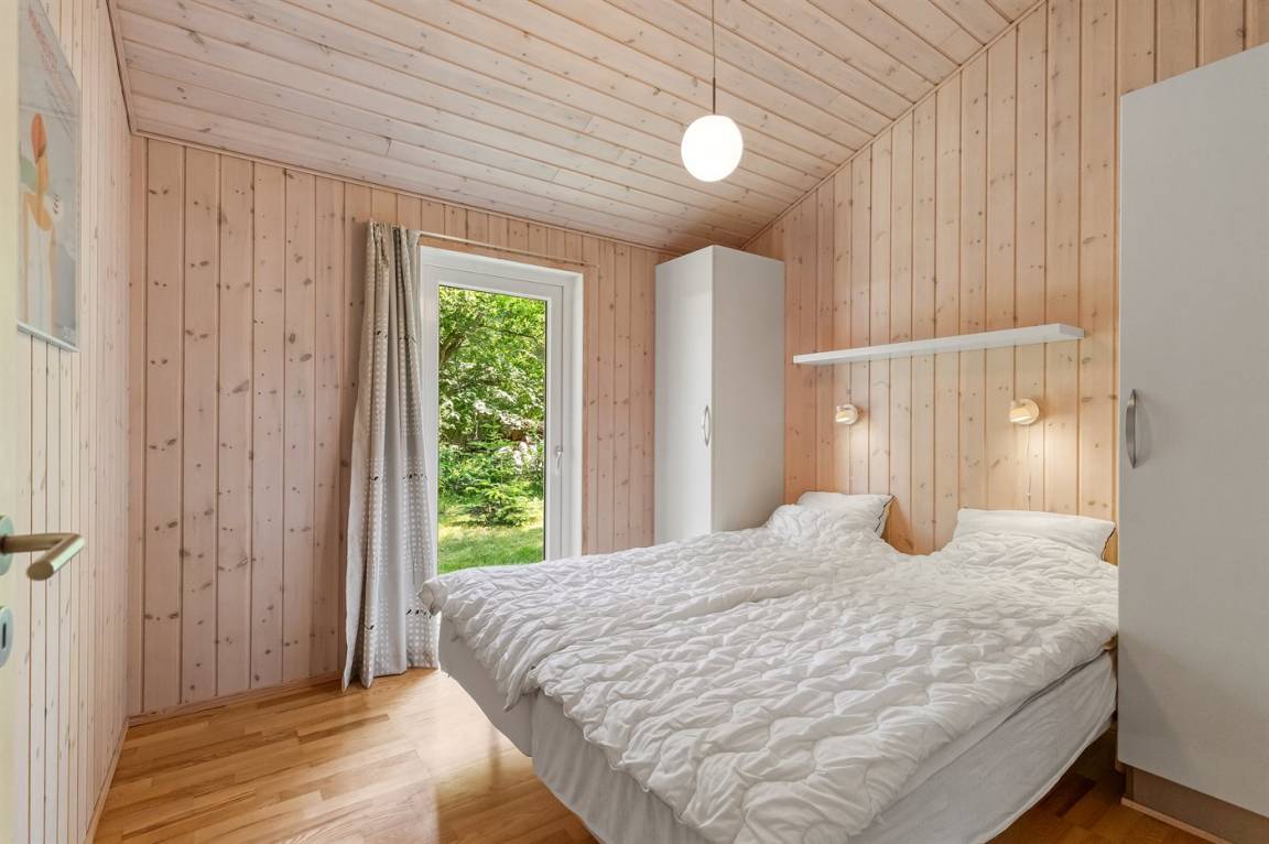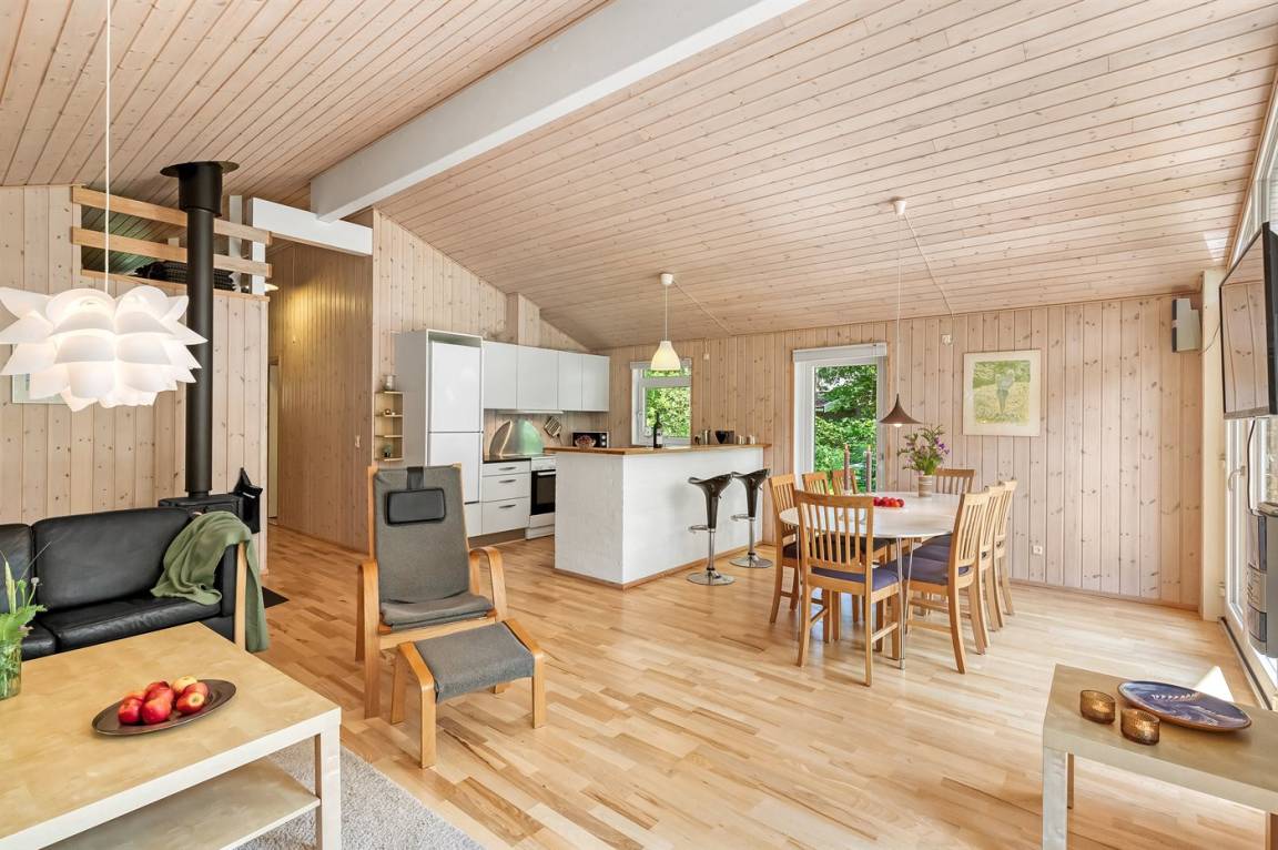 Dieses schöne und gemütlich eingerichtete Ferienhaus aus Holz liegt dicht am Wasser auf einem von hohen Bäumen umgebenen Naturgrundstück. Zum Haus gehört eine teilweise überdachte Terrasse mit Gartenmöbeln. Die schöne und moderne Küche ist u. a. mit Geschirrspüler, Mikrowelle, Tiefkühlgerät, Umluftofen und Herd mit Ceran-Feld ausgestattet. Im Wohnzimmer mit komfortabler Sitzgarnitur finden Sie Kaminofen, TV und Stereoanlage mit CD-Spieler. Die Schlafplätze verteilen sich auf 2 Zimmer mit Doppelbett, 1 Zimmer mit 2 Einzelbetten sowie 2 Schlafplätze im offenen Obergeschoss. Schönes Badezimmer mit Fußbodenheizung, 2-Pers.-Whirlpool, Duschnische und Zutritt zur Sauna. Eine Gästetoilette steht ebenfalls zur Verfügung. An weiterer Ausstattung können kostenlose, kabellose Internetverbindung (Computer ist mitzubringen), Waschmaschine sowie Wäschetrockner erwähnt werden und es ist eine energiegerechte Wärmepumpe installiert. Die Böden sind teils mit Holz, teils mit Klinker ausgelegt. Ein erstklassiges Ferienhaus in einem naturschönen Gebiet dicht am schönen Badestrand der Ostsee sowie dem Ferienort Marielyst.