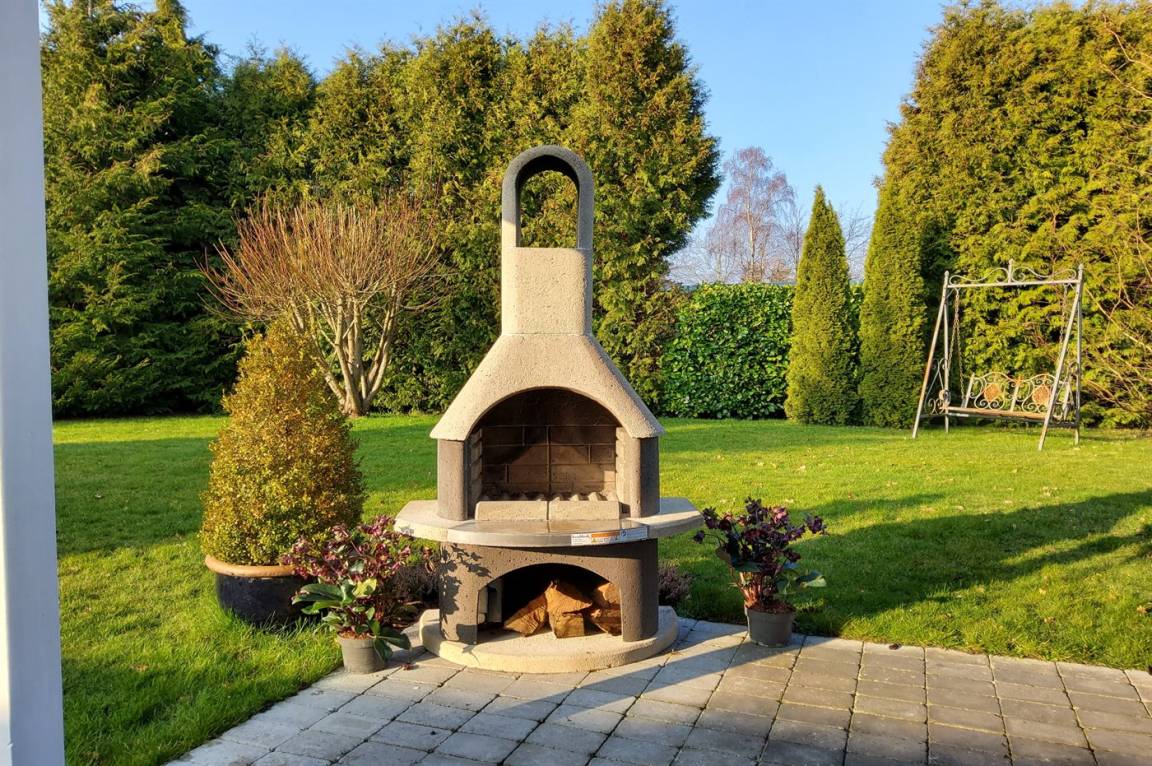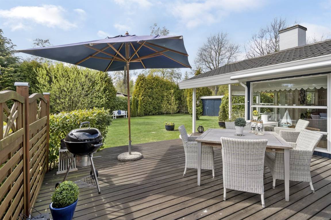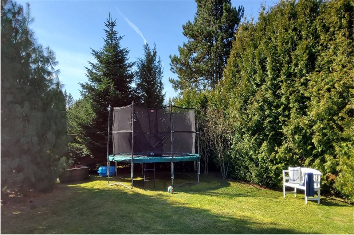 Wie bereits erwähnt, verfügt das Haus über eine schöne 50 m² große Terrasse sowie eine 12 m² große überdachte Terrasse, auf der du das Leben im Freien bei jedem Wetter genießen kannst. Eine elektrische Markise und Heizstrahler ermöglichen es, die gemütlichen Stunden im Freien zu verlängern, und für die Kinder gibt es einen Sandkasten, ein Trampolin und Fußballtore. Aus Sicherheitsgründen werden das Trampolin und einige der Gartenmöbel in den Wintermonaten verstaut. Am Haus gibt es auch eine Außendusche und einen Grill, die perfekt für die warmen Sommerabende sind.