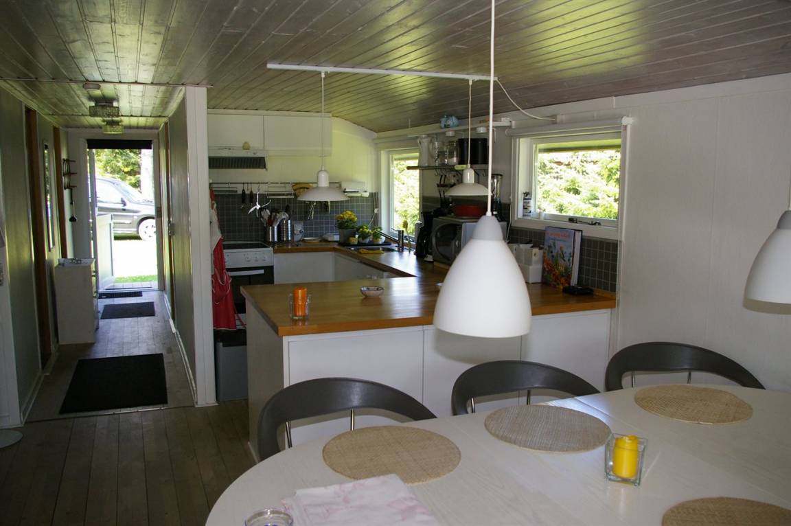 Gemütliches und gut erhaltenes Ferienhaus aus Holz mit niedriger Deckenhöhe. Das Wohnzimmer ist mit der teilweise offenen Küche kombiniert und hat Ausgang zur Südterrasse. Das Haus ist hell und freundlich eingerichtet. Laufend renoviert. 1 Hund ist erlaubt mitzubringen.