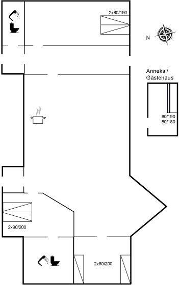 SchlafverhältnisseDie Schlafplätze verteilen sich auf 4 Schlafräume. 4 Schlafplätze in Doppelbetten. 2 Schlafplätze in Einzelbetten. 2 Schlafplätze in einem Etagenbett. 2 von diesen Schlafplätzen befinden sich im Gästehaus.