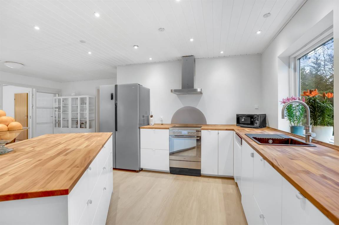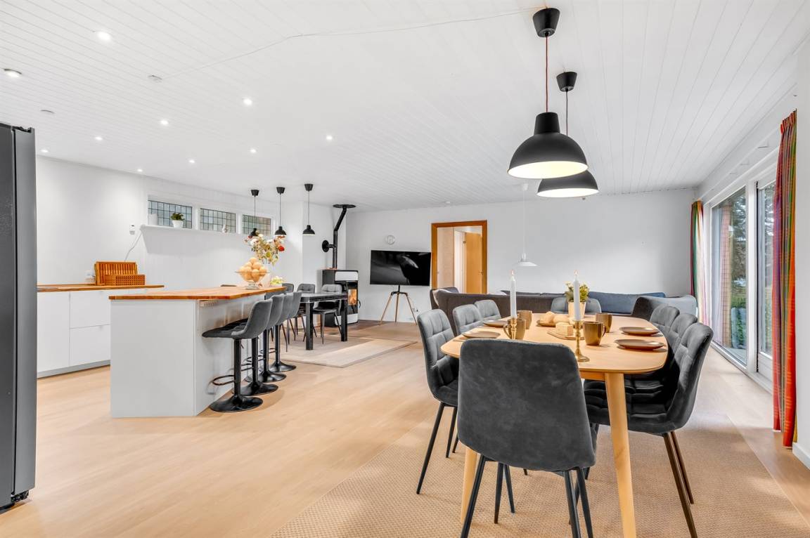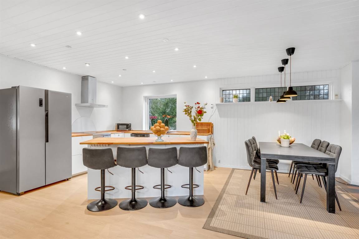 Aber lasse uns ganz von vorne beginnen... Der Eingang zum Haus erfolgt von der nördlichen Seite des Hauses über die Diele, die zu einer komplett neuen Küche mit viel Platz und 14 Sitzplätzen, einer Kücheninsel mit Bar und einer Lounge-Sofa führt.