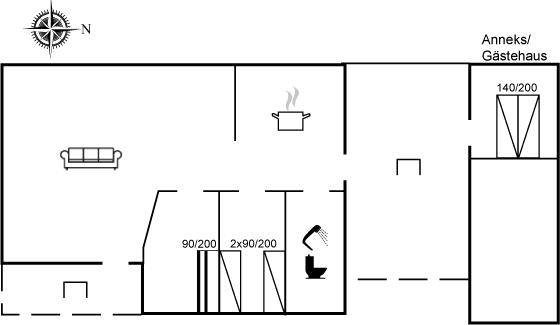 DraußenDie Ferienunterkunft liegt auf einem 1225 m² großen Gartengrundstück. Das Grundstück ist eingezäunt. Die Entfernung zum Meer beträgt 600 m. Die nächste Einkaufsmöglichkeit liegt 900 m entfernt. In einem Abstand von 2800 m gibt es einen Golfplatz. Außerdem gibt es 28 m² überdachte Terrasse. Geräteraum. Schaukel. Sandkasten. Es steht ein Grill zur Verfügung. Parkplatz auf dem Grundstück.