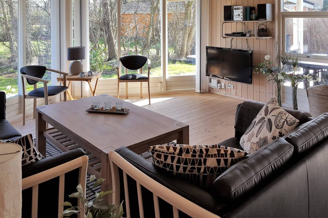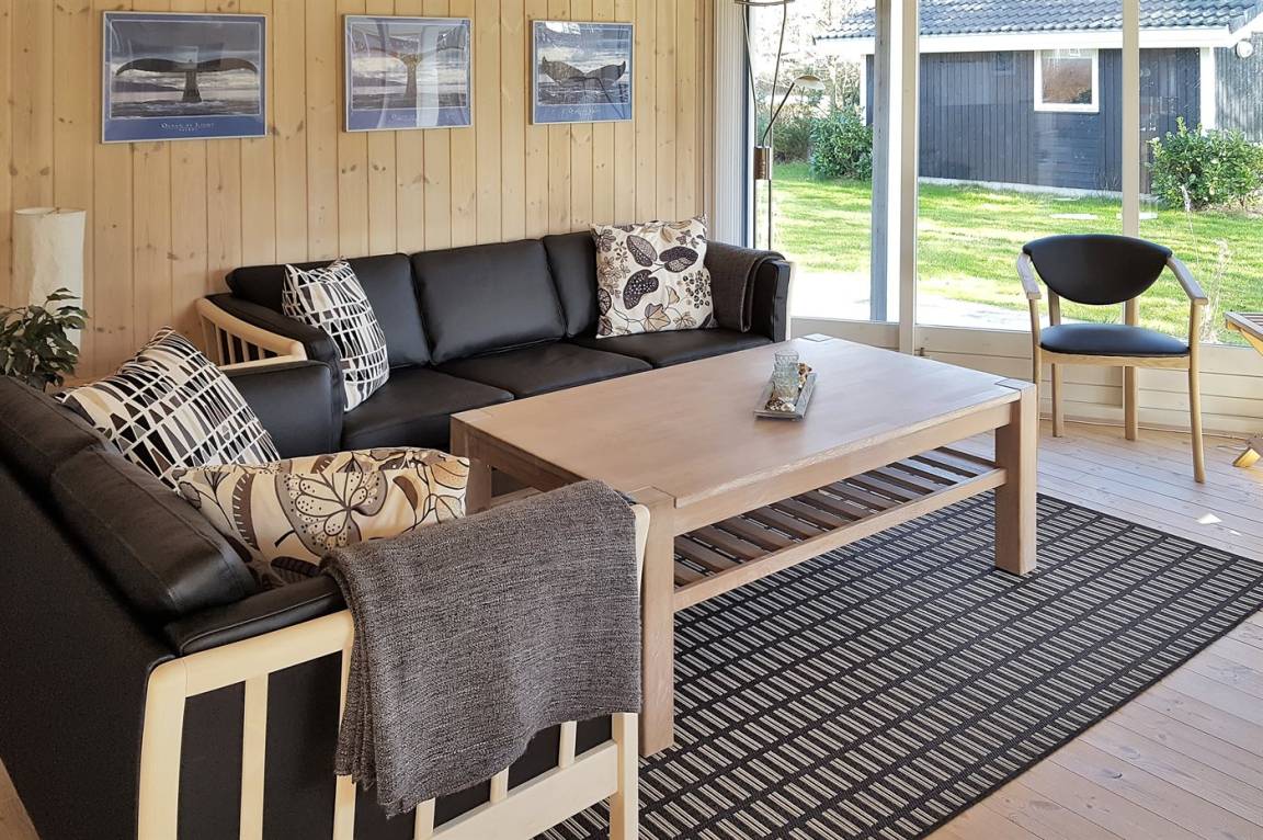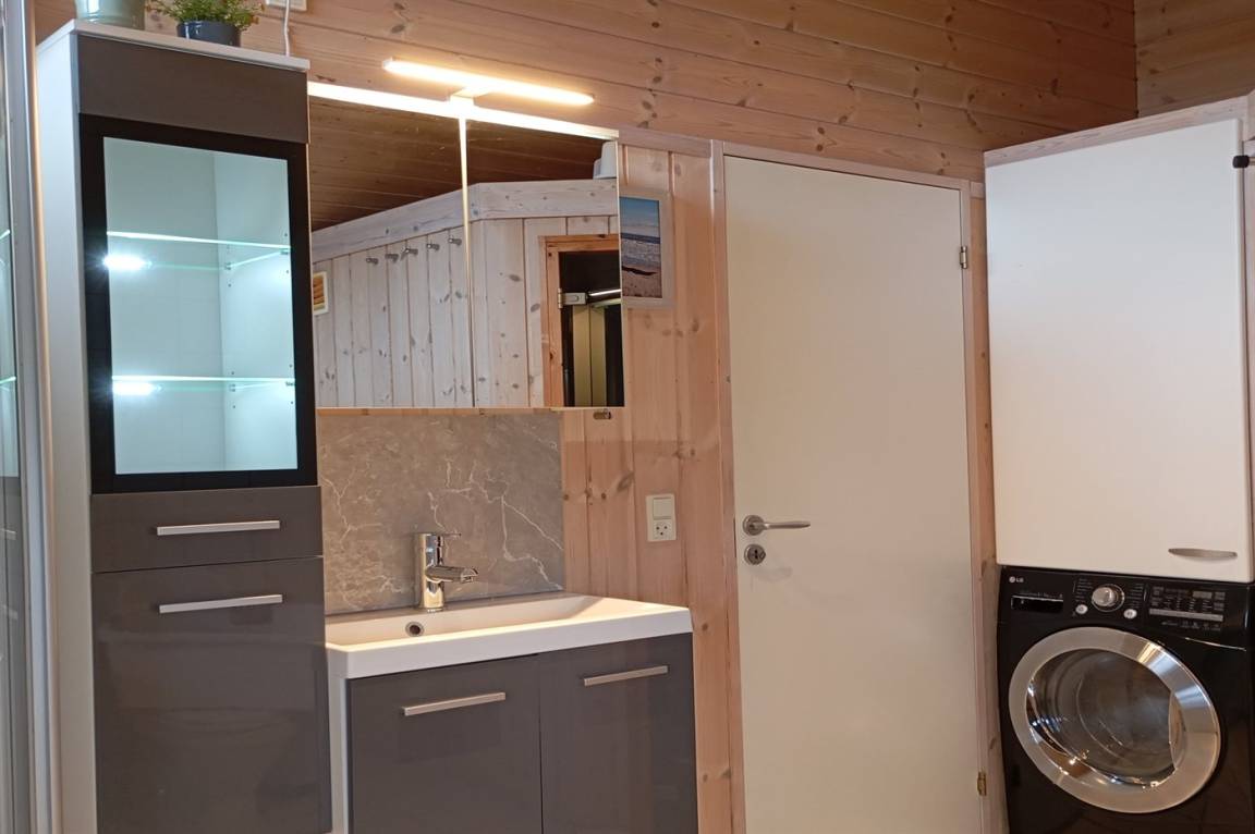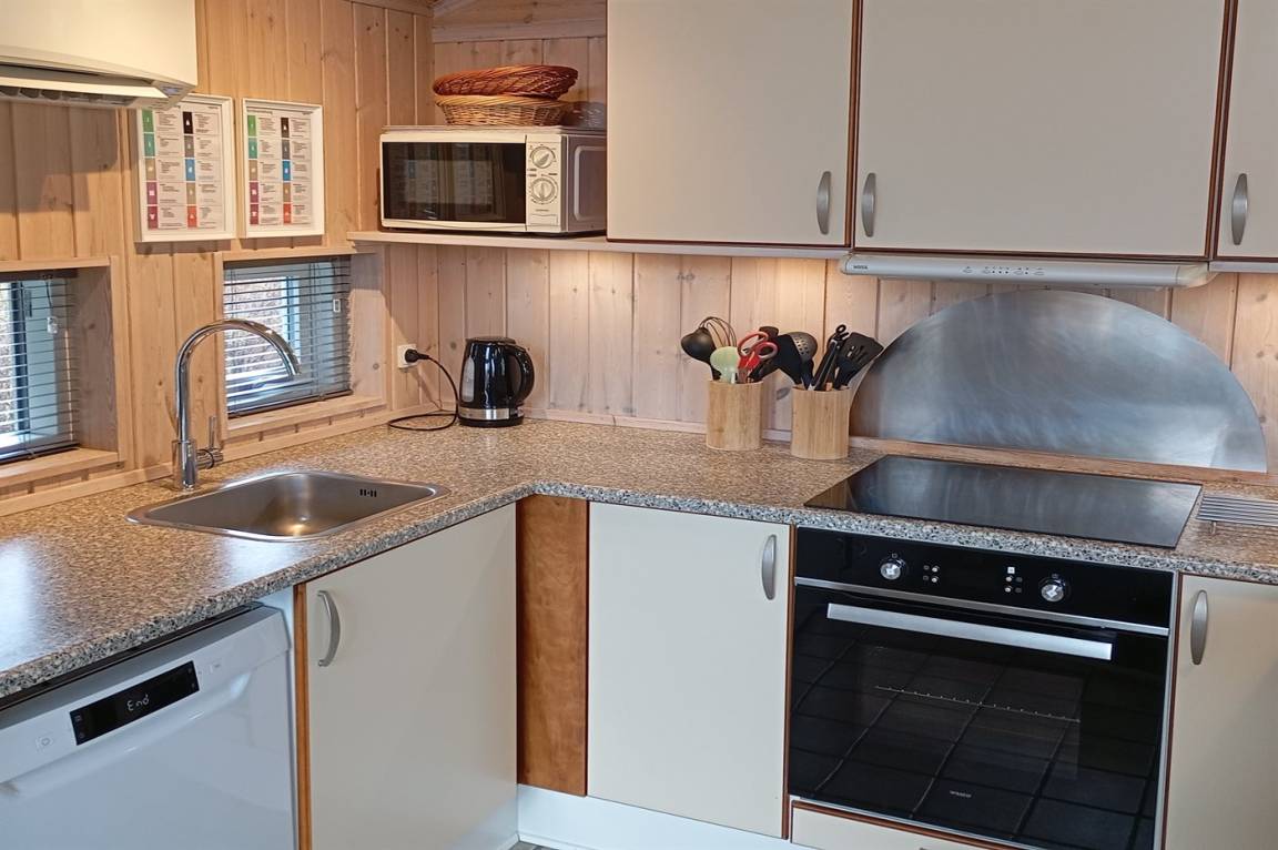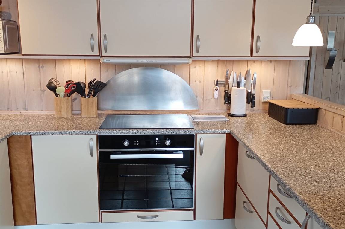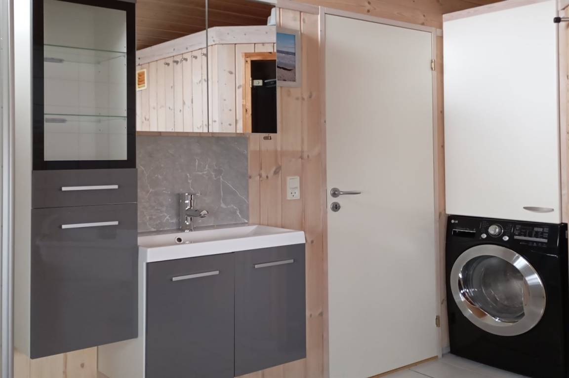 Innen gibt es schöne Holzböden sowie hell gebeizte Holzwände und -decken. Das herrliche Badezimmer hat beheizbaren Klinkerboden, 2-Pers. Whirlpool, Duschnische und Zutritt zur Sauna. Gästetoilette. Die schöne und gut ausgestattete Küche enthält u. a. Geschirrspüler, Mikrowelle, große Tiefkühltruhe und großen Kühlschrank, und Herd mit Warmluftofen und Ceran-Feld. Die Küchenabteilung ist mit dem hellen und nett möblierten Wohnzimmer mit großen Fenstern kombiniert. Hier finden Sie Kaminofen, Stereoanlage mit CD-Spieler, DVD-Spieler und TV. Die Schlafplätze des Hauses verteilen sich auf 2 Zimmer mit Doppelbett und 1 Zimmer mit 2 Einzelbetten. Darüber hinaus gibt es Alkoven mit 2 Schlafplätzen im Wohnzimmer sowie offenes Obergeschoss mit 2 Schlafplätzen für Kinder.