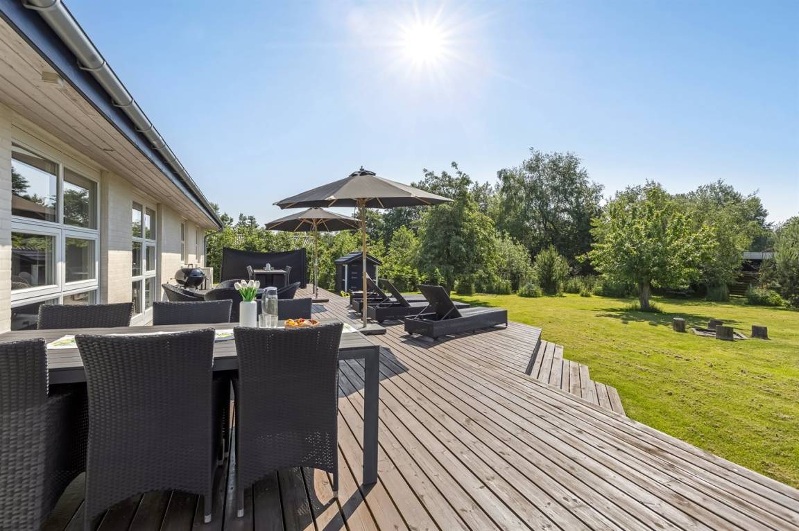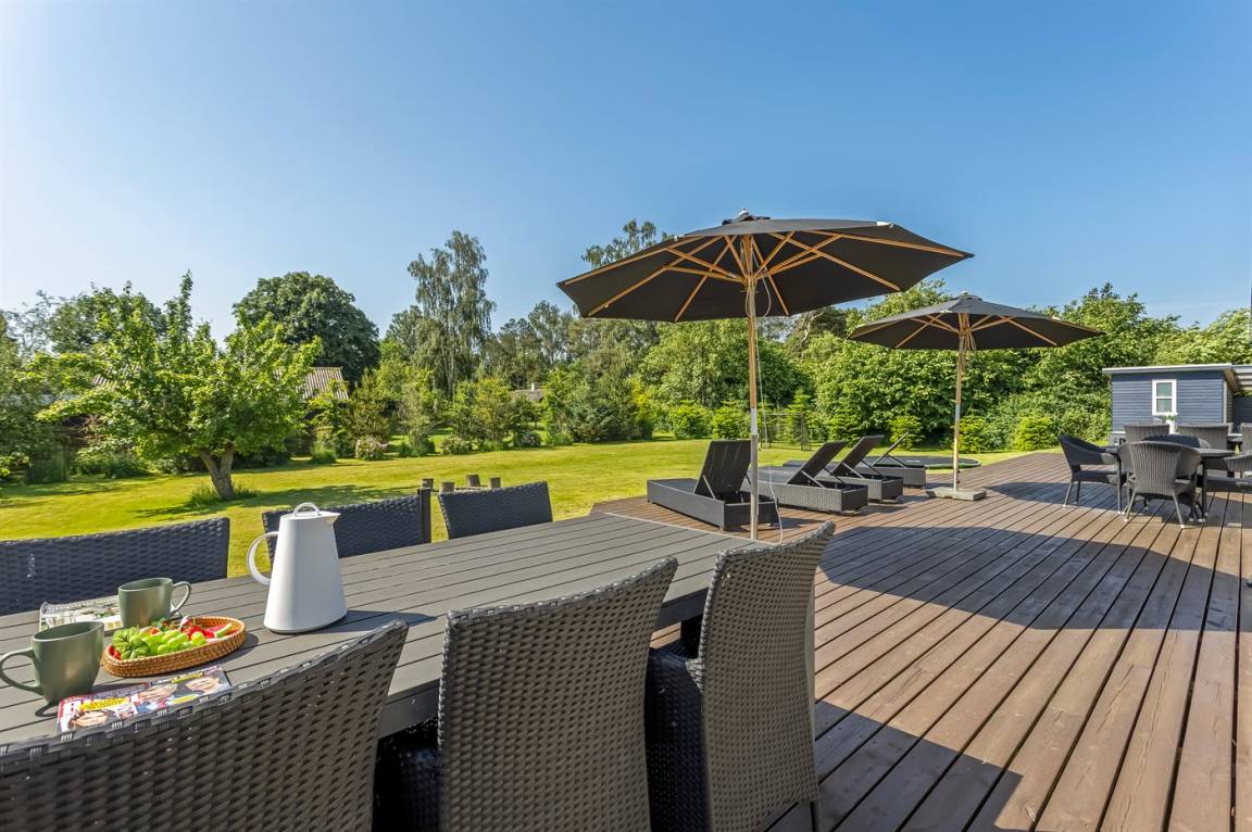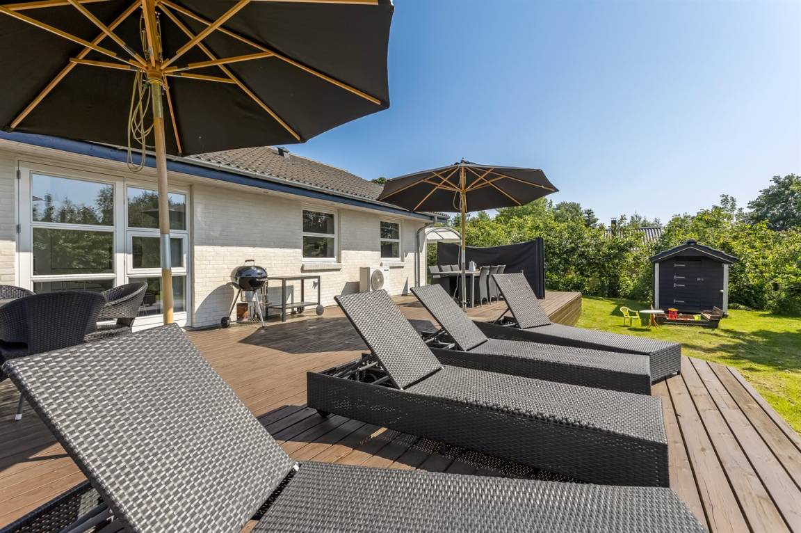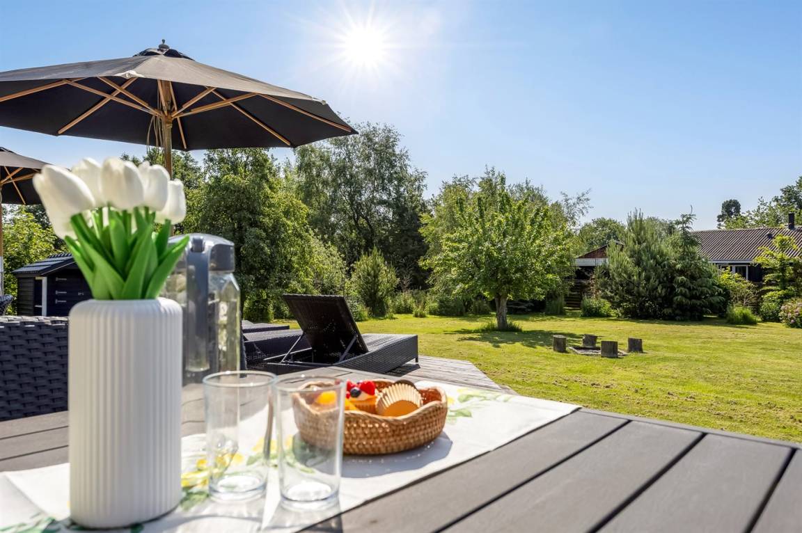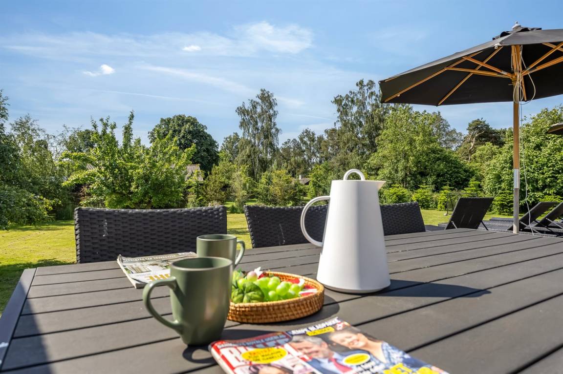 Zum Haus gehört eine schöne Terrasse mit Gartenmöbeln und Grill, wo du viele Stunden im Freien verbringen kannst. Auf dem großen Grundstück gibt es viel Platz für Ballspiele und andere Aktivtäten im Freien.