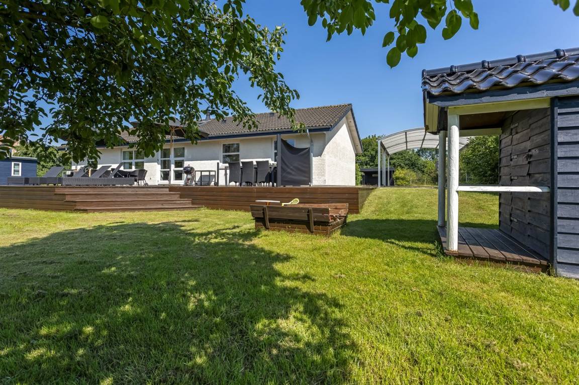 DraußenDie Ferienunterkunft liegt auf einem 1900 m² großen Gartengrundstück. Die Entfernung zum Meer beträgt 200 m. Die nächste Einkaufsmöglichkeit liegt 100 m entfernt. In einem Abstand von 2000 m gibt es einen Golfplatz. Es steht ein 100 m² Terrassenareal zur Verfügung. Sandkasten. Kinderspielhaus. Trampolin. Fußballtor. Die Entfernung zu einem Spielplatz beträgt 100 m.Lagerfeuerstelle. Es steht ein Grill zur Verfügung. Es steht ein Carport zur Verfügung. Parkplatz auf dem Grundstück.