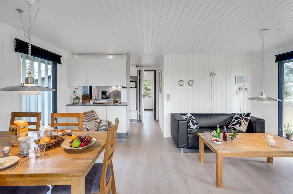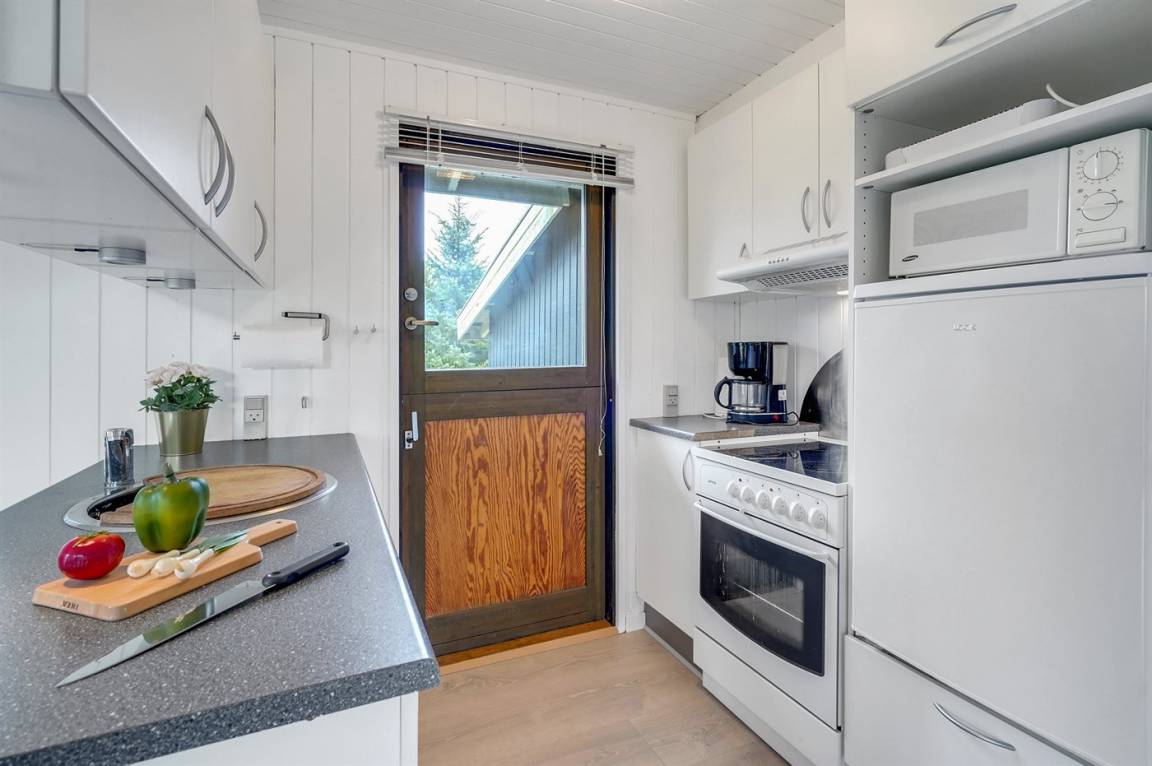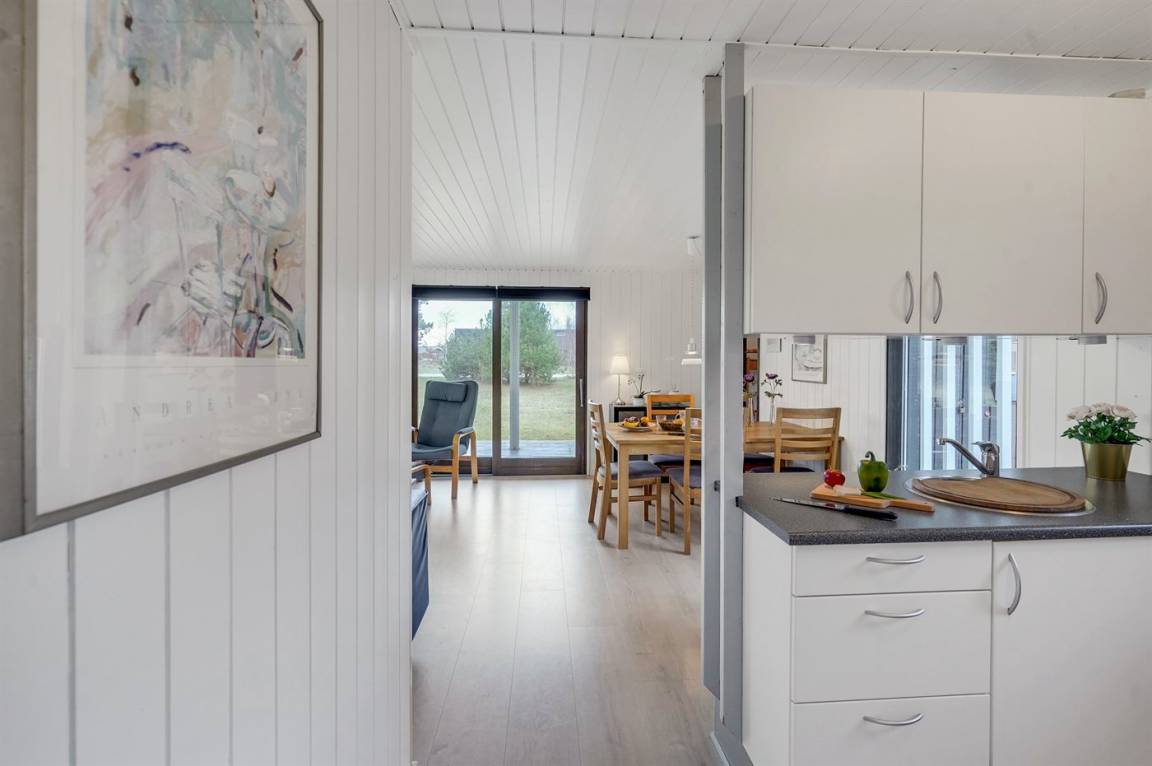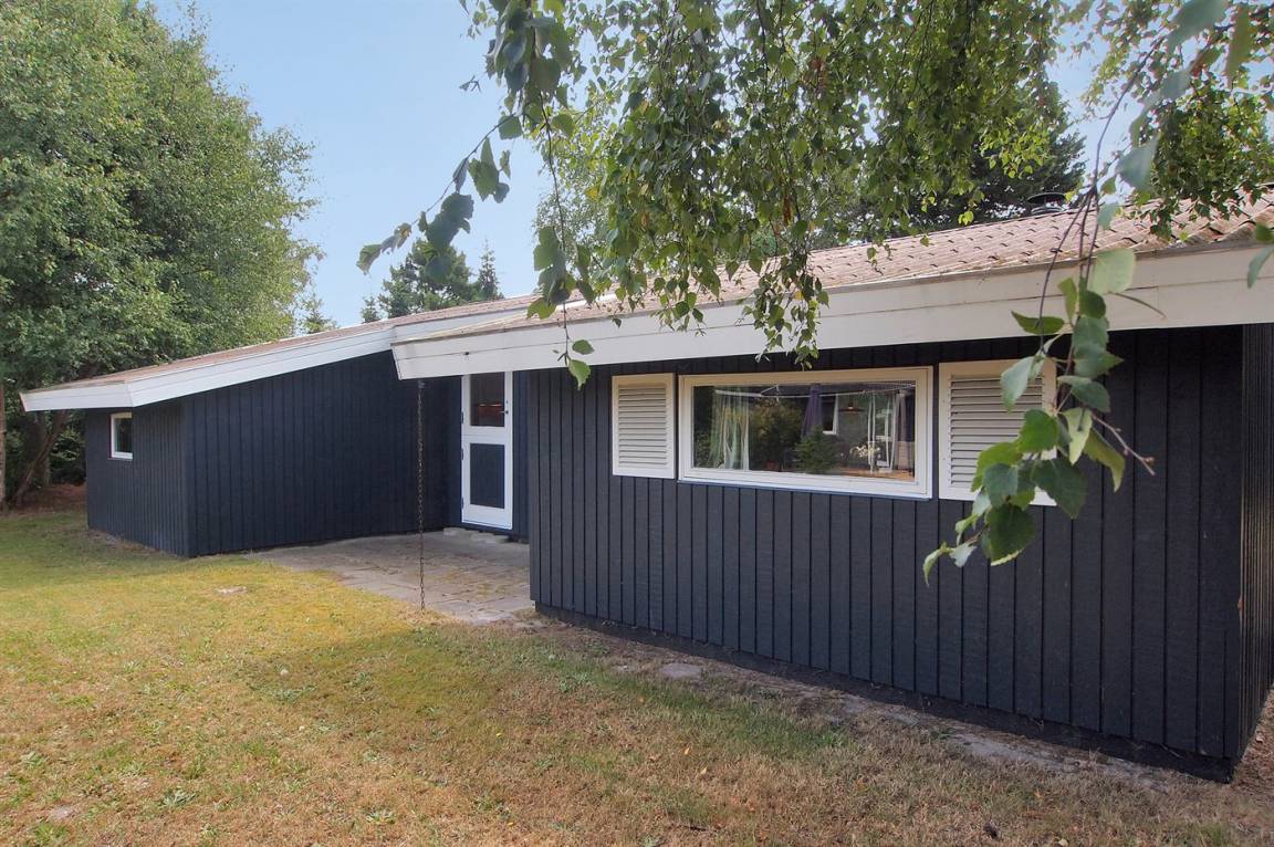 Älteres, gemütliches Ferienhaus aus Holz gelegen auf einem großen Grundstück mit Platz für Spielen. Küche ist mit dem Wohnzimmer kombiniert. Zum Haus gehört eine überdachte Terrasse mit Gartenmöbeln. Das Haus ist laufend modernisiert worden.