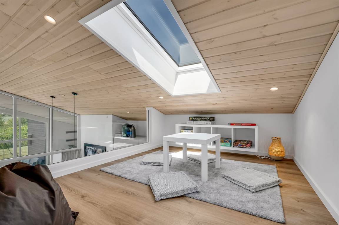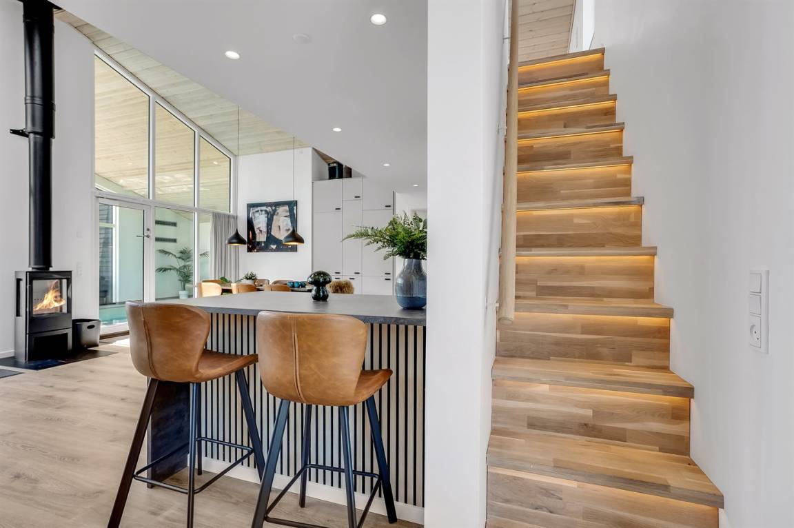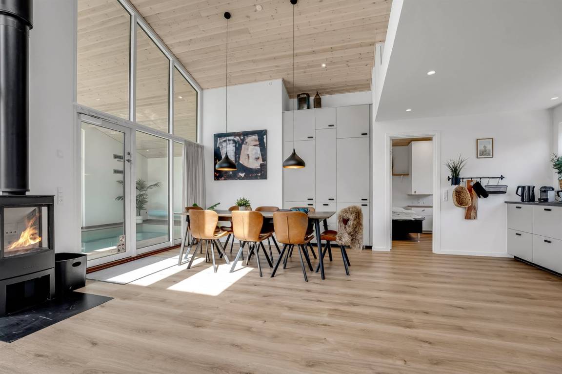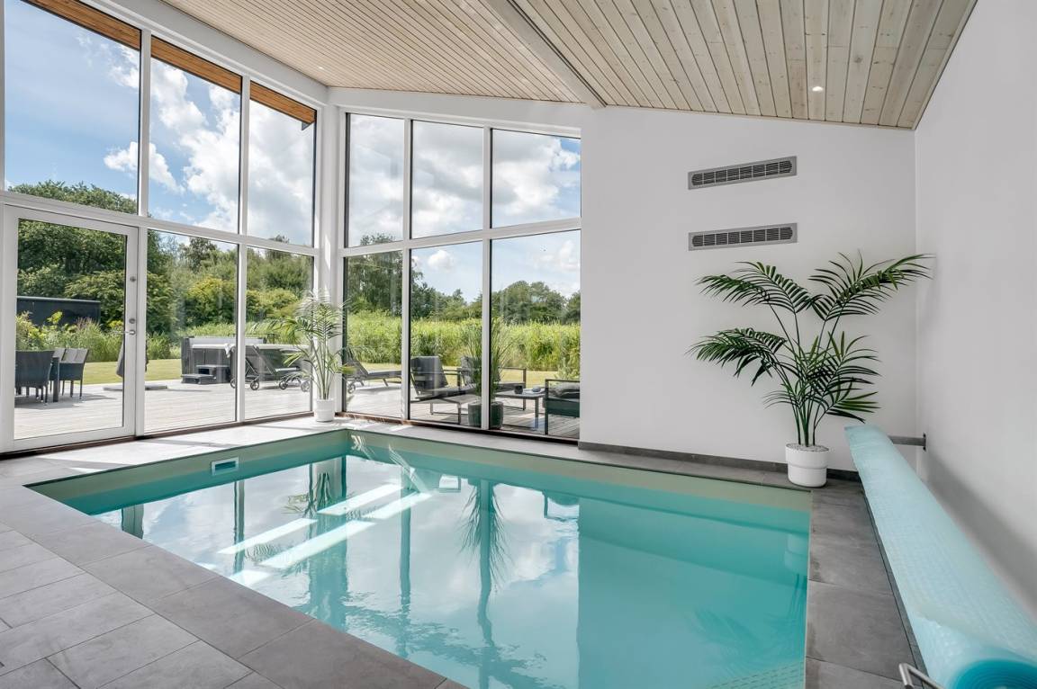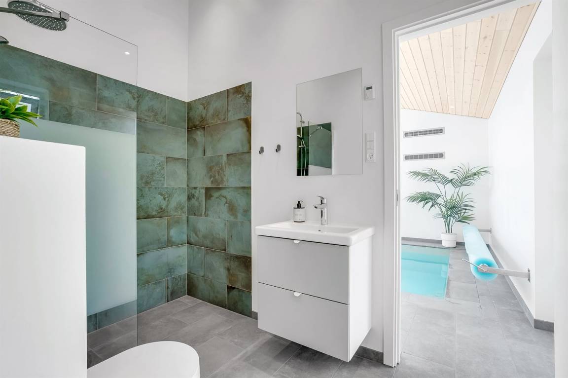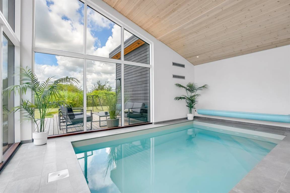 Der Mittelpunkt des Hauses ist die helle, moderne Wohnküche mit Panoramafenster zur herrlichen Terrasse sowie der einladende Innen-swimmingpool mit eingebauter Treppe und mehrfarbiger LED-Beleuchtung – ideal für Spiel, Spaß und gemeinsame Zeit mit der ganzen Familie.