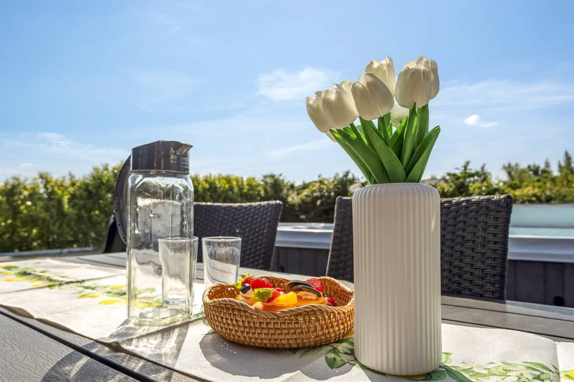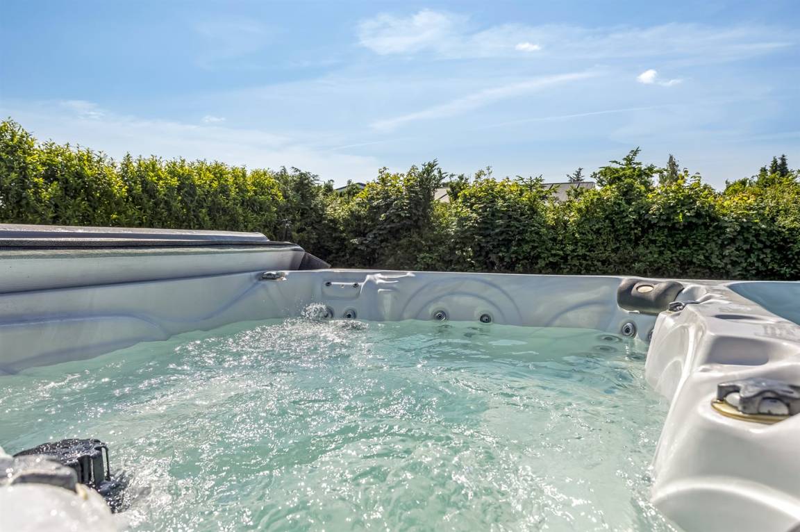 Draußen erwarten dich großzügige überdachte und offene Terrassen, auf denen du viele Stunden entspannen, die Sonne genießen und grillen kannst – oder zu jeder Jahreszeit im Whirlpool relaxen. Auf dem Grundstück gibt es eine Boulebahn, eine Schaukel, eine Feuerstelle und ein Trampolin (Nutzung auf eigene Verantwortung/eigene Versicherung). Außerdem findest du draußen einen Fischreinigungstisch mit Wasserhahn.