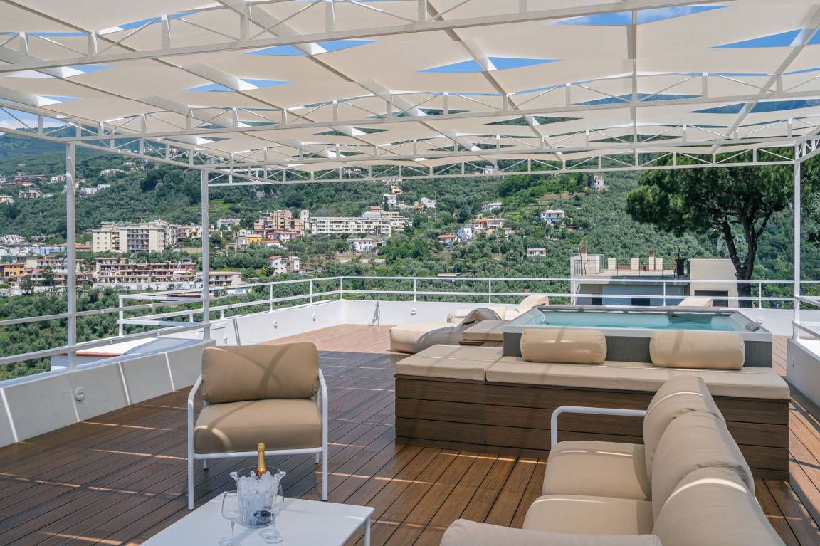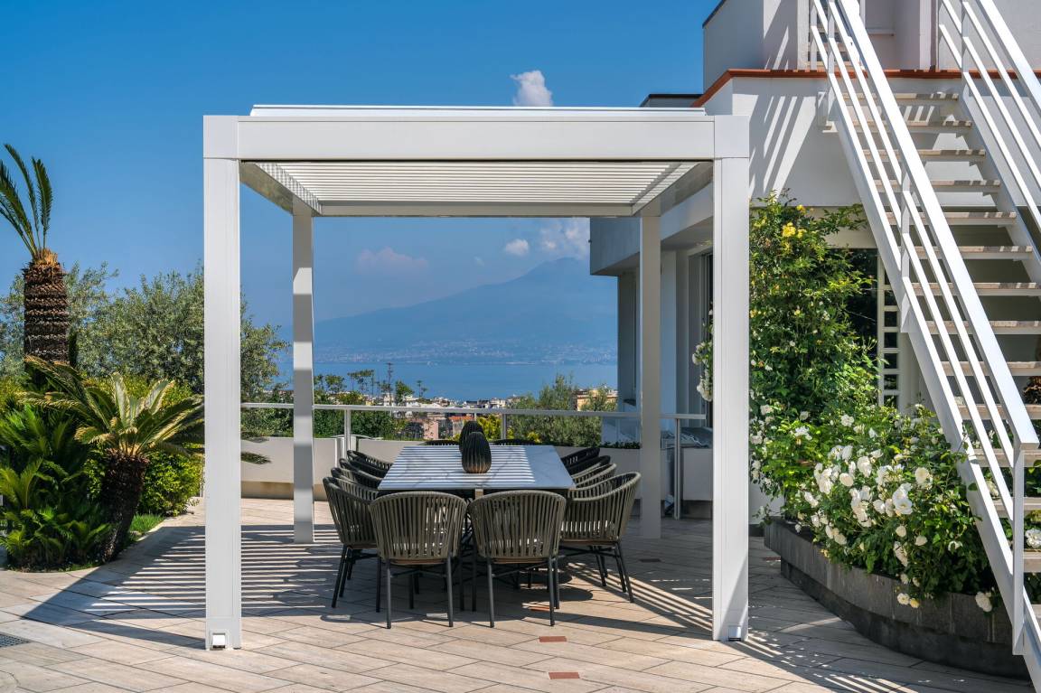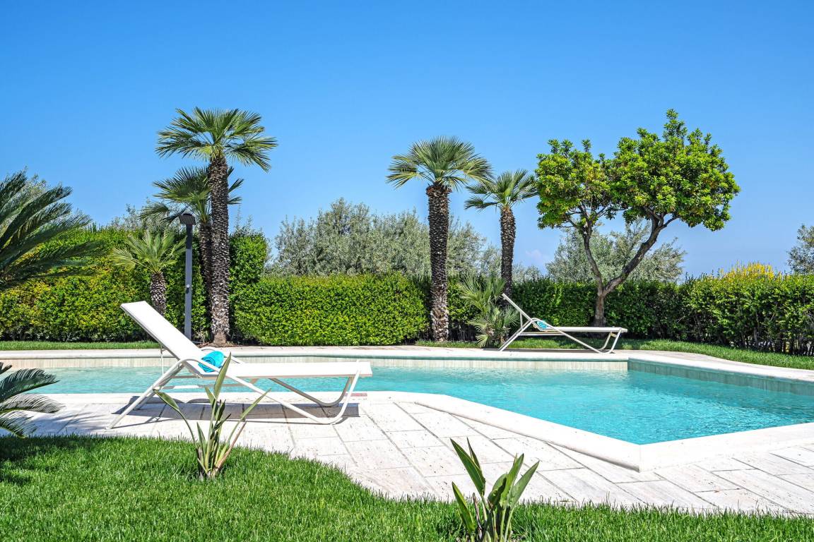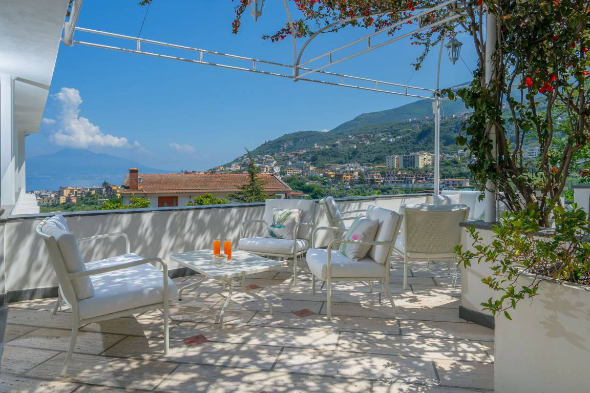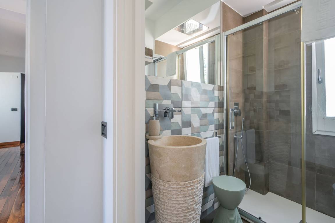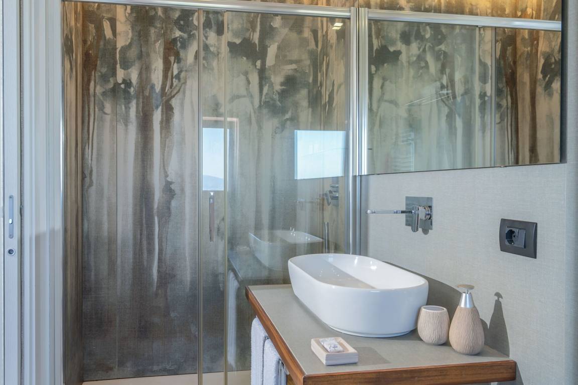 Erster Stock: 2 Doppelzimmer, jeweils mit privatem Bad mit Dusche, Doppelzimmer (das Doppelbett kann auf Wunsch in 2 Einzelbetten geteilt werden) mit privatem Bad mit Dusche, Suite mit Vorraum mit Doppelschlafcouch und Hauptschlafzimmer mit Doppelbett und privatem Bad mit Whirlpool-Badewanne und Dusche. Jedes Zimmer verfügt über einen Smart-TV mit Glasfaser-WLAN-Anschluss und eine Terrasse mit Tisch und Stühlen (zwei Terrassen haben Meerblick und zwei haben Garten- und Schwimmbad-Blick).