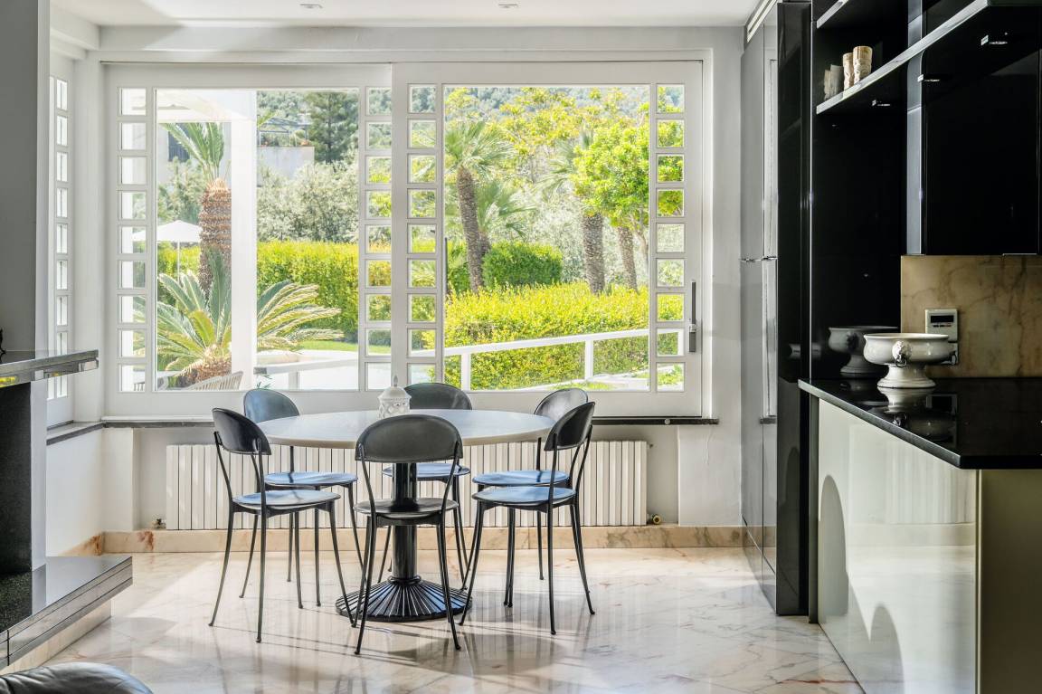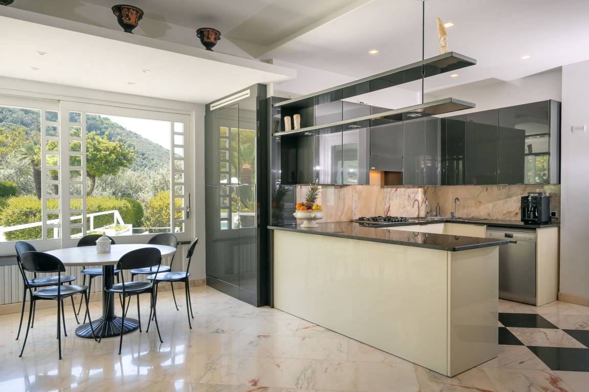 Erdgeschoss: Eingang zum großen Wohnzimmer, Essbereich und Küche (4-Flammen-Gasherd, Backofen, Kaffeebohnenmaschine, Wasserkocher, Geschirrspüler, Mikrowelle, Elektroherd, elektrische Crêpespfanne, Zitruspresse elektrisch, amerikanische Kaffeemaschine, Mixer), WC, Waschküche mit Waschmaschine. Von dieser Etage aus hat man Zugang zu einer schönen Veranda mit Panoramafenstern (ein Raum, der mit Klimaanlage und Heizung ausgestattet ist) und zum Essen mit einem wunderschönen Panoramablick ausgestattet ist.