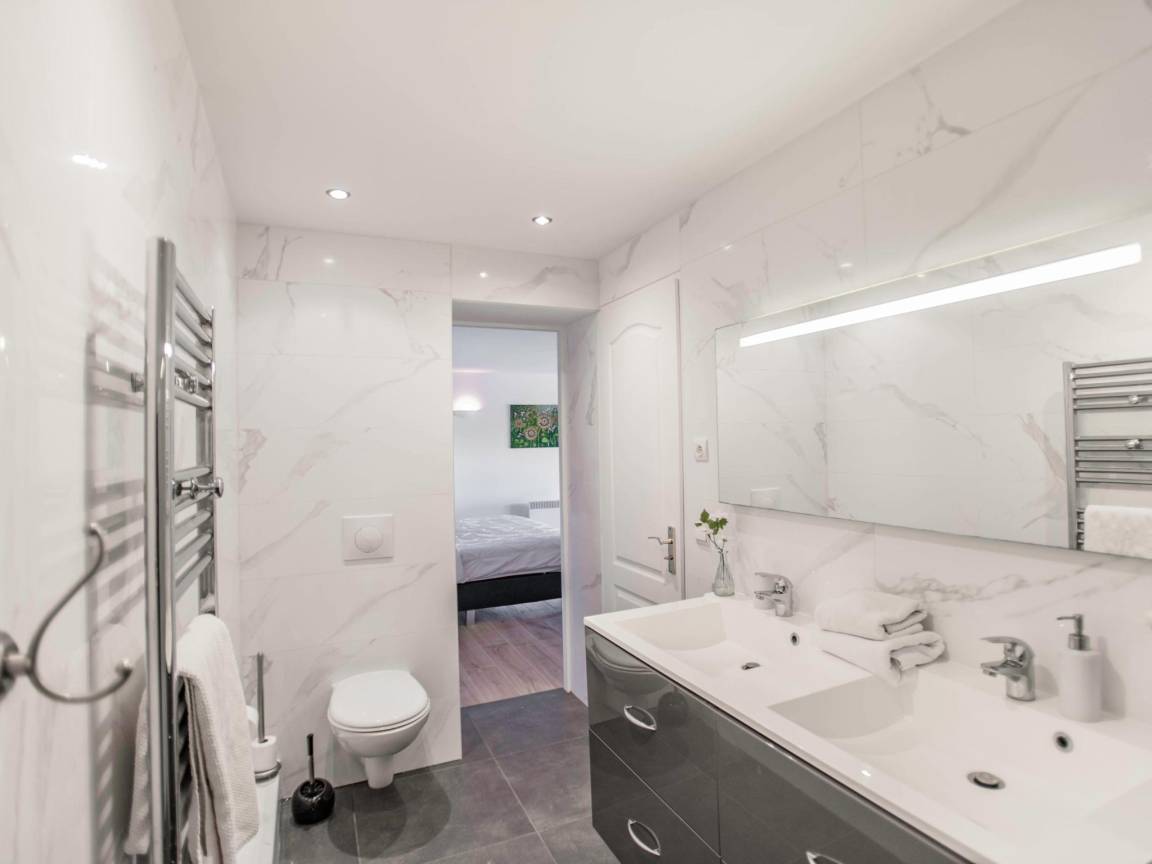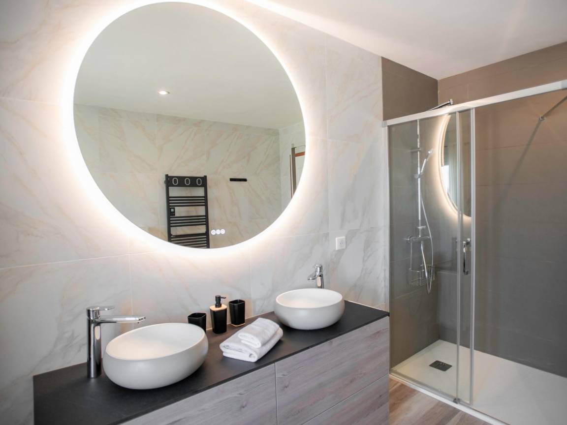 In der 1. Etage: Eingang mit Toilette , Küche mit Wasserkocher, Toaster, Kochherd(4 Kochplatten, Induktion), Dunstabzugshaube, Kaffeemaschine(cups, pads), Backofen, Mikrowelle, Geschirrspüler, Kühl-/Gefrierkombination, Stabmixer , Wohn/Esszimmer mit TV(Kabel, Flatscreen, internationale TV-Kanäle), Esstisch(8 Personen), Dekokamin, Sitzecke, DVD-Player, Klimaanlage , Schlafzimmer mit Doppelbett(Boxspring, 180 x 200 cm), Klimaanlage , Schlafzimmer mit Doppelbett(180 x 200 cm), Klimaanlage , Badezimmer mit Badewanne, Dusche, 2x Waschbecken, Toilette , Badezimmer mit Dusche, Waschbecken , Balkon oder Terrasse