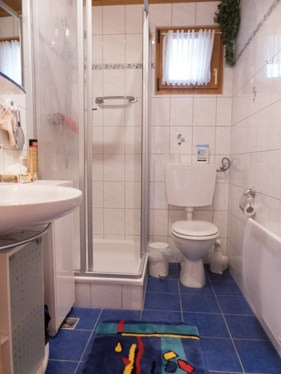 Badezimmer mit Dusche, WC und Waschtisch.