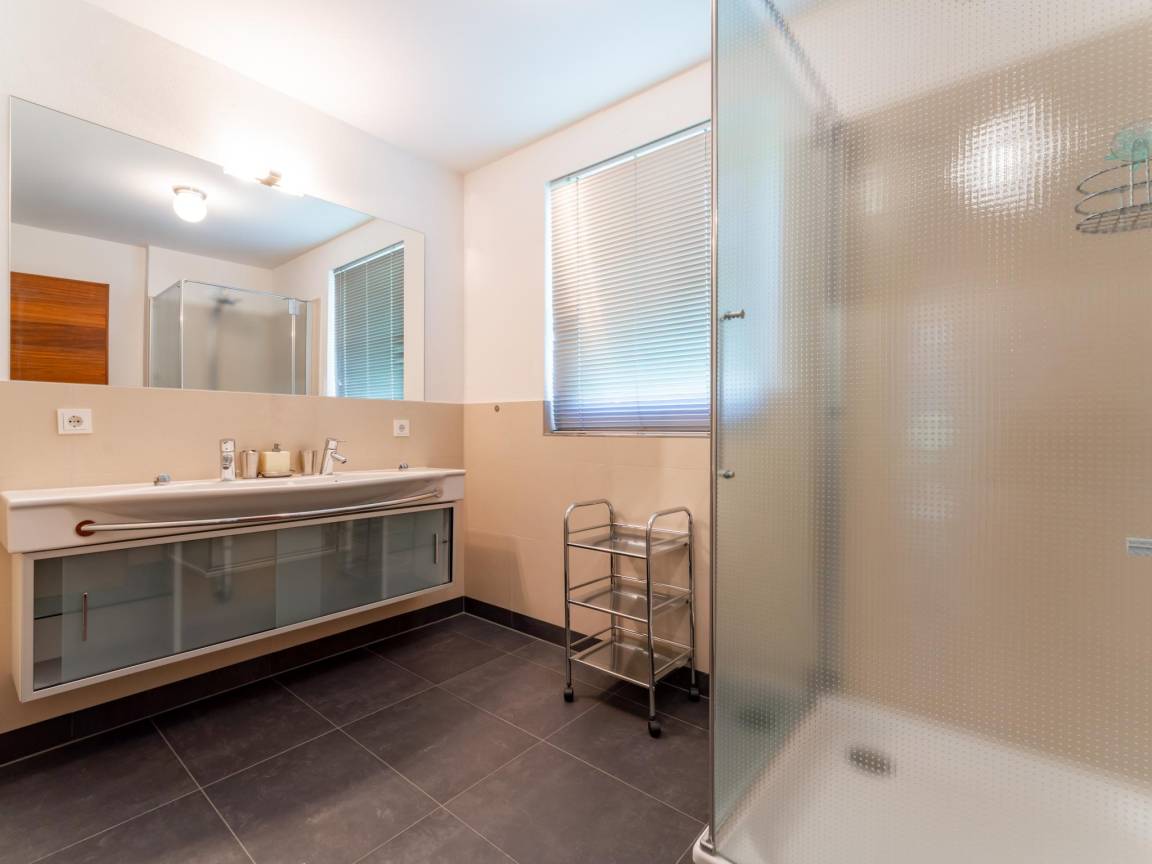 In der 2. Etage: Eingang, offene Küche mit Kochherd(4 Kochplatten), Kaffeemaschine(cups, Filter), Backofen, Geschirrspüler, Kühl-/Gefrierkombination , Wohn/Esszimmer mit TV, Esstisch(6 Personen), Kamin , 2x Schlafzimmer mit Doppelbett , Schlafzimmer mit Badezimmer mit Doppelbett, Badewanne, Dusche, 2x Waschbecken, Toilette , Badezimmer mit Dusche, 2x Waschbecken , Abstellraum, Toilette