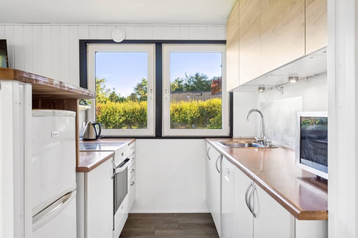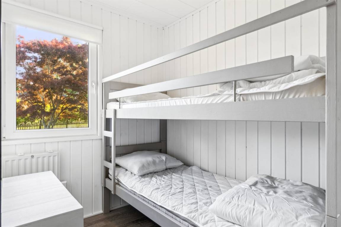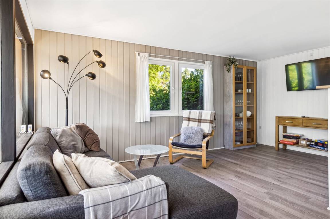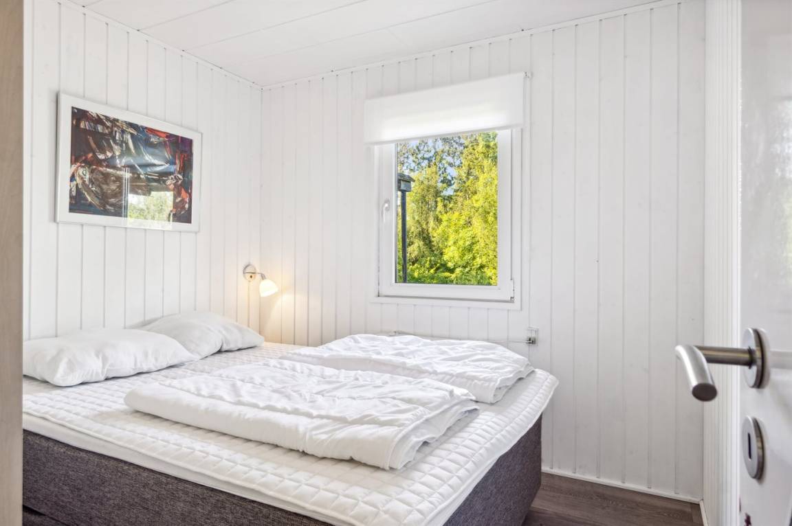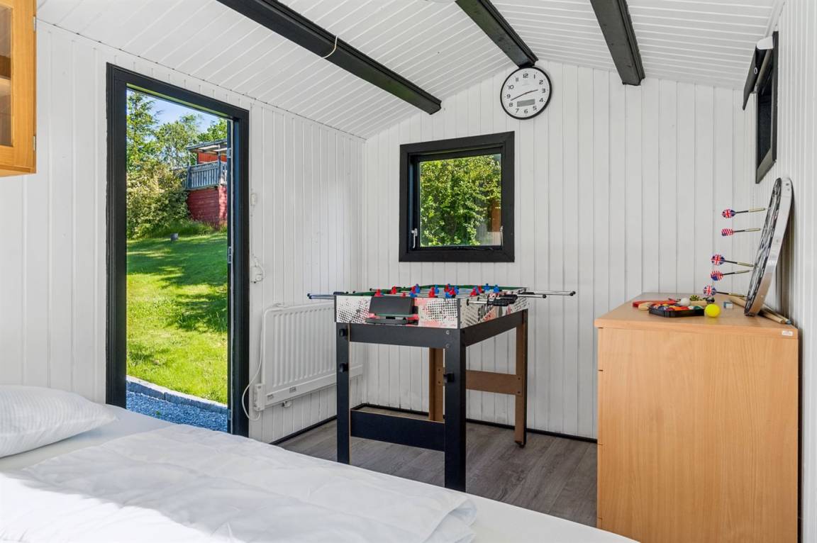 Im hellen Wohnbereich des Ferienhauses, der offen mit der Küche verbunden ist, hast du reichlich Gelegenheit, es dir gemütlich zu machen. Von hier aus gelangst du auf die schöne überdachte Terrasse mit einem tollen Blick auf den Garten. Im Haus gibt es 2 Schlafzimmer: eines mit einem Doppelbett und eines mit einem Etagenbett für zwei Personen. Im gemütlichen Anbau im Garten stehen dir weitere 2 Schlafplätze in einem Doppelbett zur Verfügung.