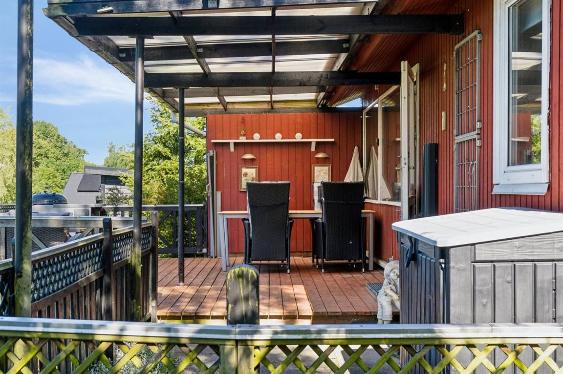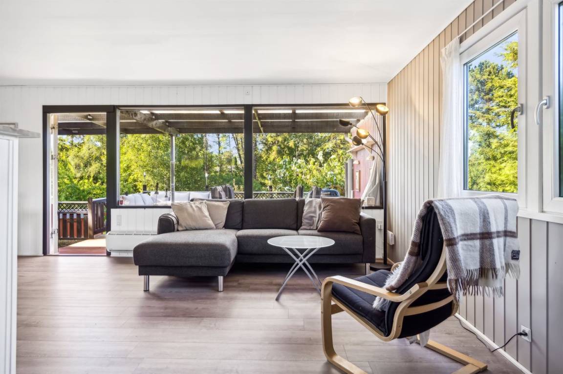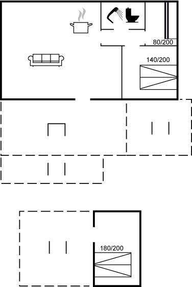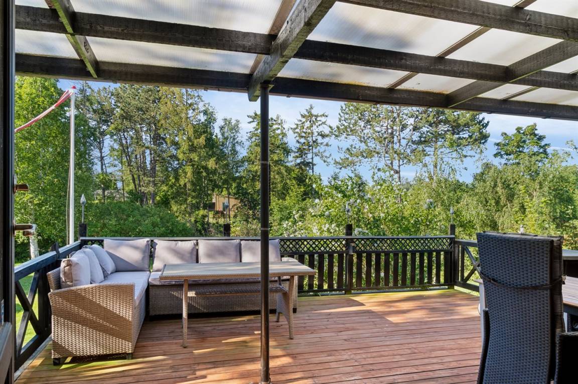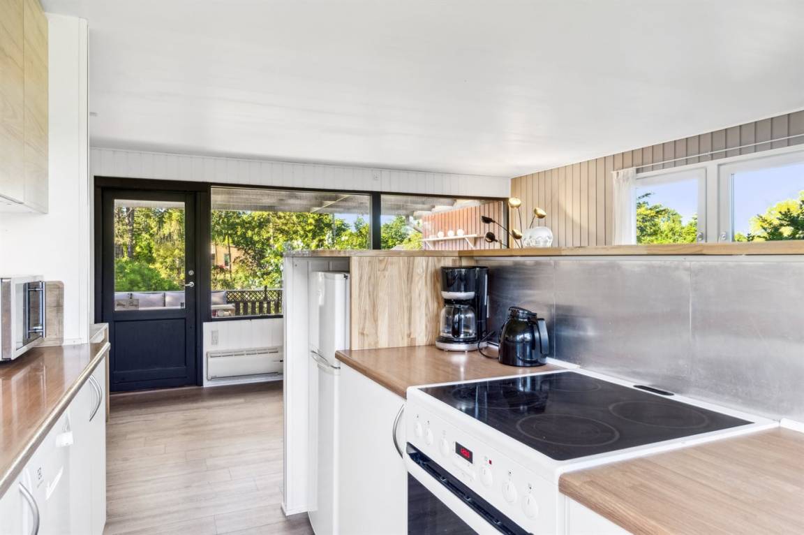 Im hellen Wohnbereich des Ferienhauses, der offen mit der Küche verbunden ist, hast du reichlich Gelegenheit, es dir gemütlich zu machen. Von hier aus gelangst du auf die schöne überdachte Terrasse mit einem tollen Blick auf den Garten. Im Haus gibt es 2 Schlafzimmer: eines mit einem Doppelbett und eines mit einem Etagenbett für zwei Personen. Im gemütlichen Anbau im Garten stehen dir weitere 2 Schlafplätze in einem Doppelbett zur Verfügung.