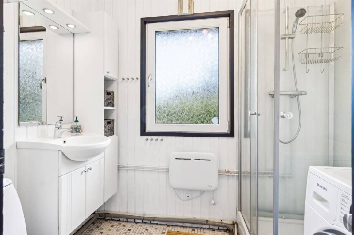 Das Badezimmer verfügt über eine Duschniche, und eine Waschmaschine ist ebenfalls vorhanden. Das Haus wird energieeffizient mit einer Luft-Luft-Wärmepumpe beheizt, während im Anbau ein Elektroheizkörper vorhanden ist.