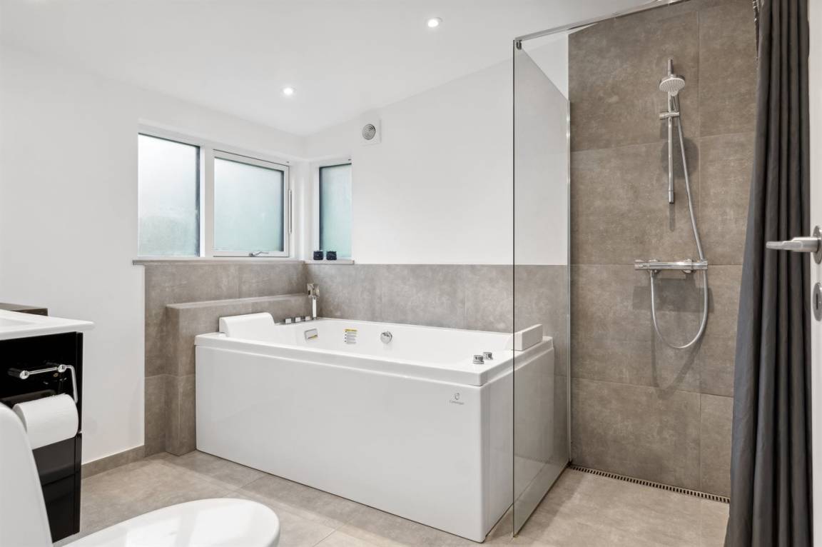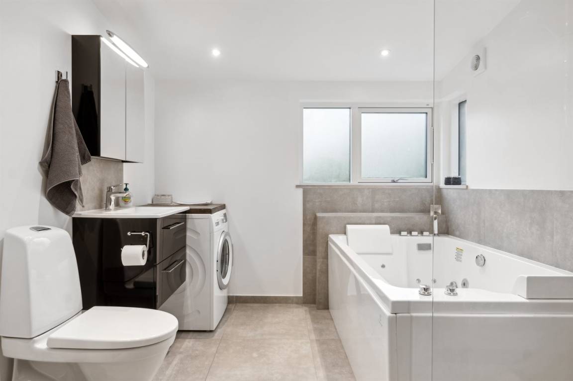 Das große moderne Küchen- und Wohnzimmer in offener Verbindung bietet die besten Möglichkeiten, Zeit mit Freunden und Familie zu verbringen und sich zu amüsieren. Das Haus eignet sich ideal für mehrere Familien oder Generationen, da die insgesamt 4 Schlafzimmer mit Doppelbetten in 2 Schlafzimmern am jeweiligen Ende des Hauses mit eigenen Badezimmern verteilt sind. Beide Badezimmer verfügen über eine Duschkabine und Fußbodenheizung, und im größten gibt es zusätzlich Spa, Sauna und Waschmaschine.