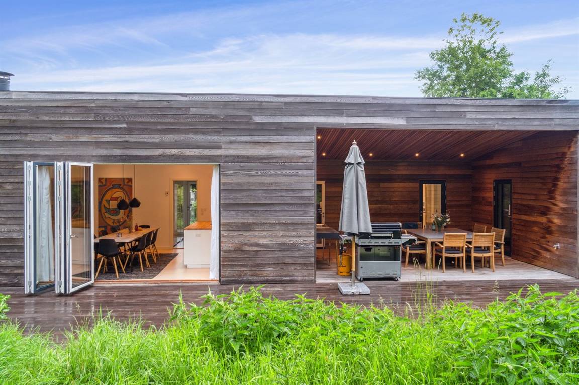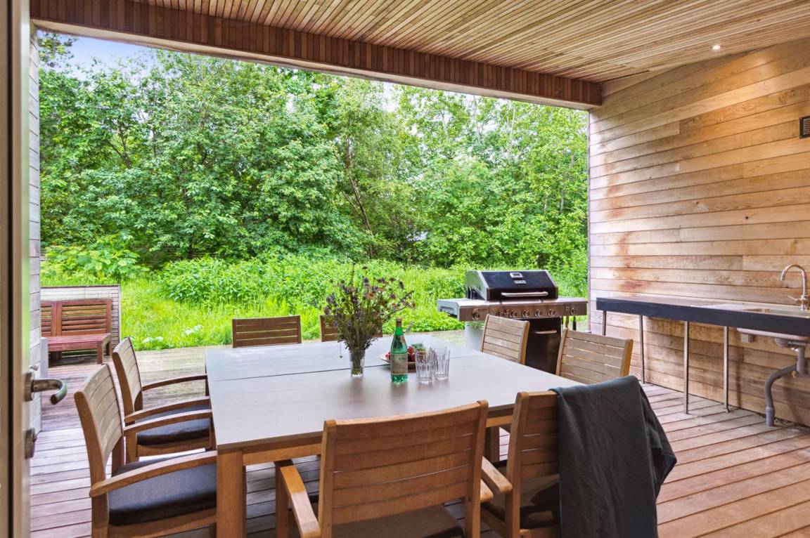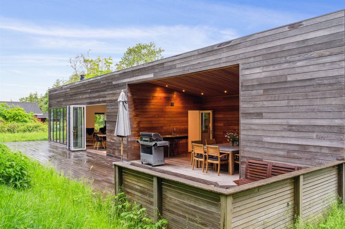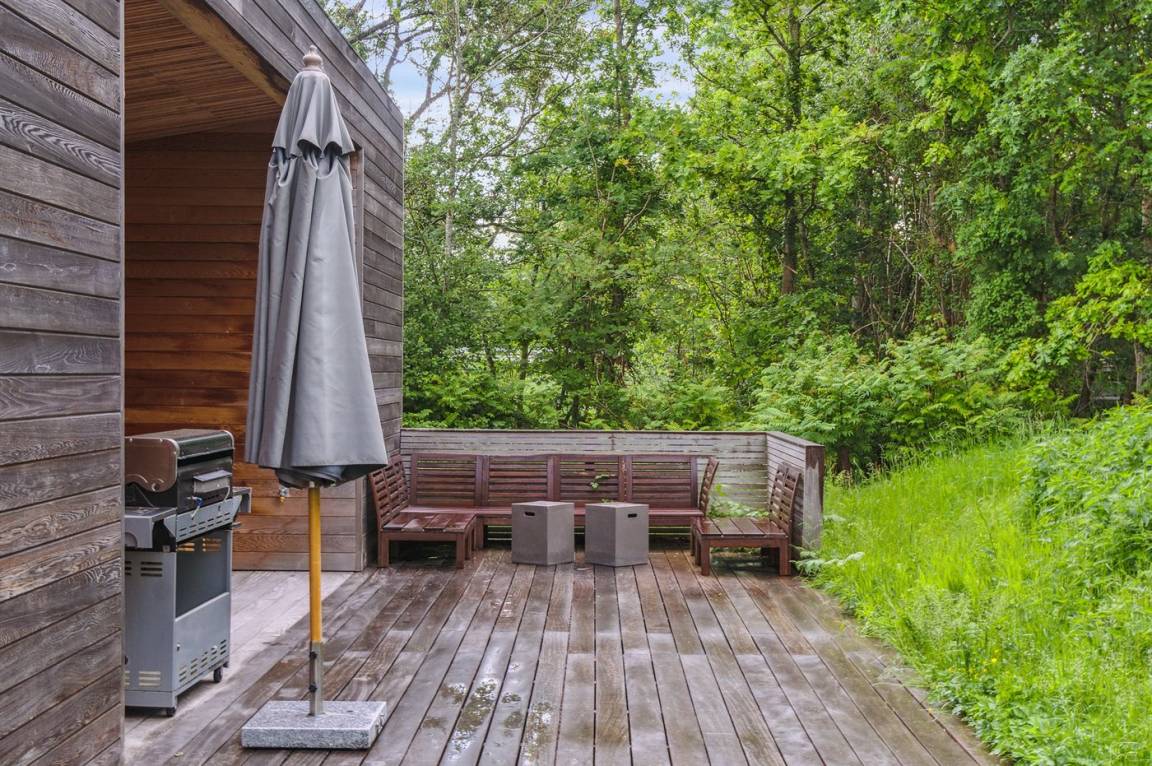 Die nach Süden ausgerichtete Holzterrasse lädt zum Entspannen und Verweilen ein, und auf dem großen überdachten Terrassenbereich mit Außenküche gibt es gute Möglichkeiten, Schatten zu finden und die langen Sommerabende zu genießen. Es gibt auch eine Außendusche.