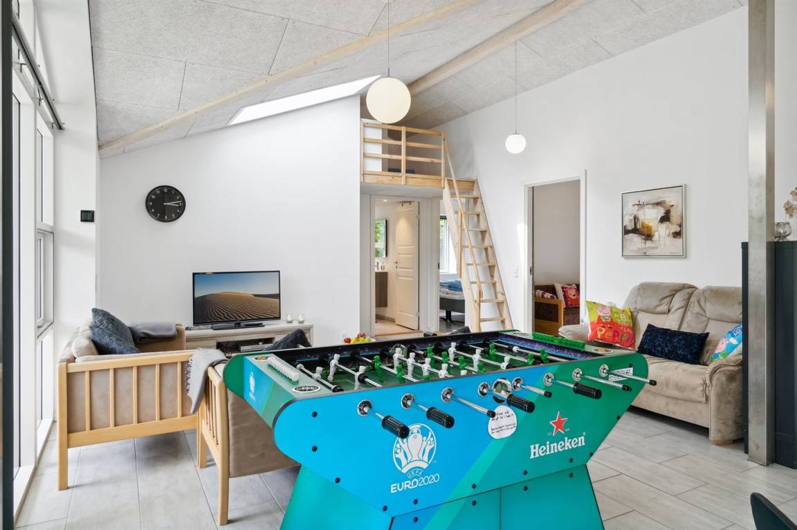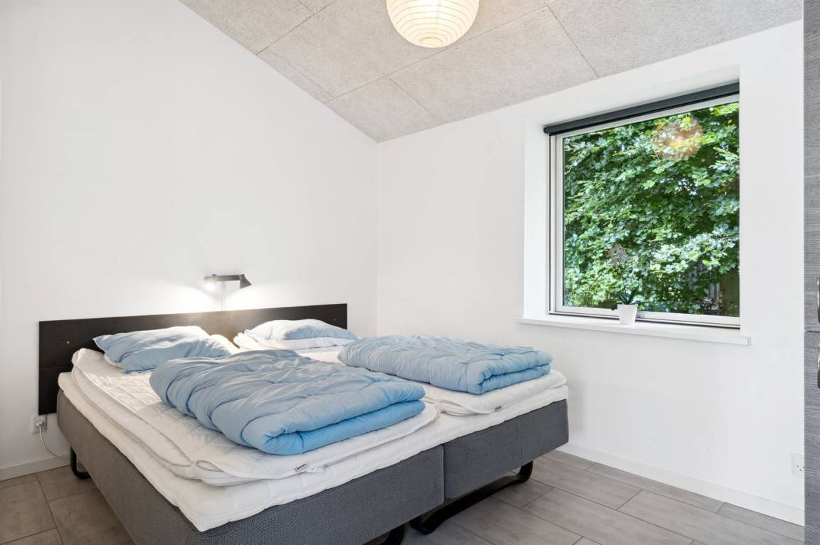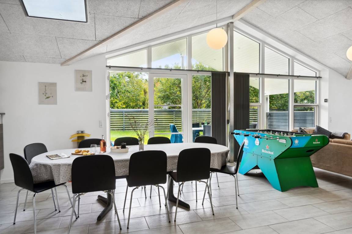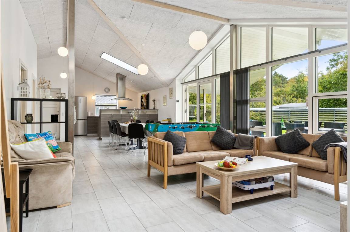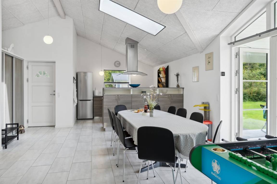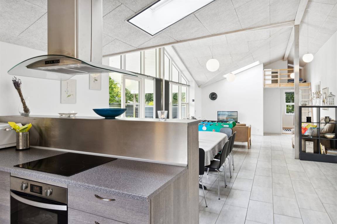 Dieses moderne Ferienhaus mit insgesamt 120 Quadratmetern und Schlafplätzen für 10 Gäste bietet viel Platz im großen Gemeinschaftsbereich mit Küche, Essbereich und Wohnzimmer in einem offenen Raum. Es gibt eine energieeffiziente Luft-Wasser-Wärmepumpe, die für Fußbodenheizung und hohen Komfort im gesamten Haus sorgen. In allen Räumen gibt es bis auf eines Badezimmer hohe Decken. Die hohe Deckenhöhe zusammen mit den großen Fensterfronten sorgen für viel Licht und Luft im Haus. Es gibt 4 Schlafzimmer, jedes mit 2 Schlafplätzen, und zusätzlich gibt es 2 Schlafplätze auf dem Hems, wo das Dachfenster für natürliches Licht sorgt. Es gibt 2 Badezimmer mit Fußbodenheizung und Duschnische, und in einem davon gibt es auch eine Sauna. Außerdem gibt es eine Waschmaschine.