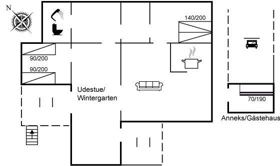 Die gemütliche Wohnküche liegt in offener verbindung mit dem Wohnzimmer, von dem aus man Zugang zum hellen Wintergarten hat, wo man viele gemütliche Stunden verbringen kann. Es gibt mehrere schöne Terrassen, auf denen man die Sonne genießen, aber auch Schutz vor dem Wind und Schatten finden kann. Eine Lagerfeuerstelle steht ebenfalls zur Verfügung.