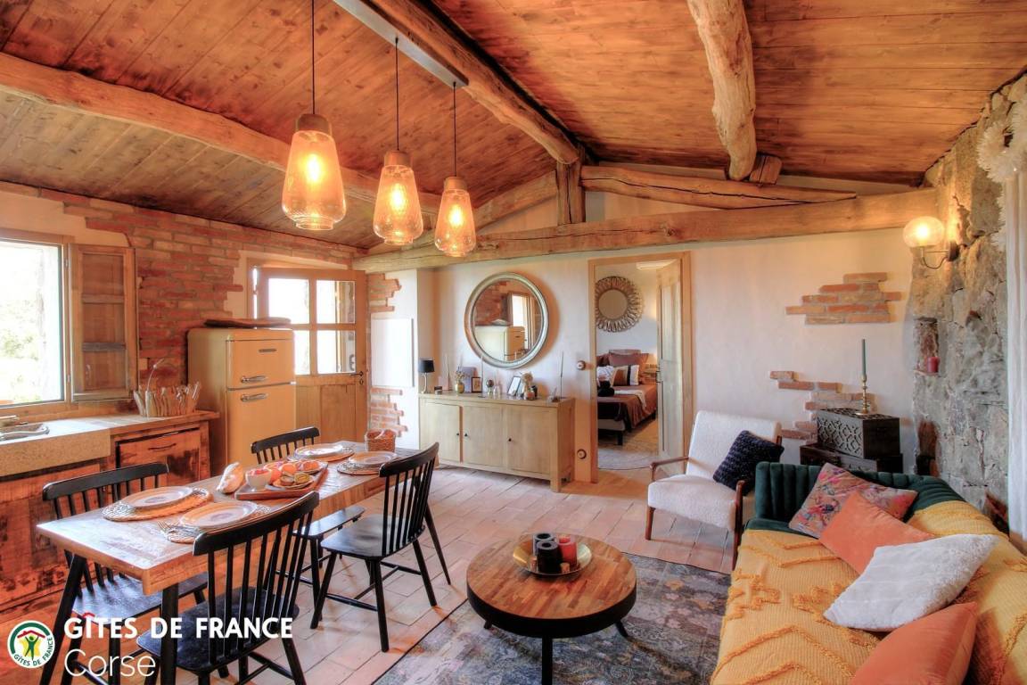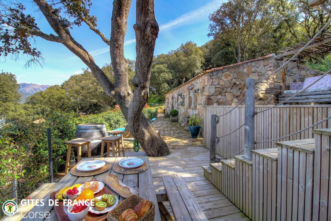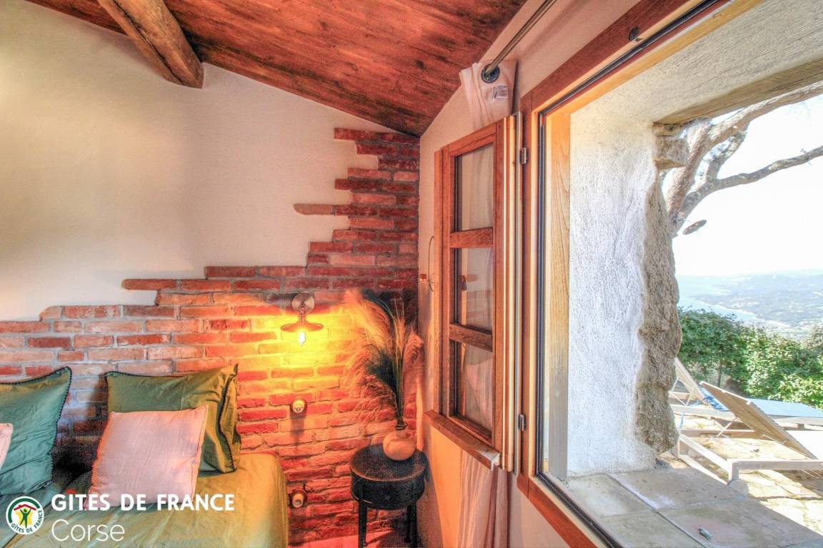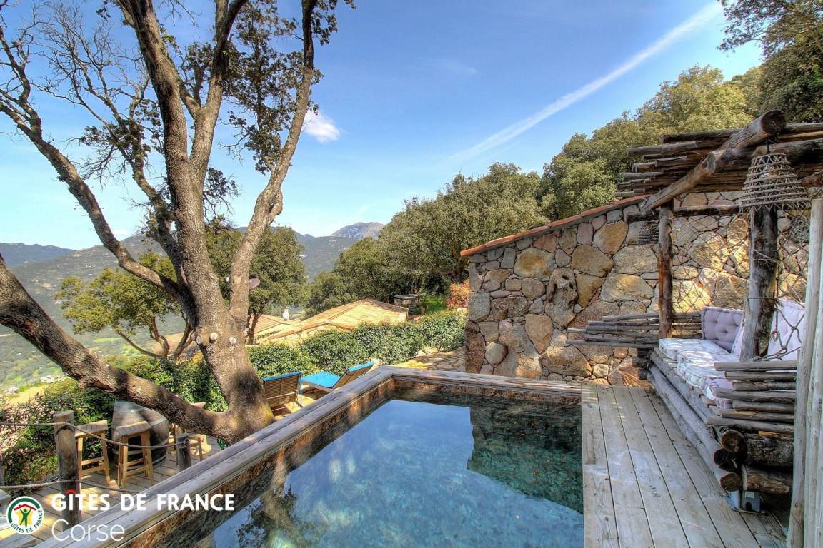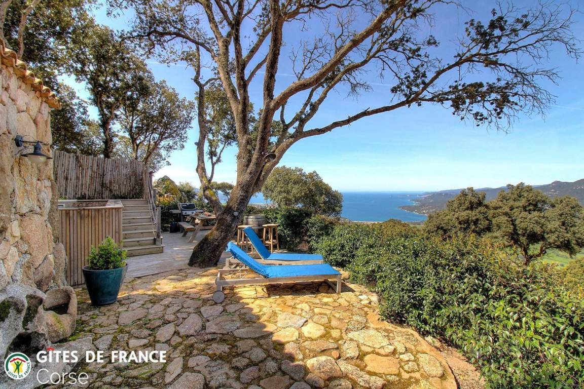 In der Macchia, auf einem Grundstück von 10 000 m² mit dem Haus der Eigentümer und zwei weiteren Ferienhäusern, mit Blick auf das Meer, unabhängiges Haus von 60 m² mit Terrasse und privatem beheiztem Pool, setzt es sich wie folgt zusammen: