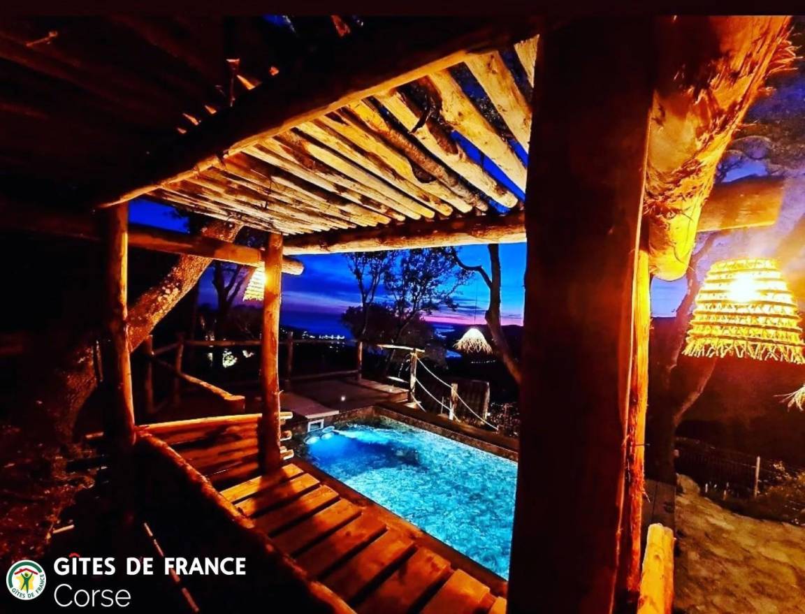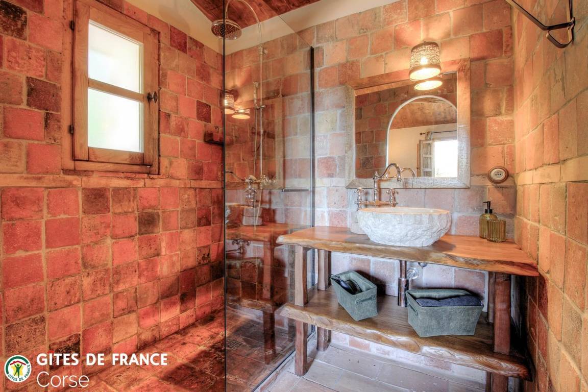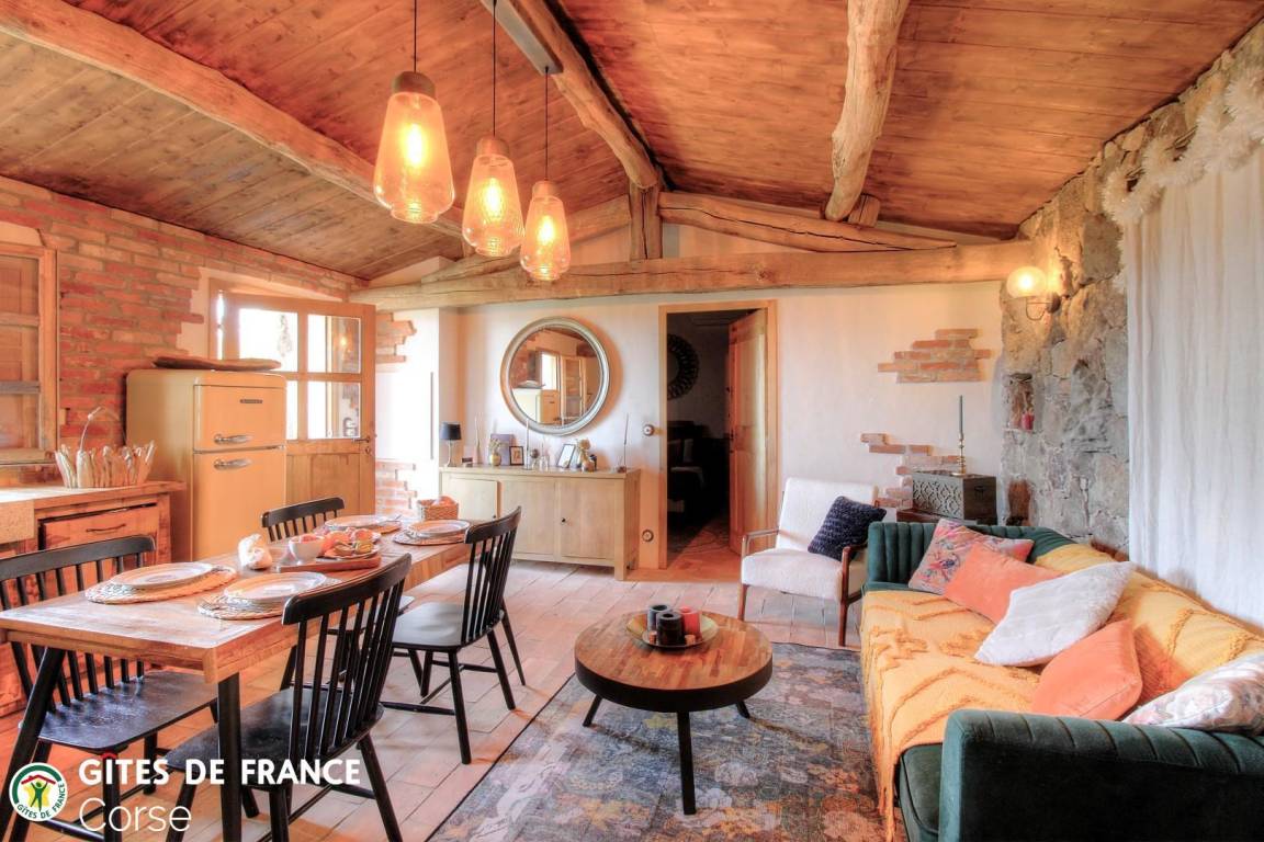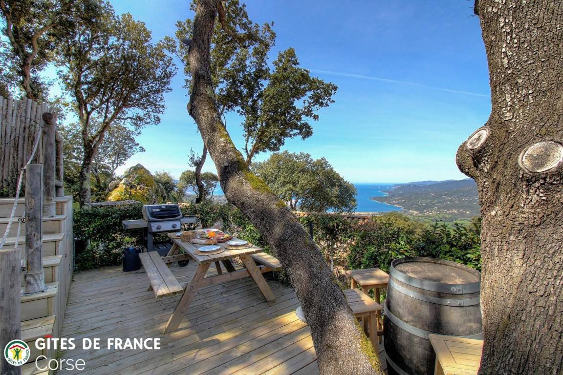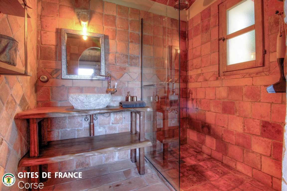 In der Macchia, auf einem Grundstück von 10 000 m² mit dem Haus der Eigentümer und zwei weiteren Ferienhäusern, mit Blick auf das Meer, unabhängiges Haus von 60 m² mit Terrasse und privatem beheiztem Pool, setzt es sich wie folgt zusammen: