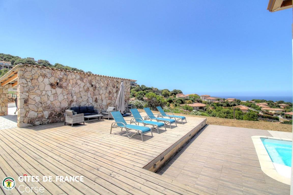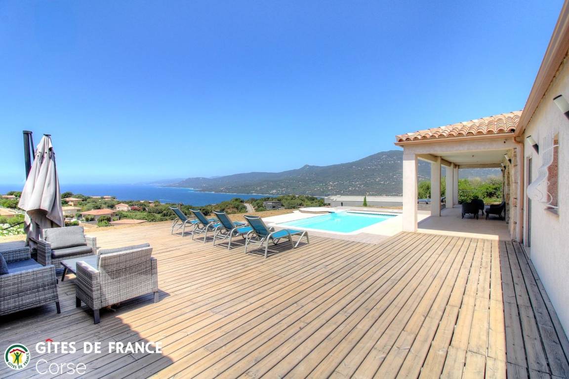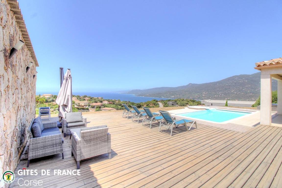 - Terrasse von ca. 200 m² mit Holz- und Fliesenboden rund um den Pool