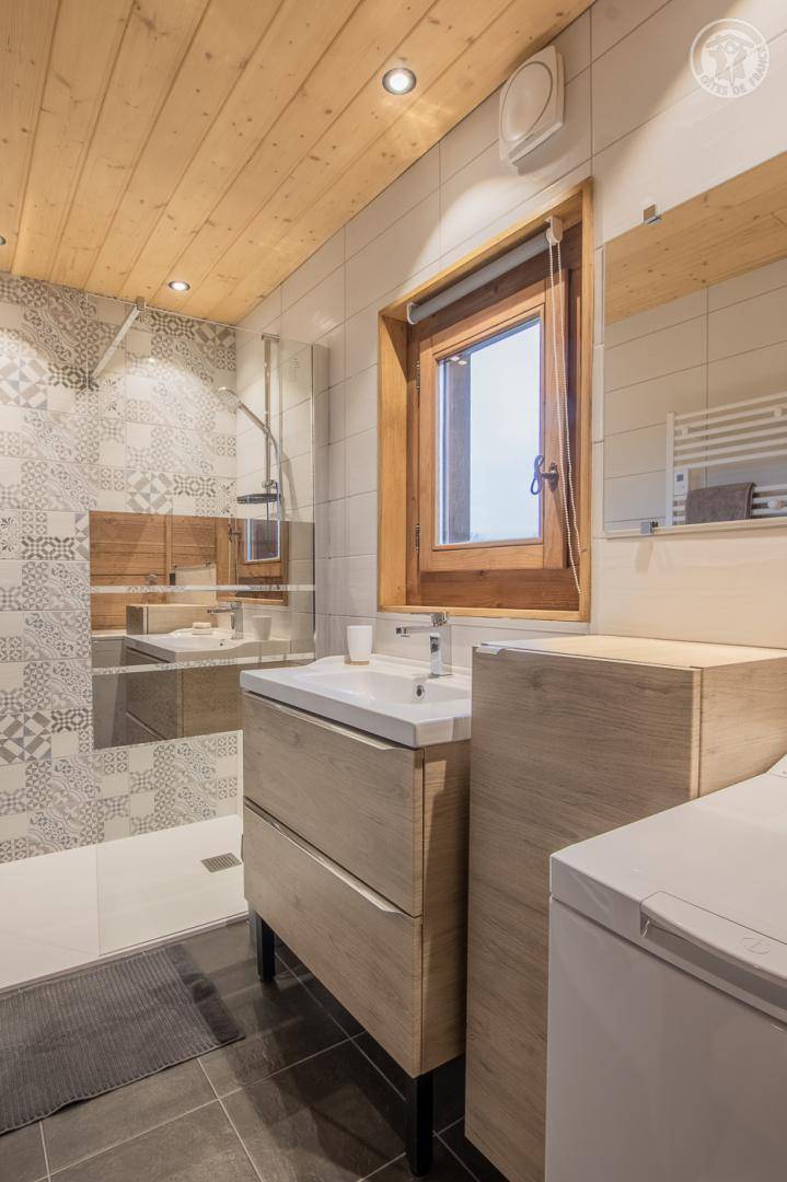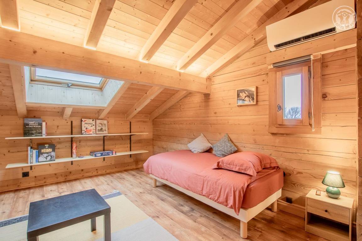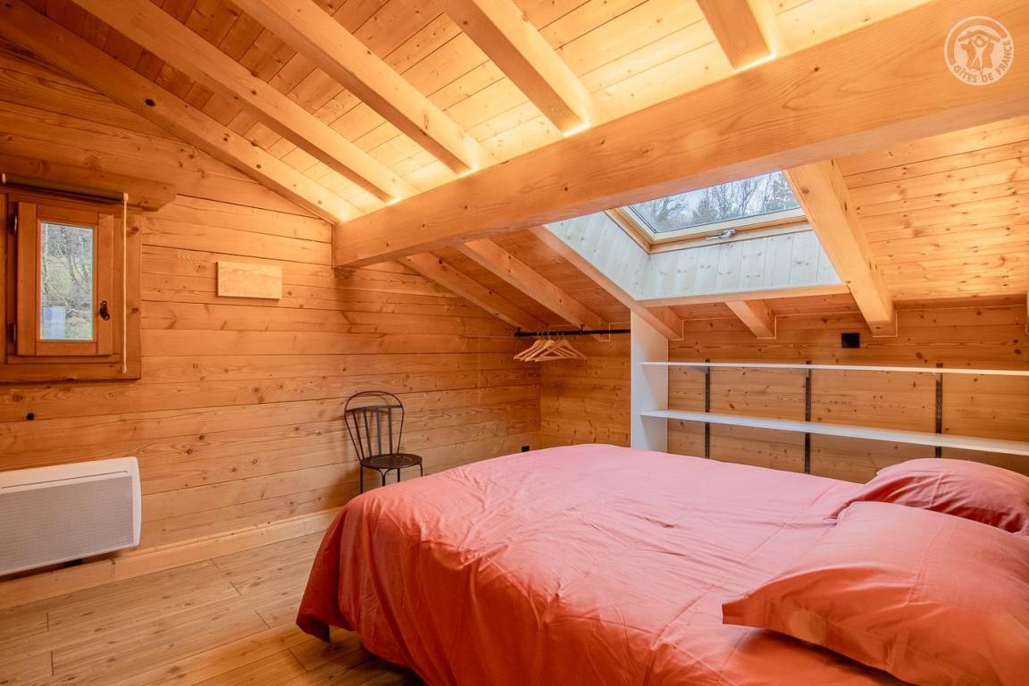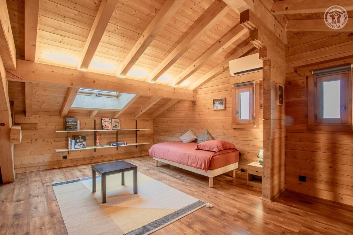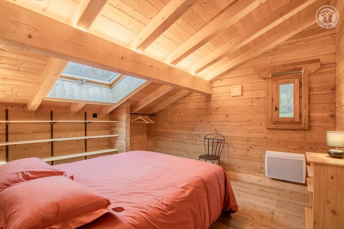 Individuelles Holzchalet auf 2 Ebenen. Erdgeschoss: zum Wohnzimmer offene Küche, TV, Badezimmer (ebenerdige Dusche) mit elektrischem Handtuchtrockner, separates WC. 1. Etage: 3 Schlafzimmer: ein Schlafzimmer im Zwischengeschoss (1 Einzelbett 90 x 190 cm), 1 Schlafzimmer (1 Doppelbett 160 x 200 cm), 1 Schlafzimmer (1 Doppelbett 160 x 200), umschaltbare Klimaanlage. Privater Parkplatz für mehrere Fahrzeuge vor der Unterkunft. Bettwäsche und Handtücher inklusive.