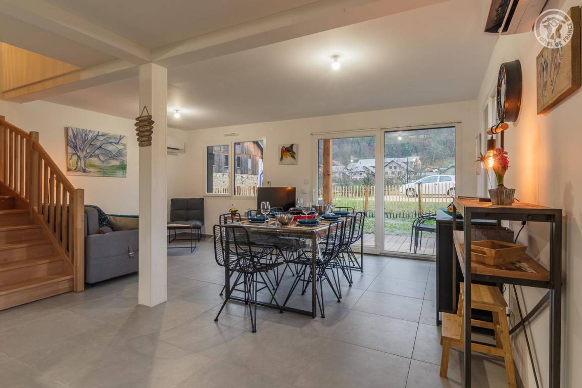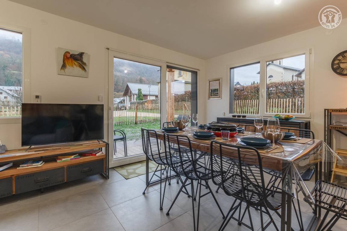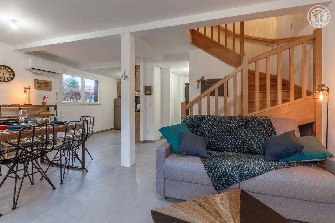 Reihenhaus bestehend aus 2 Gîtes, im Herzen des Dorfes gelegen. Moderner und warmer Stil, schönes Licht im Wohnzimmer durch die Erkerfenster. Hochwertige Ausrüstung und Dienstleistungen. Individueller Fahrradraum mit Platz für 6 Fahrräder. Geschäfte und Dienstleistungen, Supermarkt und Tankstelle in Montmélian (9,5 km).