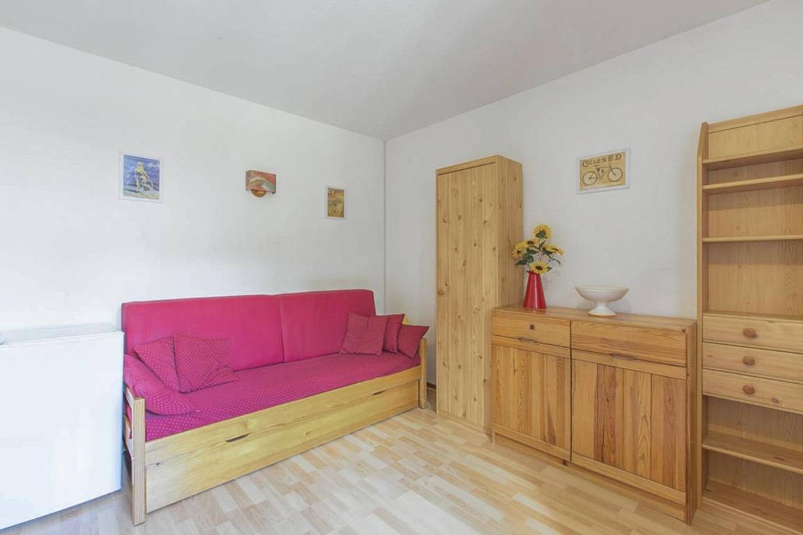 Fläche von ungefähr 23 m². 3te Etage. Orientierung : Nord. Wohnzimmer mit Ausziehschlafcouch für 2 Personen. Schlafzimmer mit 2 Stockbetten. Küche mit Fonduegerät, Raclettegerät, Kaffeemaschine, kleiner Backofen mit Mikrowellenfunktion, Geschirrspülmaschine, Mikrowellenherd, 2 Glaskeramikkochfelder, Kühlschrank. Badezimmer mit Badewanne, WC. Balkon. Die oberen Betten sind nicht für Kinder unter 6 Jahren geeignet.