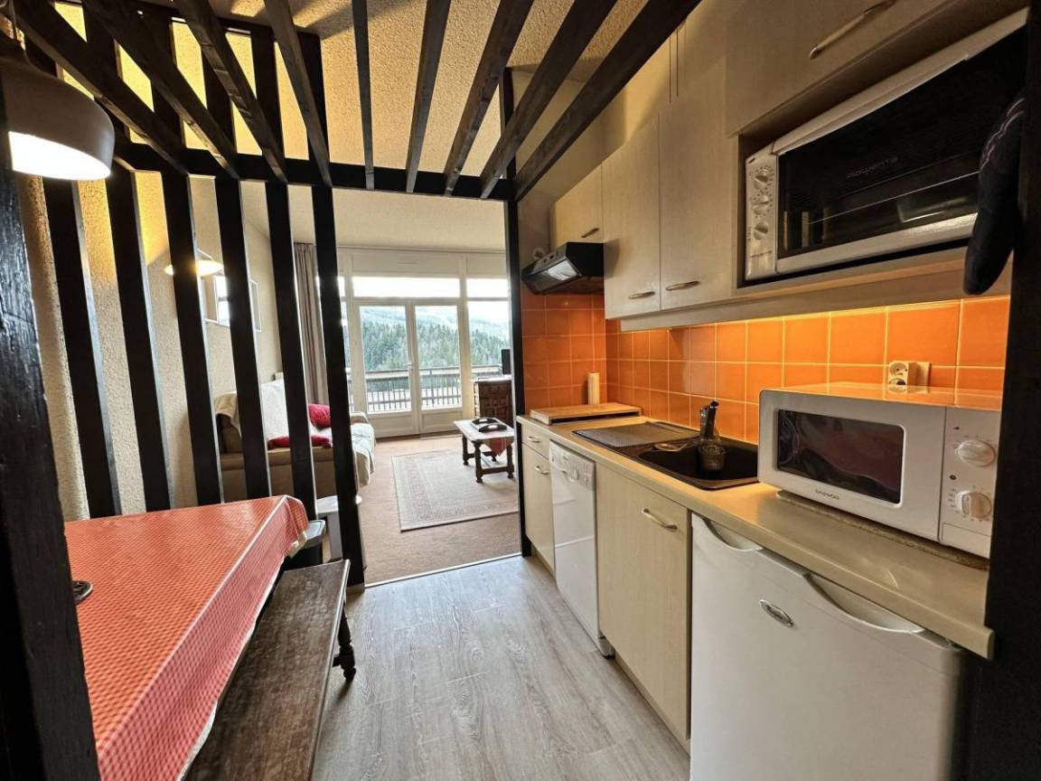 Fläche von ungefähr 31 m². Erdgeschoss. Orientierung : Süd. Blick berg. Wohnzimmer mit Klappschlafcouch (160). offener Schlafbereich mit 2 Stockbetten. Kochnische mit , Fonduegerät, Raclettegerät, 2 Kaffeemaschinen (à filtre et Dolce Gusto), Backofen, Geschirrspülmaschine, Mikrowellenherd, 2 Glaskeramikkochfelder, Kühlschrank. Badezimmer mit Badewanne, Waschmaschine. separates WC. Terrasse. Die oberen Betten sind nicht für Kinder unter 6 Jahren geeignet.