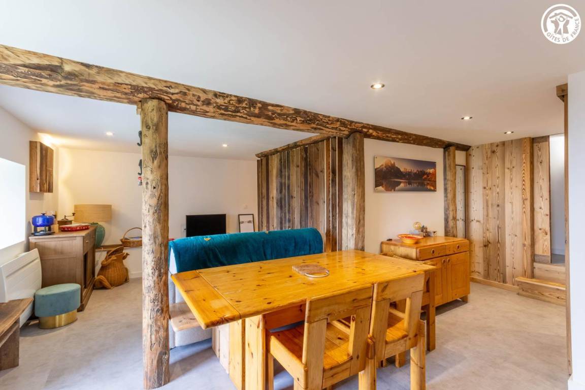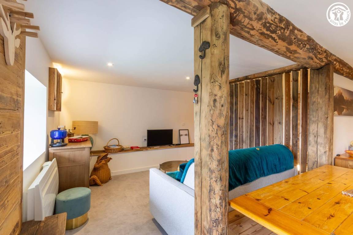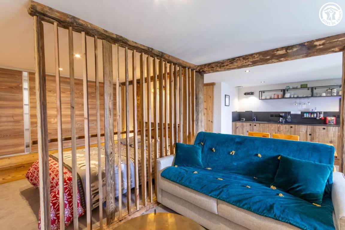 Alpenchalet im Erdgeschoss. Zugang über eine Treppe. Wohnzimmer - Küche (1 Schlafsofa 140x190 cm), 1 halboffenes Schlafzimmer (1 Doppelbett 140x190 cm). Badezimmer (Dusche), separates WC. Shuttlebus 1 km entfernt.