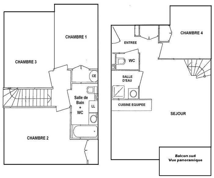 Fläche von ungefähr 120 m². Einige als Maisonette. 3te Etage. Orientierung : Süd. Niveau 0 : Wohnzimmer. Schlafzimmer mit Doppelbett (140). Kochnische mit , Raclettegerät, Wasserkocher, Kaffeemaschine (italienne), Backofen, Geschirrspülmaschine, Mikrowellenherd. Badezimmer mit Dusche. separates WC. Niveau 1 : Schlafzimmer mit 2 zwei Einzelbetten (90). Schlafzimmer mit Doppelbett (160). Schlafzimmer mit Klappschlafcouch, 2 zwei Einzelbetten (90). Badezimmer mit Badewanne, WC.