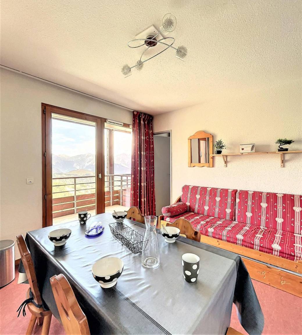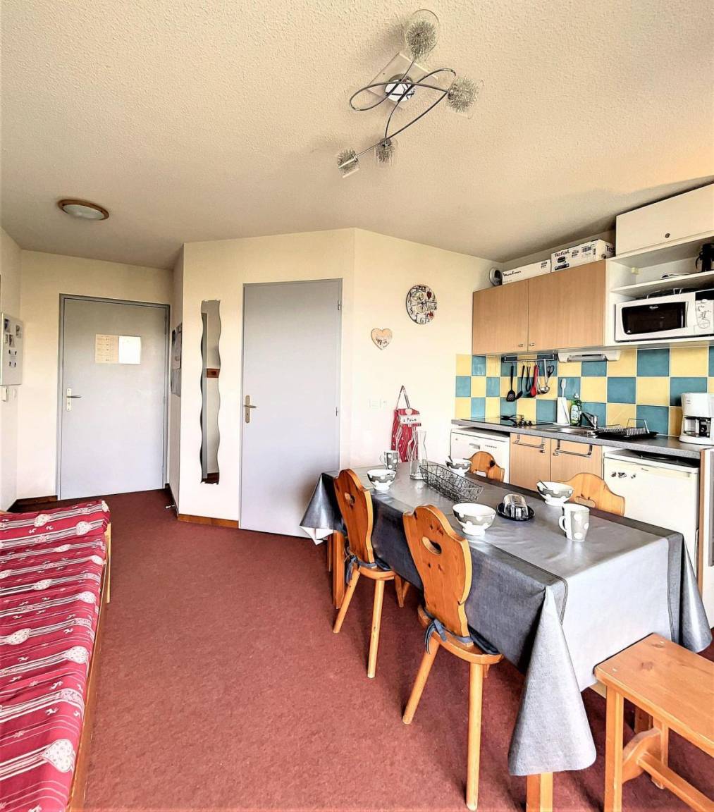 Die Residenz Les Pistes mit Aufzug befindet sich im Ferienort Corbier in einer ruhigen Gegend und ist in mehrere Gebäude unterteilt. Wanderwege befinden sich in unmittelbarer Nähe. Die Geschäfte und Dienstleistungen des Ferienorts sind ebenfalls nur wenige Dutzend Meter entfernt. Fläche von ungefähr 36 m². 5te Etage. Orientierung : Nord, Ost. Blick tal. Wohnzimmer mit Balkon, Ausziehschlafcouch für 2 Personen (90*190), Flachbildfernseher. Alkoven mit 2 zwei Einzelbetten (90*190), Schrank. Schlafzimmer mit 2 Stockbetten. Kochnische mit Raclettegerät, Kaffeemaschine (à filtres et nespresso), kleiner Backofen mit Mikrowellenfunktion, Geschirrspülmaschine, Mikrowellenherd, 2 Glaskeramikkochfelder, Kühlschrank. Badezimmer mit Handtuchtrockner, WC. Die oberen Betten sind nicht für Kinder unter 6 Jahren geeignet.