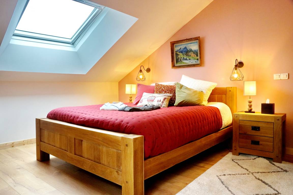 Einfamilienhaus auf 3 Ebenen. Erdgeschoss (ebener Zugang vom Parkplatz): Eingang mit Skiraum und Schuhtrockner, Sauna (4/5 Plätze) und Dusche. Erdgeschoss (Zugang von der Straße): Eingang, separates WC, Wohnzimmer-Küchen-Loungebereich mit Kamin (angeschlossene Stereoanlage, 4G-Boxenanschluss) mit Ausgang auf eine geschützte Terrasse, 1 Schlafzimmer (1 Schlafsofa für 2 Personen 140x190 cm) mit privates Badezimmer (Dusche und WC) mit Zugang über Innentreppe zum Wellnessbereich. Auf halber Ebene: Diele, Wohnzimmer mit Dachschräge (Home Cinema TV, Connected TV mit kostenlosem Zugang zu Netflix, BluRay DVD). 1. Stock: 3 Schlafzimmer mit Dachschrägen (2 Einzelbetten 90x200 cm / 2 Doppelbetten 160x200 cm), 1 Schlafzimmer (1 Doppelbett 180x200 cm) und eigenem Badezimmer (ebenerdige Dusche und geschlossenes WC), Badezimmer (Dusche und WC) . Gesamtwohnfläche: 225 m² Dachgeschoss inklusive. Grundstück 1 ha. 120 m² Terrasse mit Whirlpool (4 Plätze). Parkplatz vor der Hütte für 2 Autos.