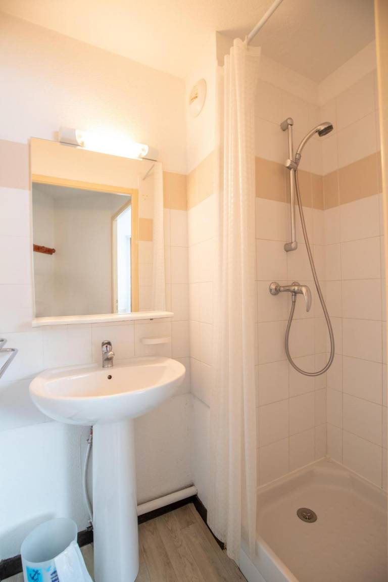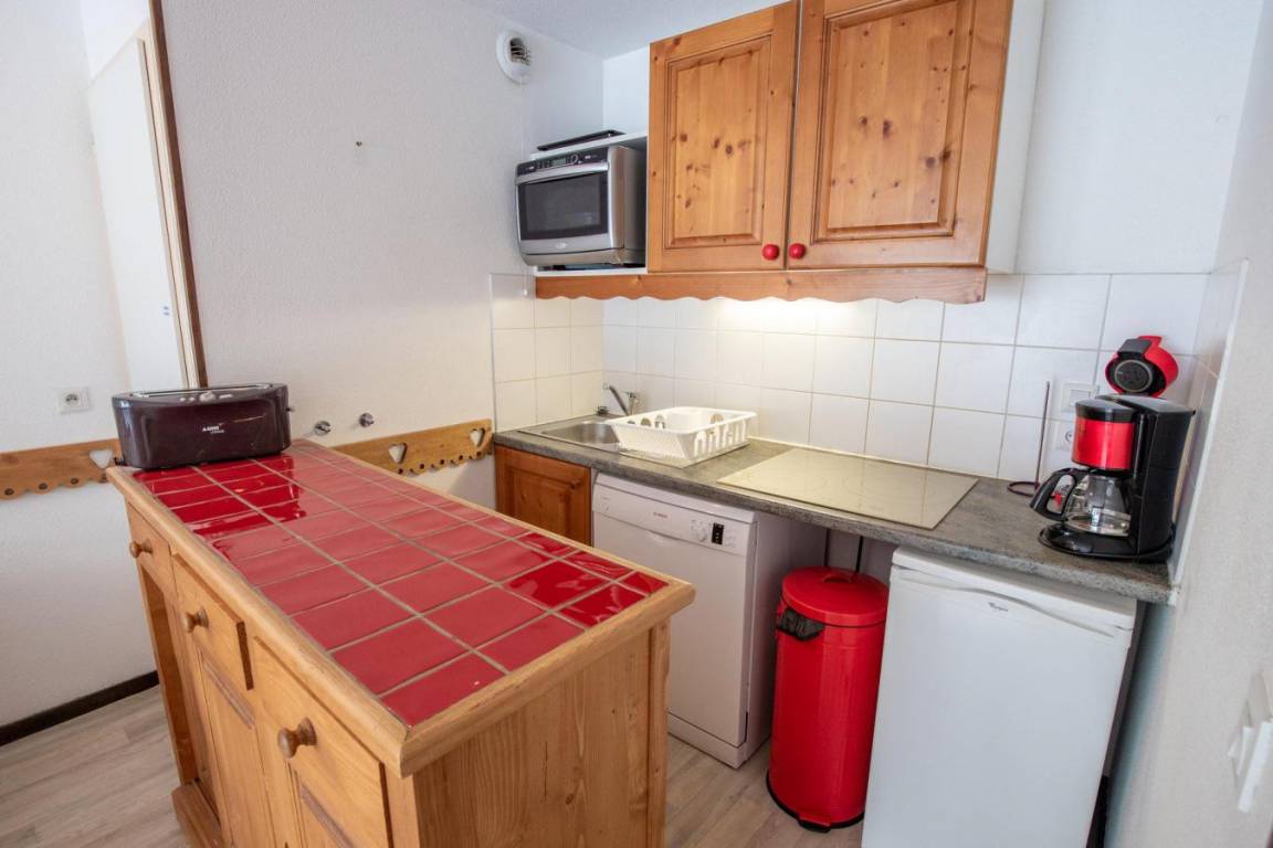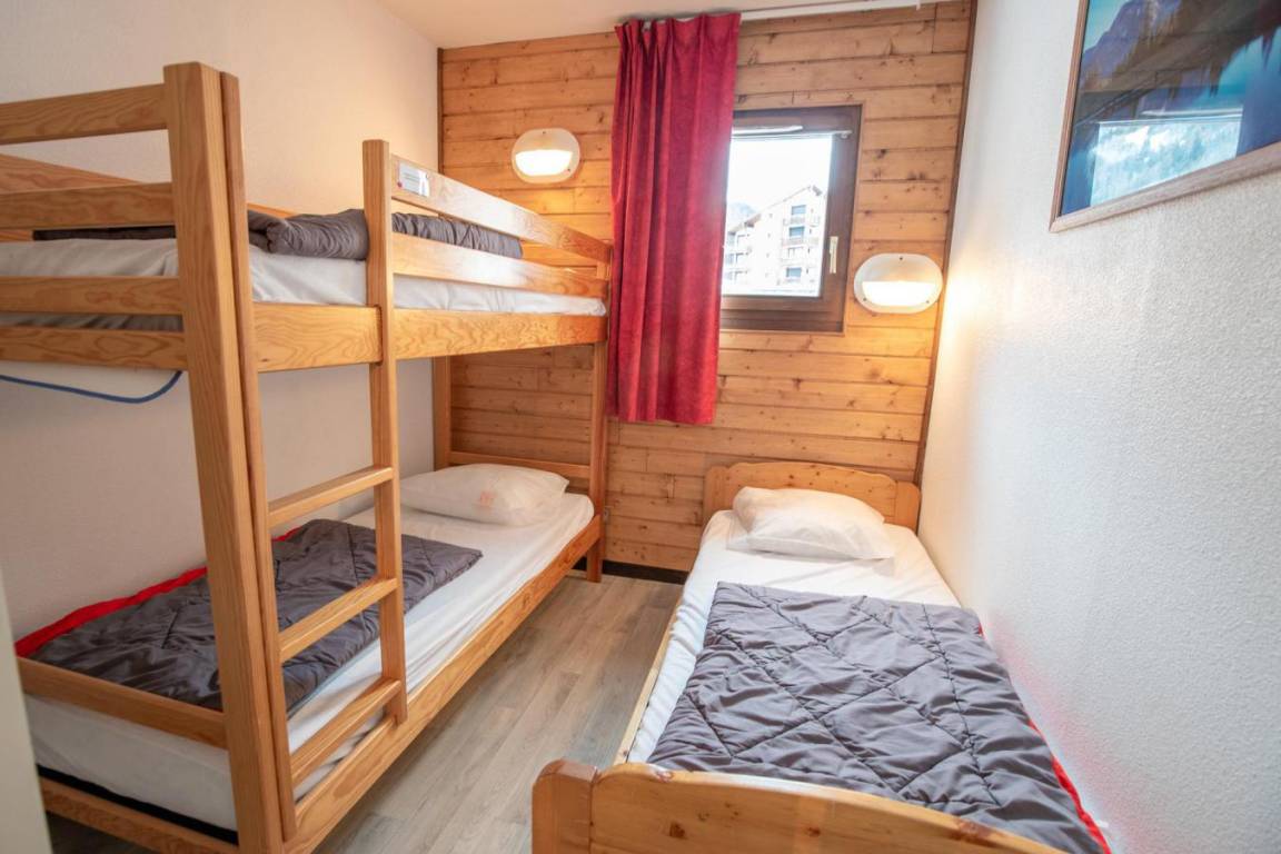 Fläche von ungefähr 45 m². Erdgeschoss. Orientierung : Nord, Ost, Süd, West. Wohnzimmer mit Ausziehschlafcouch für 2 Personen. Schlafzimmer mit Doppelbett. Schlafzimmer mit Einzelbett, 2 Stockbetten. Kochnische mit kleiner Backofen mit Mikrowellenfunktion, Geschirrspülmaschine, 2 Induktionsherdplatten, Kühlschrank. Badezimmer mit Badewanne. Waschräume mit Dusche. separates WC. Terrasse. Die oberen Betten sind nicht für Kinder unter 6 Jahren geeignet.