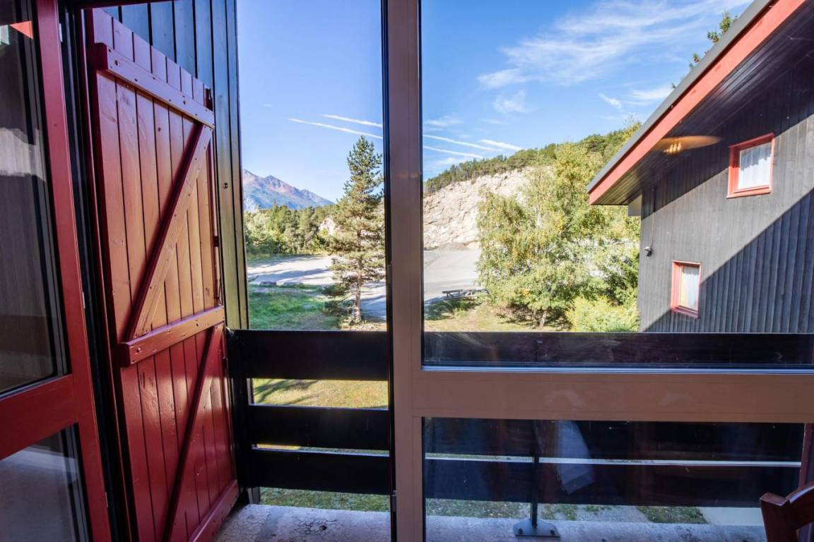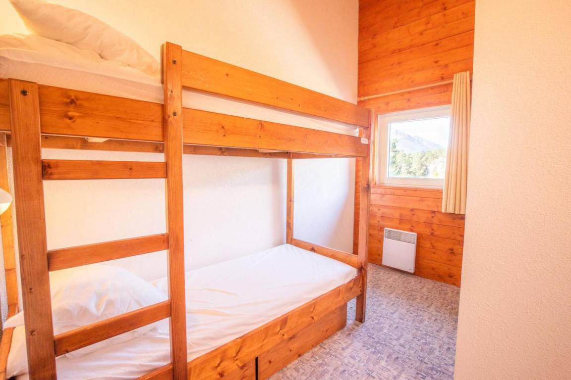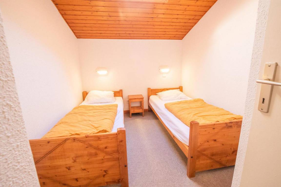 Fläche von ungefähr 54 m². 2te Etage. Orientierung : West. Niveau 0 : Wohnzimmer. Schlafzimmer mit Ausziehschlafcouch für 2 Personen. Küche mit kleiner Backofen mit Mikrowellenfunktion, Geschirrspülmaschine, elektronische Herdplatten, 2 Kühlschränke. Badezimmer mit Badewanne. separates WC. Balkon. Niveau 1 : Zwischengeschoss mit 2 Stockbetten. 2 Schlafzimmer mit 2 Einzelbetten. separates WC. Waschräume mit Dusche. Die oberen Betten sind nicht für Kinder unter 6 Jahren geeignet.