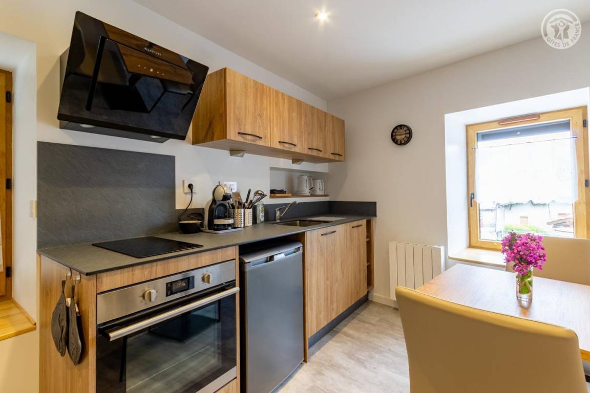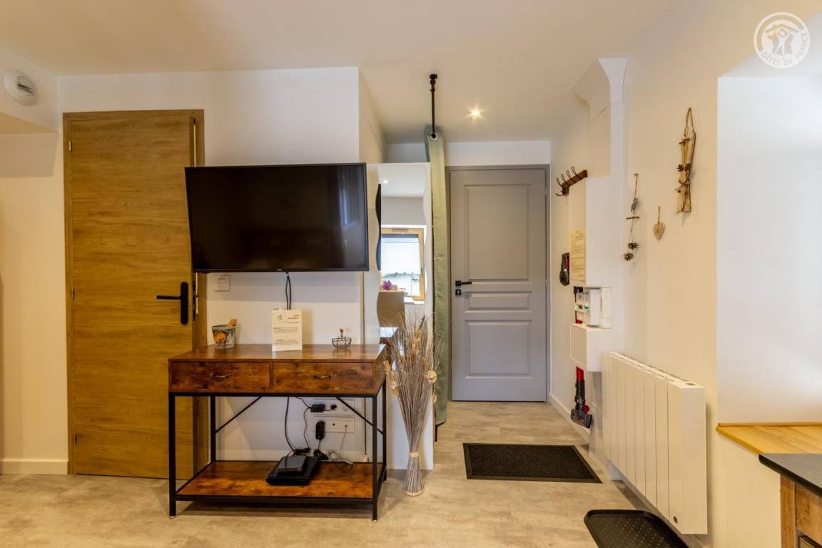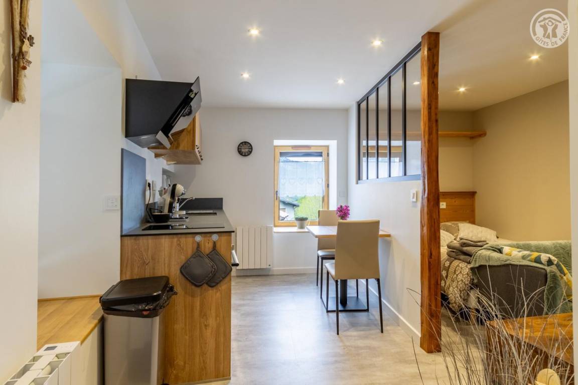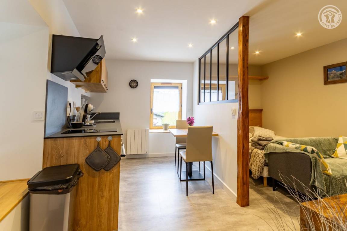 Studio im Erdgeschoss (Zugang über 4 Stufen) eines Dorfhauses mit 2 weiteren ganzjährig vermieteten Wohnungen. Eingang mit Ankleidezimmer, ausgestattete Küche, durch eine Glastrennwand getrennter Schlafbereich (1 Doppelbett 190X190). 2-Sitzer-Sofa. Angeschlossener Fernseher. Bettwäsche inklusive und Betten bei Ankunft bezogen.