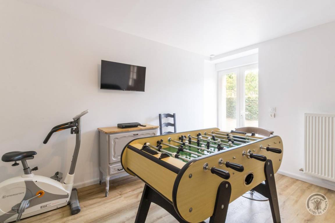 Freistehendes Haus. Wohnzimmer mit Kaminofen (TV, WLAN). Küche (Backofen, Induktionskochfeld, Kühlschrank mit Gefrierfach, Geschirrspüler, Mikrowelle, Senseo-Kaffeemaschine und Filterkaffeemaschine), Duschbad, separates WC, Spielzimmer mit Tischfußball, Heimtrainer und Schlafsofa (Waschmaschine, Wäschetrockner). Obergeschoss: Schlafzimmer 1 (zwei Einzelbetten à 80 x 200 cm, die zusammengestellt werden können) mit TV und Schreibtisch, Schlafzimmer 2 (ein Doppelbett à 140 x 200 cm) mit TV, Schlafzimmer 3 (Doppelbett à 140 x 190 cm) mit TV, Duschbad, separates WC, Schlafzimmer 4 (zwei Einzelbetten à 80 x 200 cm, die zusammengestellt werden können) mit TV. Babyausstattung vorhanden. Bettwäsche und Handtücher werden gestellt. Die Betten sind bei Ankunft bezogen. Reinigungsservice inklusive. Gaszentralheizung inklusive. Alle Nebenkosten inklusive. Privater, umzäunter Garten. Privater Innenhof. Markise. Sonnenliegen. Grill. Abgeschlossene Garage (Tischtennisplatte). Schaukel. Parkplatz.